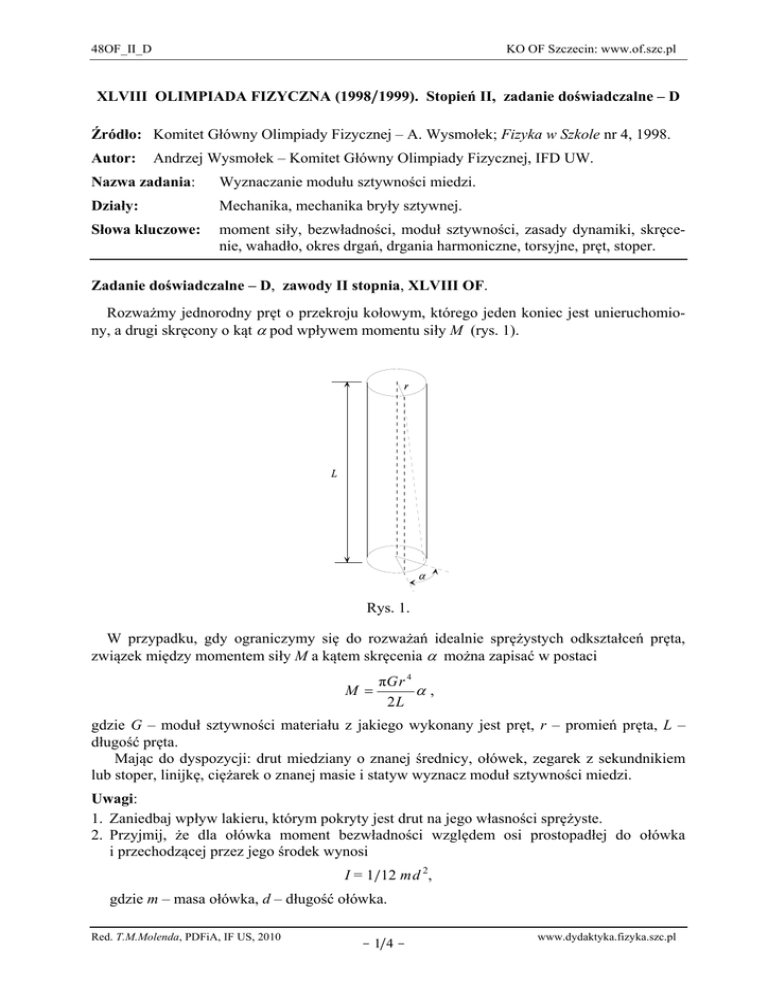 48OF_II_D KO OF Szczecin: www.of.szc.pl XLVIII OLIMPIADA FIZYCZNA (1998/1999). Stopień II, zadanie doświadczalne – D Źródło: Komitet Główny Olimpiady Fizycznej – A. Wysmołek; Fizyka w Szkole nr 4, 1998. Autor: Andrzej Wysmołek – Komitet Główny Olimpiady Fizycznej, IFD UW. Nazwa zadania: Wyznaczanie modułu sztywności miedzi. Działy: Mechanika, mechanika bryły sztywnej. Słowa kluczowe: moment siły, bezwładności, moduł sztywności, zasady dynamiki, skręcenie, wahadło, okres drgań, drgania harmoniczne, torsyjne, pręt, stoper. Zadanie doświadczalne – D, zawody II stopnia, XLVIII OF. Rozważmy jednorodny pręt o przekroju kołowym, którego jeden koniec jest unieruchomiony, a drugi skręcony o kąt α pod wpływem momentu siły M (rys. 1). Rys. 1. W przypadku, gdy ograniczymy się do rozważań idealnie sprężystych odkształceń pręta, związek między momentem siły M a kątem skręcenia α można zapisać w postaci M = πG r 4 α, 2L gdzie G – moduł sztywności materiału z jakiego wykonany jest pręt, r – promień pręta, L – długość pręta. Mając do dyspozycji: drut miedziany o znanej średnicy, ołówek, zegarek z sekundnikiem lub stoper, linijkę, ciężarek o znanej masie i statyw wyznacz moduł sztywności miedzi. Uwagi: 1. Zaniedbaj wpływ lakieru, którym pokryty jest drut na jego własności sprężyste. 2. Przyjmij, że dla ołówka moment bezwładności względem osi prostopadłej do ołówka i przechodzącej przez jego środek wynosi I = 1/12 md 2, gdzie m – masa ołówka, d – długość ołówka. Red. T.M.Molenda, PDFiA, IF US, 2010 - 1/4 - www.dydaktyka.fizyka.szc.pl 48OF_II_D KO OF Szczecin: www.of.szc.pl Rozwiązanie Część teoretyczna Zadanie można rozwiązać mierząc okres drgań torsyjnych ołówka zawieszonego na drucie miedzianym (rys.2). Rys. 2. Korzystając z drugiej zasady dynamiki dla ruchu obrotowego dostajemy równanie: πG r 2 d 2α = − α 2L dt 2 Opisuje ono drgania harmoniczne o okresie I T = 2π 2I L 8π I L , = 4 πG r Gr 4 (1) (2) gdzie I – moment bezwładności ołówka, L – długość drutu, r – promień drutu, G – moduł sztywności miedzi. Po wyrażeniu momentu bezwładności ołówka przez jego masę i długość, z przekształcenia wyrażenia (2) dostajemy: 2 π md 2 L G= (3) 3 r4 T 2 Średnica drutu miedzianego jest znana i w przypadku doświadczeń wykonanych przez recenzenta wynosiła 2r = (0,12 ± 0,01) mm, długość drutu oraz długość ołówka można zmierzyć linijką, a okres drgań stoperem. W celu obliczenia modułu sztywności G trzeba jeszcze znać masę ołówka m. Można ją wyznaczyć na różne sposoby, np. budując „wagę” złożoną z ołówka i obciążnika o znanej masie (rys. 3). Zmieniając miejsce zawieszenia ołówka i obciążnika o znanej masie można doprowadzić do zrównoważenia układu przedstawionego na rys. 3. Elementy ołówka odległe o x 1 od punktu zawieszenia równoważą się, zatem ciężar obciążnika równoważony jest przez część ołówka o długości L – 2x 1, której środek masy znajduje się w odległości (d – x 1 + x 1)/2 = d/2 od punktu zawieszenia ołówka. Prowadzi to do równania: d m L − 2 x1 ) − x 2 m0 = 0 , ( 2 d (4) skąd szukana masa ołówka Red. T.M.Molenda, PDFiA, IF US, 2010 - 2/4 - www.dydaktyka.fizyka.szc.pl 48OF_II_D KO OF Szczecin: www.of.szc.pl m= 2x 2 m . d − 2 x1 0 (5) Rys. 3. Część doświadczalna W doświadczeniu wykonanym przez recenzenta wykorzystano ołówek, którego długość zmierzona linijką wyniosła d = (12,0 ± 0,1) cm. Użyty do pomiarów obciążnik miał masę m0 = (3,00 ± 0,05) g. Żeby zamocować ołówek na statywie, należy wykonać pętelkę z kilku zwojów drutu. Należy to zrobić tak, aby można było ją przesuwać wzdłuż ołówka. Podczas drgań pętelka nie powinna się przesuwać. Pomiary okresu drgań torsyjnych ołówka powtarzano pięciokrotnie dla kilku długości drutu. Przykładowe wyniki zebrano w tabeli i naniesiono na wykres (rys. 4). Tabela Długość drutu L, cm Okres drgań T, s 10,0 ± 0,2 17,0 ± 0,2 26,5 ± 0,2 32 ± 0,2 39,5 ± 0,2 51,0 ± 0,2 4,0 ± 0,1 5,2 ± 0,1 6,8 ± 0,1 7,2± 0,2 7,9 ± 0,1 8,9 ± 0,1 Współczynnik nachylenia prostej przedstawionej na rys. 4 określa średnią wartość wyrażenia (L/T 2 ) śr = (0,63 ± 0,02) cm/s2. Pomiary masy ołówka wykonano kilkakrotnie zawieszając obciążnik w pobliżu jednego z końców ołówka. Na tej podstawie określono masę ołówka m = (3,4 ± 0,1) g. Dla zrównoważenia ciężaru drutu użytego do podwieszenia obciążnika na drugim ramieniu „wagi” można zawiesić taki sam kawałek drutu. Po podstawieniu wartości liczbowych do wzoru (3) uzyskano wartość momentu sztywności miedzi G = 4,9· 1010 N/m2. Dla oszacowania niepewności pomiarowej otrzymanego wyniku można skorzystać ze wzoru na odchylenie standardowe wielkości złożonej: 2 2 2 2 2 ΔG ⎛ Δm ⎞ ⎛ Δd ⎞ ⎛ Δ( L / T ) ⎞ ⎛ Δr ⎞ ⎟⎟ + ⎜ 4 ⎟ = 0,01 9 + 3 + 9 + 1111 = 0,33 = ⎜ ⎟ + ⎜2 ⎟ + ⎜⎜ 2 G ⎝ m ⎠ ⎝ d ⎠ ⎝ L /T ⎠ ⎝ r ⎠ Red. T.M.Molenda, PDFiA, IF US, 2010 - 3/4 - www.dydaktyka.fizyka.szc.pl 48OF_II_D KO OF Szczecin: www.of.szc.pl Wynika z niego, że główny wkład w niepewność pomiarową pochodzi od dokładności wyznaczenia promienia drutu. W przypadku, gdyby promień drutu nie był obarczony niepewnością pomiarową, niepewność pomiarowa wyznaczenia G stanowiłby ok. 5% jego wartości. Ostatecznie G = (4,9 ± 1,5)· 1010 N/m2. Z dokładnością do niepewności pomiarowej jest to wynik zgodny z danymi podawanymi w tablicach fizycznych, które mieszczą się w przedziale (4,0 ÷ 4,8)· 1010 N/m2. 50 40 L, cm 30 20 10 0 0 10 20 30 40 2 T ,s 50 60 70 80 2 Rys. 4. Punktacja Część teoretyczna 1. Powiązanie modułu sztywności z okresem wahadła torsyjnego 2. Metoda wyznaczenia masy ołówka do 4 pkt. do 4 pkt. Część doświadczalna 3. Wyznaczenie wartości L/T 2 (pomiar