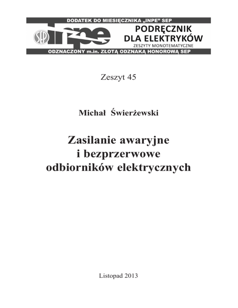 Zeszyt 45 Micha³ Œwier¿ewski Zasilanie awaryjne i bezprzerwowe odbiorników elektrycznych Listopad 2013 PODRÊCZNIK DLA ELEKTRYKÓW praca zbiorowa pod redakcj¹ Jana Strojnego Zeszyt 45 Zasilanie awaryjne i bezprzerwowe odbiorników elektrycznych Autor: Micha³ Œwier¿ewski Recenzent: Tomasz Radziewicz Tekst dostarczono w listopadzie 2013 r. Od Wydawcy Wiele obiektów technicznych wymaga uk³adów zasilaj¹cych o zwiêkszonej lub gwarantowanej pewnoœci dostawy energii elektrycznej. Nale¿y tu zaliczyæ np. banki, centra przetwarzania danych i informacji, policjê, stra¿ po¿arn¹, obiekty ³¹cznoœci, obiekty wojskowe itp. Niejednokrotnie zastosowanie zasilania dwustronnego jest niewystarczaj¹ce i konieczne s¹ dodatkowe Ÿród³a energii w postaci np. zespo³u pr¹dotwórczego. Zespo³y pr¹dotwórcze spalinowo-elektryczne s³u¿¹ do sta³ego lub tymczasowego zasilania instalacji i odbiorów. Mog¹ te¿ byæ Ÿród³em zasilania rezerwowego, uruchamianym w razie niesprawnoœci zasilania podstawowego. W zale¿noœci od przeznaczenia zespo³u, jego budowy i trybu pracy oraz warunków œrodowiskowych, ró¿ne s¹ wymagania odnoœnie wykonania zasilanej instalacji. Podstawowym warunkiem poprawnoœci dzia³ania i wspó³pracy z sieci¹ jest tu zachowanie wymagañ zasad ochrony przeciwpora¿eniowej przy zasilaniu z rezerwowego lub dodatkowego Ÿród³a energii. Dlatego zalecamy Cczytelnikom niniejszego zeszytu równoczesne zapoznanie siê z artyku³em dr in¿. Edwarda Musia³a zamieszczonym w towarzysz¹cym zeszytowi numerze miesiêcznika INPE nr 170/171 (str. 3-31) i poœwiêconym ochronie przed pora¿eniem w instalacjach zasilania z zespo³ów pr¹dotwórczych z uwzglêdnieniem aktualnego stanu wiedzy technicznej i wymagañ normalizacyjnych. Wydawnictwo dotowane przez Ministerstwo Nauki i Szkolnictwa Wy¿szego © Copyright by: COSiW SEP – Zak³ad Wydawniczy „INPE” w Be³chatowie Utwór w ca³oœci ani we fragmentach nie mo¿e byæ powielany, ani rozpowszechniany za pomoc¹ urz¹dzeñ elektronicznych, mechanicznych, kopiuj¹cych, nagrywaj¹cych i innych bez pisemnej zgody posiadacza praw autorskich. Miesiêcznik INPE – Informacje o Normach i Przepisach Elektrycznych Rok wyd. XVI Podrêcznik INPE dla Elektryków – Zeszyty monotematyczne (bezp³atny dodatek dla prenumeratorów miesiêcznika) ISSN 1234-0081 Wydawca i Redakcja: SEP – COSiW w Warszawie, Zak³ad Wydawniczy „INPE” w Be³chatowie, ul. Czapliniecka 44, 97-400 Be³chatów, tel. 44 633 33 55, fax 44 635 02 02, www.redinpe.com, e-mail: [email protected] Adres dla korespondencji: ul. Kalinowa 5, 97-400 Be³chatów Kierownik ZW – Redaktor Naczelny: Tadeusz Malinowski tel. 44 632 32 61, kom. 785 028 557 Z-ca Redaktora Naczelnego: Jan Strojny tel. 695 899 729 Biuro i Ksiêgowoœæ: Ma³gorzata Filipiak, tel. 44 633 33 55, kom. 783 976 966 Sk³ad komputerowy: KON Tekst Kraków, www.kon-tekst.pl Druk: Leyko Kraków 2 Nak³ad: do 5500 egz. Podręcznik SPIS TREŒCI 1. Wstêp 2. Pojêcia i definicje u¿yte w opracowaniu 3. Jakoœæ energii elektrycznej 4. 7 9 12 3.1. Czêstotliwoœæ napiêcia zasilaj¹cego 12 3.2. Napiêcie zasilaj¹ce 13 3.3. Harmoniczne napiêcia 15 3.3.1. Moce i inne dane przebiegów odkszta³conych 16 3.3.2. Skutki odkszta³ceñ napiêcia 18 3.4. Wymagania przepisów w zakresie jakoœci energii 19 3.5. Realizacja standardów jakoœci energii 22 •ród³a zasilania rezerwowego 24 4.1. Sieæ elektroenergetyczna 24 4.2. Zespo³y pr¹dotwórcze 27 4.2.1. Wprowadzenie 27 4.2.2. Przeznaczenie zespo³ów pr¹dotwórczych 28 4.2.3. Podzia³ zespo³ów pr¹dotwórczych 28 4.2.4. Parametry podstawowe i charakterystyki 30 4.2.5. Pr¹dnice 31 4.2.6. Moce zespo³ów pr¹dotwórczych 32 4.2.7. Rozruchy zespo³ów pr¹dotwórczych 34 4.2.8. Pr¹d zwarciowy 38 4.2.9. Sterowanie parametrami zespo³ów pr¹dotwórczych 39 4.2.10. Sposoby u¿ytkowania zespo³ów pr¹dotwórczych 41 4.2.11. Dobór zespo³ów pr¹dotwórczych 41 4.2.12. Moc zespo³ów pr¹dotwórczych do zasilania odbiorników nieliniowych 47 4.2.13. Samoczynne za³¹czanie rezerwy 48 4,2,14. Zasilanie awaryjne z zespo³ów pr¹dotwórczych 49 4.2.15. Eksploatacja zespo³ów pr¹dotwórczych 55 4.3. Zasilacze pr¹du sta³ego 56 4.3.1. Prostowniki 57 4.3.2. Przetwornice DC/DC 62 4.3.3. Filtracja napiêcia wyprostowanego 64 Zeszyt 45 3 4.3.4. Stabilizacja napiêcia 64 4.3.5. Funkcje zabezpieczaj¹ce 66 4.3.6. Zasilacze modu³owe 67 4.3.7. Wspó³praca zasilaczy pr¹du sta³ego 68 4.3.8. Warunki monta¿u i eksploatacji 68 4.4. Zasilacze UPS 69 4.4.1. Zasilacze UPS typu VFD (off-line) 71 4.4.2. Zasilacze UPS typu VI (line-interactiv) 72 4.4.3. Zasilacze UPS typu VFI (true- on line) 75 4.4.4. Zasilacze UPS z regulowan¹ amplitud¹ i czêstotliwoœci¹ napiêcia wyjœciowego 77 4.4.5. Zasilacze UPS transformatorowe 78 4.4.6. Wspó³czynnik szczytu (Crest-factor) 78 4.4.7. Pr¹d zwarcia UPS 78 4.4.8. Technologia IGBT 79 4.4.9. Uk³ady zasilania bezprzerwowego z UPS 80 4.4.10. Niezawodnoœæ zasilaczy UPS 84 4.4.11. Eliminacja wy¿szych harmonicznych 85 5. Wspó³praca zespo³ów pr¹dotwórczych z zasilaczami UPS 88 6. Baterie akumulatorów 92 6.1. Cykle pracy akumulatorów 92 6.2. Cechy u¿ytkowe i parametry akumulatorów 95 6.3. Dobór pojemnoœci akumulatorów do zasilaczy UPS 98 6.4. Instalowanie akumulatorów 7. 4 98 6.5. Wp³yw temperatury zewnêtrznej 100 6.6. Wymagania eksploatacyjne 101 6.7. Inne technologie akumulatorów 102 Ogniwa paliwowe 104 Literatura 108 Podręcznik Zasilanie awaryjne i bezprzerwowe odbiorników elektrycznych STRESZCZENIE Opracowanie dotyczy zagadnieñ jakoœci i pewnoœci zasilania odbiorników elektrycznych i elektronicznych, zw³aszcza urz¹dzeñ szczególnie wra¿liwych na zanik napiêcia zasilaj¹cego. Omówiono w szczególnoœci Ÿród³a zasilania rezerwowego i bezprzerwowego – z sieci elektroenergetycznej, z zespo³ów pr¹dotwórczych, z zasilaczy pr¹du sta³ego i zasilaczy UPS. W pierwszym rozdziale omówiono zag