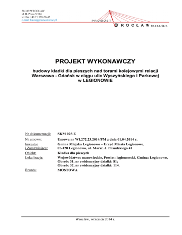 PROJEKT WYKONAWCZY budowy kładki dla pieszych nad torami kolejowymi relacji Warszawa - Gdańsk w ciągu ulic Wyszyńskiego i Parkowej w LEGIONOWIE Nr dokumentacji: SKM 025-E Nr umowy: Inwestor i Zamawiający: Obiekt: Lokalizacja: Umowa nr WI.272.23.2014/PM z dnia 01.04.2014 r. Gmina Miejska Legionowo – Urząd Miasta Legionowo, 05-120 Legionowo, ul. Marsz. J. Piłsudskiego 41 Kładka dla pieszych Województwo: mazowieckie, Powiat: legionowski, Gmina: Legionowo, Obręb: 31, nr ewidencyjny działki: 81; Obręb: 32, nr ewidencyjny działki: 114. MOSTOWA Branża: Wrocław, wrzesień 2014 r. strona 2 PROJEKT WYKONAWCZY budowy kładki dla pieszych nad torami kolejowymi relacji Warszawa - Gdańsk w ciągu ulic Wyszyńskiego i Parkowej w LEGIONOWIE ZESPÓŁ PROJEKTOWY I SPRAWDZAJĄCY Opracowali: Imię i nazwisko Nr i zakres uprawnień mgr inż. Edmund Budka 305/98/UW specj. konstr.-bud. bez ograniczeń do projektowania i kierowania robotami bud. Sprawdzający (branża mostowa) dr hab. inż. Wojciech Lorenc 63/DOŚ/05 projektowe b/o w spec. mostowej Projektant (branża mostowa) mgr inż. Dariusz Śmiertka OPL/0926/PWOM/13 do projektowania i kierowania robotami bud. bez ograniczeń w specj. mostowej Projektant (branża mostowa) mgr inż. Szymon Gruba 119/DOŚ/09 projektowe b/o w specj. mostowej inż. Mirosław Grzywna 259/DOŚ/05 w spec. inst. w zakr. sieci, inst., i urządzeń elektr. i elektroenerg. do projektowania bez ograniczeń Projektant (główny projektant) (branża mostowa) Projektant (branża elektrotrakcyjna) Asystent Projektanta (branża mostowa) mgr inż. Paweł Dorada ________________ Asystent Projektanta (branża mostowa) mgr inż. Mariusz Izdebski ________________ Asystent Projektanta (branża mostowa) mgr inż. Grzegorz Śledziński ________________ Podpis strona 3 PROJEKT WYKONAWCZY budowy kładki dla pieszych nad torami kolejowymi relacji Warszawa - Gdańsk w ciągu ulic Wyszyńskiego i Parkowej w LEGIONOWIE SPIS TREŚCI 1. 2. 3. PRZEDMIOT, CEL I ZAKRES OPRACOWANIA ........................................................................................ 5 PODSTAWY OPRACOWANIA ........................................................................................................................ 7 INFORMACJA DOTYCZĄCA PLANU BEZPIECZEŃSTWA I OCHRONY ZDROWIA .................... 10 3.1. 3.2. 3.3. 3.4. 3.5. 3.6. 4. ZAKRES ROBÓT .................................................................................................................................................................. 10 WYKAZ ISTNIEJĄCYCH OBIEKTÓW BUDOWLANYCH ............................................................................................................ 10 ELEMENTY ZAGOSPODAROWANIA TERENU, KTÓRE MOGĄ STWARZAĆ ZAGROŻENIE BEZPIECZEŃSTWA I ZDROWIA LUDZI ...... 10 PRZEWIDYWANE ZAGROŻENIA PODCZAS ROBÓT ................................................................................................................. 11 SPOSÓB PROWADZENIA INSTRUKTAŻU PRACOWNIKÓW ....................................................................................................... 12 TECHNICZNE I ORGANIZACYJNE ŚRODKI ZARADCZE ............................................................................................................ 12 OPIS TECHNICZNY ........................................................................................................................................ 14 4.1. 4.2. 4.3. 4.4. ZAŁOŻENIA PROJEKTOWE................................................................................................................................................... 14 PODŁOŻE GRUNTOWE ......................................................................................................................................................... 15 PRACE PRZYGOTOWAWCZE ................................................................................................................................................ 18 BUDOWA KŁADKI DLA PIESZYCH WRAZ Z DOJŚCIAMI .......................................................................................................... 18 4.4.1.Dane ogólne .................................................................................................................................................................. 18 4.4.2.Ustrój nośny .................................................................................................................................................................. 19 4.4.3.Pomost kładki ................................................................................................................................................................ 21 4.4.3.1.Podłużnice stalowe ..................................................................................................................................................... 21 4.4.3.2.Podkładki elastomerowe ............................................................................................................................................. 21 4.4.3.3.Panele kompozytowe pełne ......................................................................................................................................... 21 4.4.3.4.Profile zamykające ..................................................................................................................................................... 22 4.4.3.5.Żywica epoksydowa do łączenia paneli ...................................................................................................................... 22 4.4.3.6.Śruby do łączenia paneli............................................................................................................................................. 22 4.4.3.7.Maty szklane ............................................................................................................................................................... 22 4.4.3.8.Uchwyty mocujące panele do podłużnic ...................