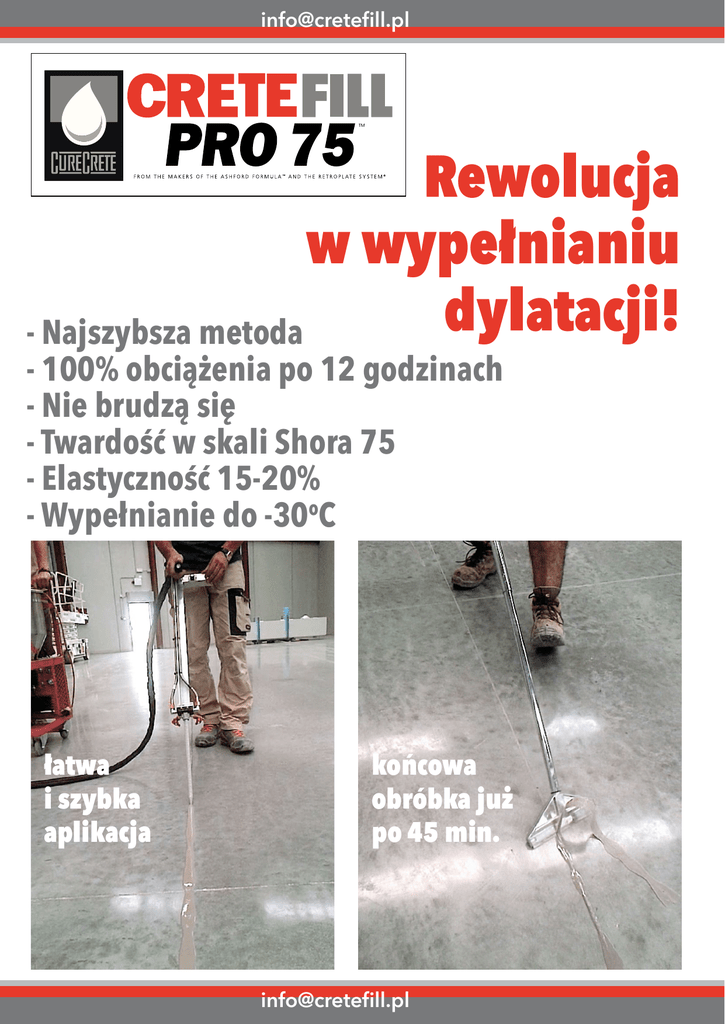 [email protected] Rewolucja w wypełnianiu dylatacji! - Najszybsza metoda - 100% obciążenia po 12 godzinach - Nie brudzą się - Twardość w skali Shora 75 - Elastyczność 15-20% - Wypełnianie do -30oC łatwa i szybka aplikacja końcowa obróbka już po 45 min. [email protected]