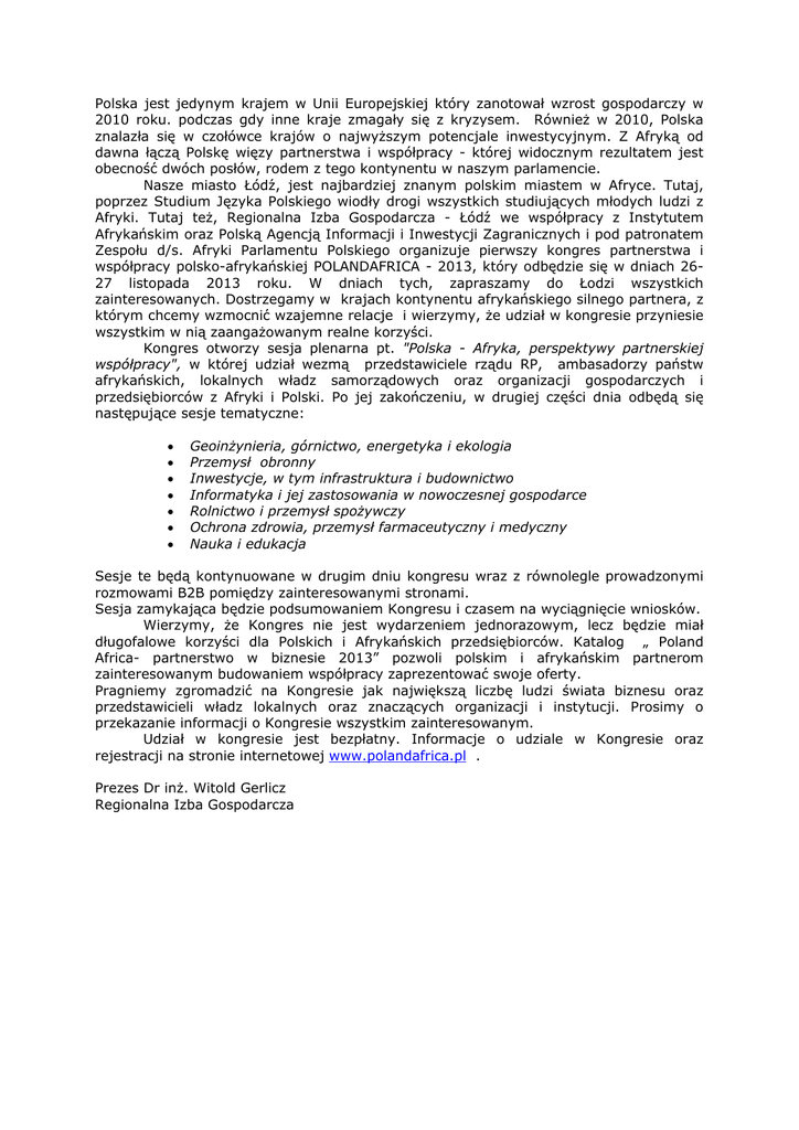 Polska jest jedynym krajem w Unii Europejskiej który zanotował wzrost gospodarczy w 2010 roku. podczas gdy inne kraje zmagały się z kryzysem. Również w 2010, Polska znalazła się w czołówce krajów o najwyższym potencjale inwestycyjnym. Z Afryką od dawna łączą Polskę więzy partnerstwa i współpracy - której widocznym rezultatem jest obecność dwóch posłów, rodem z tego kontynentu w naszym parlamencie. Nasze miasto Łódź, jest najbardziej znanym polskim miastem w Afryce. Tutaj, poprzez Studium Języka Polskiego wiodły drogi wszystkich studiujących młodych ludzi z Afryki. Tutaj też, Regionalna Izba Gospodarcza - Łódź we współpracy z Instytutem Afrykańskim oraz Polską Agencją Informacji i Inwestycji Zagranicznych i pod patronatem Zespołu d/s. Afryki Parlamentu Polskiego organizuje pierwszy kongres partnerstwa i współpracy polsko-afrykańskiej POLANDAFRICA - 2013, który odbędzie się w dniach 2627 listopada 2013 roku. W dniach tych, zapraszamy do Łodzi wszystkich zainteresowanych. Dostrzegamy w krajach kontynentu afrykańskiego silnego partnera, z którym chcemy wzmocnić wzajemne relacje i wierzymy, że udział w kongresie przyniesie wszystkim w nią zaangażowanym realne korzyści. Kongres otworzy sesja plenarna pt. "Polska - Afryka, perspektywy partnerskiej współpracy", w której udział wezmą przedstawiciele rządu RP, ambasadorzy państw afrykańskich, lokalnych władz samorządowych oraz organizacji gospodarczych i przedsiębiorców z Afryki i Polski. Po jej zakończeniu, w drugiej części dnia odbędą się następujące sesje tematyczne: Geoinżynieria, górnictwo, energetyka i ekologia Przemysł obronny Inwestycje, w tym infrastruktura i budownictwo Informatyka i jej zastosowania w nowoczesnej gospodarce Rolnictwo i przemysł spożywczy Ochrona zdrowia, przemysł farmaceutyczny i medyczny Nauka i edukacja Sesje te będą kontynuowane w drugim dniu kongresu wraz z równolegle prowadzonymi rozmowami B2B pomiędzy zainteresowanymi stronami. Sesja zamykająca będzie podsumowaniem Kongresu i czasem na wyciągnięcie wniosków. Wierzymy, że Kongres nie jest wydarzeniem jednorazowym, lecz będzie miał długofalowe korzyści dla Polskich i Afrykańskich przedsiębiorców. Katalog „ Poland Africa- partnerstwo w biznesie 2013” pozwoli polskim i afrykańskim partnerom zainteresowanym budowaniem współpracy zaprezentować swoje oferty. Pragniemy zgromadzić na Kongresie jak największą liczbę ludzi świata biznesu oraz przedstawicieli władz lokalnych oraz znaczących organizacji i instytucji. Prosimy o przekazanie informacji o Kongresie wszystkim zainteresowanym. Udział w kongresie jest bezpłatny. Informacje o udziale w Kongresie oraz rejestracji na stronie internetowej www.polandafrica.pl . Prezes Dr inż. Witold Gerlicz Regionalna Izba Gospodarcza Poland was the only country in the European Union to experience positive economic growth in 2010. Also in 2010, Poland was ranked among top potential investment destinations while other countries in the EU were struggling with crisis. Over the years, we have established close ties of partnership and cooperation between Africa and Poland. The effect of this continuous friendship is the presence of two Members of Parliament of African descent. Our city of Łódź is the most famous Polish city in Africa. The paths of most of the young African people coming to Poland are leading through a famous School of Polish for Foreigners at the University of Łódź. It is here, in the city of Łódź, where the Central Poland Chamber of Commerce , RIG-Łódź, together with The Polish-African Institute and Polish Information and Foreign Investment Agency are organizing the first Congress of partnership and Polish-African cooperation POLANDAFRICA 2013 under the patronage of The Parliamentary Team on Africa, which is due to take place between the 26-27th of November, 2013. We would like to invite to Łódź all those who are interested in the event. We see the countries of the African continent as strong business partners with whom we would like to strengthen bonds of bilateral relations. We believe that all those involved will find this cooperation profitable. The Congress will open with a plenary session: “Poland-Africa, perspectives of bilateral cooperation” featuring the representatives of the Polish Government, the Ambassadors of African countries, the representatives of local self-governing bodies, economic organizations and entrepreneurs from Africa and Poland. On the second day of the Congress, there will be the following thematic sessions: Geo-engineering, energy and ecology Defense industry Investments, including infrastructure and construction industries Information technology and its application in modern economy Food and agriculture industry Health protection, pharmaceutical and medical industries Science and education The above thematic sessions will be continued with bilateral B2B talks between the interested parties. A final session will be the summary of the Congress and the time to draw conclusions. We believe that the Congress is not a one time event, but that it will have long-lasting effects for Polish and African businesses. The catalogue “Poland Africa- Business Partnership 2013” will let Polish and African entrepreneurs interested in strengthening bilateral business cooperation present their offers. We would like to gather a great number of business people, the representatives of local governments and prominent organizations and institutions. We would appreciate passing on this information to all those interested in POLANDAFRICA Congress 2013. The participation in the Congress is free of charge. You will find more information about the Congress and the online registration on our website: www.polandafrica.pl. Dr inż. Witold Gerlicz The Chairman of Central Poland Chamber of Commerce in Lodz