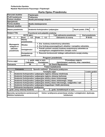 Politechnika Opolska Wydział Wychowania Fizycznego i Fizjoterapii Karta Opisu Przedmiotu Kierunek studiów Profil kształcenia Poziom studiów Specjalność Forma studiów Semestr studiów Fizjoterapia Praktyczny Studia pierwszego stopnia Nazwa przedmiotu Anatomia funkcjonalna i palpacyjna Subject Title Całk. 1 Wymagania wstępne w zakresie przedmiotu Studia niestacjonarne III Nauki podst. (T/N) T Functional and palpable anatomy ECTS (pkt.) Tryb zaliczenia przedmiotu Kod przedmiotu Kont. 0,5 Prakt. 0,3 Zaliczenie na ocenę IF-III-03 Nazwy przedmiotów 1. Zna budowę anatomiczną człowieka. Wiedza 2. Zna funkcję poszczególnych układów i narządów człowieka. 1. Potrafi omówić omówić budowę anatomiczną człowieka ze Umiejętności szczególnym uwzględnieniem narządu ruchu Kompetencje społeczne 1. Rozumie konieczność stałego uaktualniania swojej wiedzy. Program przedmiotu Forma zajęć Ćwiczenia L. godz. zajęć w sem. Prowadzący zajęcia Całkowita Kontaktowa (tytuł/stopień naukowy, imię i nazwisko) dr Dawid Bączkowicz 30 15 | Treści kształcenia Ćwiczenia Lp. 1. 2. 3. 4. 5. 6. 7. Sposób realizacji Ćwiczenia praktyczne Tematyka zajęć Anatomia funkcjonalna i palpacyjna regionu obręczy miedniczej Anatomia funkcjonalna i palpacyjna regionu obręczy barkowej Anatomia funkcjonalna i palpacyjna okolicy stawu kolanowego Anatomia funkcjonalna i palpacyjna okolicy stawu skokowego i stopy Anatomia funkcjonalna i palpacyjna okolicy stawu łokciowego, nadgarstka i ręki Anatomia funkcjonalna i palpacyjna kręgosłupa i klatki piersiowej Zaliczenie teoretyczne i praktyczne L. godz. pracy własnej studenta Sposoby sprawdzenia zamierzonych efektów kształcenia 15 L. godz. kontaktowych w sem. Liczba godzin 2 2 2 2 2 2 3 15 Ustna i praktyczna prezentacja wiedzy i umiejętności, dyskusja, kolokwium Efekty kształcenia dla przedmiotu - po zakończonym cyklu kształcenia Wiedza Umiejętności Kompetencje społeczne 1. KF_W03 zna anatomię funkcjonalną narządu ruchu człowieka 1. KF_U02 potrafi manualnie wskazać poszczególne struktury biernego i czynnego narządu ruchu człowieka 1. KF_K01 rozumie potrzebę stałego uaktualniania swojej wiedzy i podejmuje działania związane z dokształcaniem Metody dydaktyczne: Prelekcja, pokaz, demonstracja, ćwiczenia praktyczne, dyskusja. Konsultacje Forma i warunki zaliczenia przedmiotu: Ćwiczenia: pozytywna średnia z ocen cząstkowych, zaliczenie końcowego kolokwium teoretycznego i praktycznego, aktywność studenta na zajęciach Literatura podstawowa: [1] Jorritsma J. Anatomia na żywym człowieku. Wstęp do terapii manualnej. Elsevier 2004. Literatura uzupełniająca: [1] Tixa S. Atlas anatomii palpacyjnej. Tom I i II. Wydawnictwo Lekarskie PZWL, Warszawa 2008. ______________ * niewłaściwe przekreślić ………………………………………………….. ………………………………………………………. (kierownik jednostki organizacyjnej/bezpośredni przełożony: pieczęć/podpis (Dziekan Wydziału pieczęć/podpis)