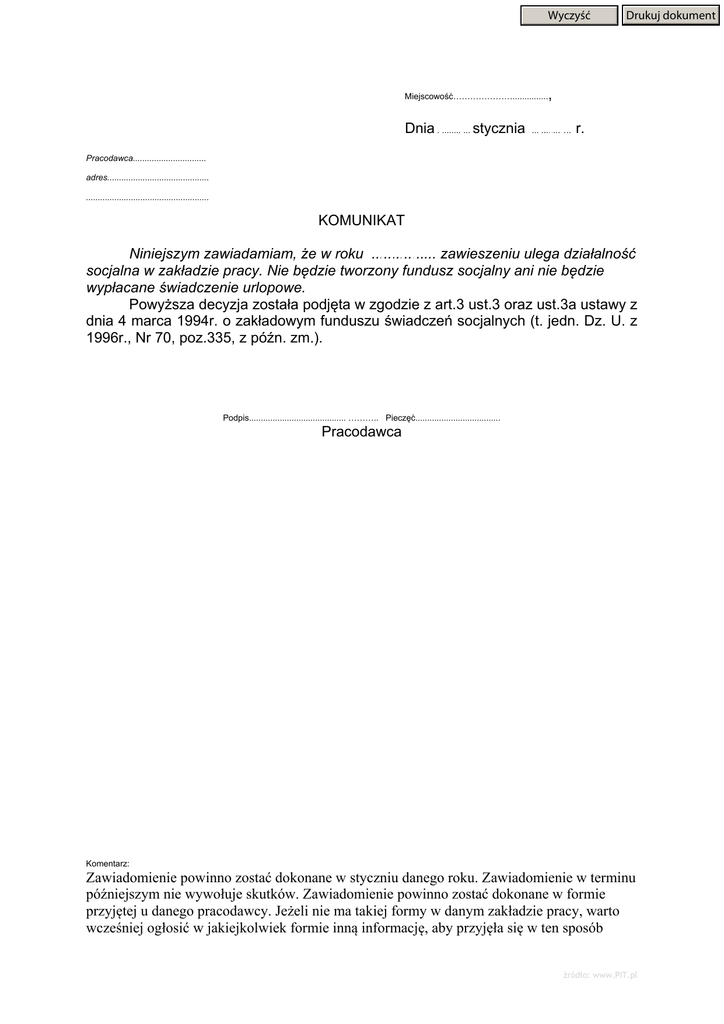 Wyczyść Drukuj dokument , Miejscowość…………………............... Dnia .............. stycznia ...........….. r. Pracodawca............................... adres........................................... .................................................... KOMUNIKAT Niniejszym zawiadamiam, że w roku ................ zawieszeniu ulega działalność socjalna w zakładzie pracy. Nie będzie tworzony fundusz socjalny ani nie będzie wypłacane świadczenie urlopowe. Powyższa decyzja została podjęta w zgodzie z art.3 ust.3 oraz ust.3a ustawy z dnia 4 marca 1994r. o zakładowym funduszu świadczeń socjalnych (t. jedn. Dz. U. z 1996r., Nr 70, poz.335, z późn. zm.). Podpis......................................... ……….. Pieczęć.................................... Pracodawca Komentarz: Zawiadomienie powinno zostać dokonane w styczniu danego roku. Zawiadomienie w terminu późniejszym nie wywołuje skutków. Zawiadomienie powinno zostać dokonane w formie przyjętej u danego pracodawcy. Jeżeli nie ma takiej formy w danym zakładzie pracy, warto wcześniej ogłosić w jakiejkolwiek formie inną informację, aby przyjęła się w ten sposób źródło: www.PIT.pl nowa forma ogłoszenia w danym zakładzie pracy. W ten sposób unika się wątpliwości związanych z formą dokonania ogłoszenia. źródło: www.PIT.pl