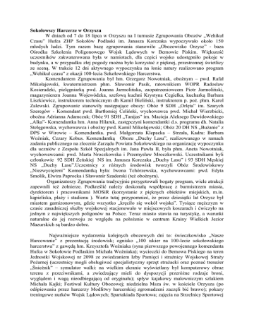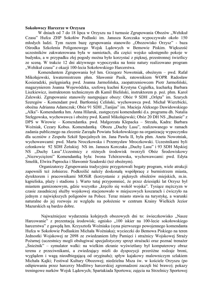 Sokołowscy Harcerze w Orzyszu W dniach od 7 do 18 lipca w Orzyszu na I turnusie Zgrupowania Obozów „Wehikuł Czasu” Hufca ZHP Sokołów Podlaski im. Janusza Korczaka wypoczywało około 150 młodych ludzi. Tym razem bazę zgrupowania stanowiło „Obozowisko Orzysz” - baza Ośrodka Szkolenia Poligonowego Wojsk Lądowych w Bemowie Piskim. Większość uczestników zakwaterowana była w namiotach, dla części wojsko udostępniło pokoje w budynku, a w przypadku złej pogody można było korzystać z pięknej, przestronnej świetlicy ze sceną. W trakcie 12 dni aktywnego wypoczynku na łonie natury realizowano program „Wehikuł czasu” z okazji 100-lecia Sokołowskiego Harcerstwa. Komendantem Zgrupowania był hm. Grzegorz Nowotniak, oboźnym – pwd. Rafał Mikołajewski, kwatermistrzem phm. Sławomir Pasik, ratownikiem WOPR Radosław Kosieradzki, pielęgniarką pwd. Joanna Jarmolińska, zaopatrzeniowcem Piotr Jarmoliński, magazynierem Joanna Wojewódzka, szefową kuchni Krystyna Cegiełka, kucharką Barbara Liszkiewicz, instruktorem technicznym dh Kamil Bieliński, instruktorem p. poż. phm. Karol Zalewski. Zgrupowanie stanowiły następujące obozy: Obóz 9 SDH „Orlęta” im. Szarych Szeregów - Komendant pwd. Bartłomiej Celiński, wychowawca pwd. Michał Wierzbicki, oboźna Adrianna Adamczuk; Obóz 91 SDH „Tanijas” im. Macieja Aleksego Dawidowskiego „Alka”- Komendantka hm. Anna Hilaruk, zastępczyni komendantki d.s. programu dh. Natalia Stelęgowska, wychowawca i oboźny pwd. Kamil Mikołajewski; Obóz 20 DH NS „Bużanie” z DPS w Wirowie – Komendantka. pwd. Małgorzata Klepacka – Strzała, Kadra: Barbara Woźniak, Cezary Kobus. Komendantką Obozu „Duchy Lasu”, realizowanego w ramach zadania publicznego na zlecenie Zarządu Powiatu Sokołowskiego na organizację wypoczynku dla uczniów z Zespołu Szkół Specjalnych im. Jana Pawła II, była phm. Aneta Nowotniak, wychowawcami: pwd. Marta Nroczkowska i Przemysław Mroczkowski. Uczestnikami byli członkowie 92 SDH Żeńskiej NS im. Janusza Korczaka „Duchy Lasu” i 93 SDH Męskiej NS „Duchy Lasu”.Uczestnicy z różnych środowisk tworzyli Obóz Środowiskowy „Niezwyciężeni” Komendantką była: Iwona Tchórzewska, wychowawcami: pwd. Edyta Smolik, Elwira Paprocka i Sławomir Szadorski (też oboźnym). Organizatorzy Zgrupowania tradycyjnie przygotowali bogaty program, wiele atrakcji zapewnili też żołnierze. Podkreślić należy doskonałą współpracę z burmistrzem miasta, dyrektorem i pracownikami MOSiR (korzystanie z pięknych obiektów miejskich, m.in. kąpieliska, plaży i stadionu ). Warto tutaj przypomnieć, że przez dziesiątki lat Orzysz był miastem garnizonowym, gdzie wszystko „kręciło się wokół wojska”. Tysiące mężczyzn w czasie zasadniczej służby wojskowej stacjonowało w miejscowych koszarach i ćwiczyło na jednym z największych poligonów na Polsce. Teraz miasto stawia na turystykę, a warunki naturalne do jej rozwoju ze względu na położenie w centrum Krainy Wielkich Jezior Mazurskich są bardzo dobre. Najważniejsze wydarzenia kolejnych obozowych dni to: świeczkowisko „Nasze Harcowanie” z prezentacją środowisk; ognisko „100 iskier na 100-lecie sokołowskiego harcerstwa” z gawędą hm. Krzysztofa Woźniaka (syna pierwszego powojennego komendanta Hufca w Sokołowie Podlaskim Michała Woźniaka); wycieczki do Bemowa Piskiego na teren Jednostki Wojskowej nr 2098 ze zwiedzaniem Izby Pamięci i strażnicy Wojskowej Straży Pożarnej (uczestnicy mogli obsługiwać specjalistyczny sprzęt strażacki oraz poznać trenażer „Śnieżnik” – symulator walki: na wielkim ekranie wyświetlany był komputerowy obraz terenu z przeciwnikami, a zwiedzający mieli do dyspozycji przeróżne rodzaje broni, wyglądem i wagą nieodbiegającą od oryginału); spływ kajakowy malowniczym szlakiem Michała Kajki; Festiwal Kultury Obozowej; niedzielna Msza św. w kościele Orzyszu (po odśpiewaniu przez harcerzy Modlitwy harcerskiej zgromadzeni zaczęli bić brawo); pokazy treningowe nurków Wojsk Lądowych; Spartakiada Sportowa; zajęcia na Strzelnicy Sportowej prowadzonej przez dh. Sławomira Szadorskiego, szkolenie p. poż. wraz z symulacją pożaru namiotu i ewakuacją obozu; ognisko z pieczeniem kiełbasek. Nie zabrakło też gier terenowych i podchodów, plażowania i kąpieli w jeziorze Orzysz, różnorodnych zajęć programowych, a także udziału w atrakcjach przygotowanych przez MOSiR w Orzyszu w ramach czterodniowego przedsięwzięcia „Wiatr, Woda i Przygoda” (m.in. zabawy animacyjne, konkurs na najładniejszą budowlę z piasku, zabawy na wodnym placu zabaw, festyn rekreacyjny, koncert szantowy, watra turystyczna). Jeśli dodamy do tego niezapomnianą harcerską atmosferę, duży zadrzewiony obszar, piękną i bezpieczną miejską plażę tuż obok obozowiska i bardzo dobre warunki pobytu, to nie dziwi, że wielu obozowiczów chciało zostać na drugi turnus. Dh. Marta Mroczkowska tak określiła obóz „Czarnucha w nowoczesnym wydaniu”. Tę opinię potwierdziło wielu dawnych obozowiczów, miło wspominających obozy w Puszczy Augustowskiej. Tegoroczna placówka zlokalizowana jest wśród zieleni, ocieniona pięknymi sosnami, świerkami i lipami, ale doszły dodatkowo wspaniałe atrakcje oraz media: nowe drewniane plenerowe toalety i prysznice oraz łazienki w budynku Obozowiska Orzysz, w którym mieścił się kiedyś Wojskowy Dom Wczasowy. Organizatorka obozu hm. Bożenna Hardej obdarowała wszystkich jubileuszowymi prezentami: koszulkami i przypinkami z logo 100-lecia. Zgromadzonych przy ognisku pożegnalnym, przeniosła wehikułem czasu w zarania dziejów sokołowskiego harcerstwa, wspomniała pierwszy obóz hufca, kolejne obozy, i ludzi, którzy je organizowali i prowadzili. Komendzie i kadrze obozów przekazała słowa wdzięczności za wielkie serca i trud włożony w opiekę, wychowanie i edukację uczestników, za stworzenie bezpiecznego, 