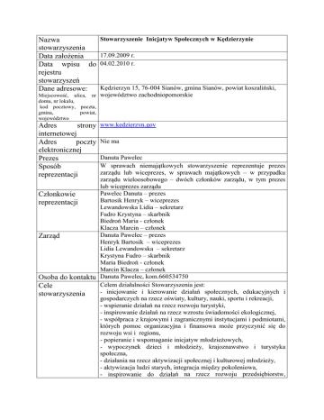 Nazwa stowarzyszenia Data założenia Data wpisu do rejestru stowarzyszeń Dane adresowe: Miejscowość, ulica, nr domu, nr lokalu, kod pocztowy, poczta, gmina, powiat, województwo Adres strony internetowej Adres poczty elektronicznej Prezes Sposób reprezentacji Stowarzyszenie Inicjatyw Społecznych w Kędzierzynie 17.09.2009 r. 04.02.2010 r. Kędzierzyn 15, 76-004 Sianów, gmina Sianów, powiat koszaliński, województwo zachodniopomorskie www.kedzierzyn.gov Nie ma Danuta Pawelec W sprawach niemajątkowych stowarzyszenie reprezentuje prezes zarządu lub wiceprezes, w sprawach majątkowych – w przypadku zarządu wieloosobowego – dwóch członków zarządu, w tym prezes lub wiceprezes zarządu Pawelec Danuta – prezes Członkowie Bartosik Henryk – wiceprezes reprezentacji Lewandowska Lidia – sekretarz Fudro Krystyna – skarbnik Biedroń Maria - członek Klacza Marcin – członek Danuta Pawelec – prezes Zarząd Henryk Bartosik – wiceprezes Lidia Lewandowska – sekretarz Krystyna Fudro – skarbnik Maria Biedroń - członek Marcin Klacza – członek Danuta Pawelec, kom.660534750 Osoba do kontaktu Celem działalności Stowarzyszenia jest: Cele - inicjowanie i kierowanie działań społecznych, edukacyjnych i stowarzyszenia gospodarczych na rzecz oświaty, kultury, nauki, sportu i rekreacji, - wspieranie działań na rzecz rozwoju turystyki, - inspirowanie działań na rzecz wzrostu świadomości ekologicznej, - współpraca z krajowymi i zagranicznymi instytucjami i podmiotami, których pomoc organizacyjna i finansowa może przyczynić się do rozwoju wsi i regionu, - popieranie i wspomaganie inicjatyw młodzieżowych, - wypoczynek dzieci i młodzieży, krajoznawstwo i turystyka społeczna, - działania na rzecz aktywizacji społecznej i kulturowej młodzieży, - aktywizacja ludzi starych, integracja między pokoleniowa, - inspirowanie do działań na rzecz rozwoju przedsiębiorstw, Historia stowarzyszenia Oferta NIP REGON Logo Zdjęcia alternatywnych źródeł dochodu gospodarstw oraz tworzenie nowych miejsc pracy, - poprawa standardu życia społeczności wiejskiej, - pielęgnowanie tożsamości narodowej i kulturalnej, - upowszechnianie kultury fizycznej i sportu w środowisku wiejskim, - realizowanie wniosków i postulatów członków Stowarzyszenia, w granicach dozwolonych prawem. Zebranie założycielskie odbyło się w świetlicy wiejskiej przy okazji opracowywania „Planu odnowy miejscowości Kędzierzyn na lata 2009–2016”. Stowarzyszenie powstało w celu łatwiejszego pozyskiwania środków, głównie z Unii Europejskiej. W 2010 r. udało się wykonać i oddać do użytku kącik ekologiczny i boisko do piłki siatkowej. Pieniądze pochodziły z Polskiej Fundacji Dzieci i Młodzieży oraz środków gminy Sianów. Plany na przyszłość, to głównie podejmowanie działań zmierzających do pozyskiwania środków finansowych na projekty sprzyjające rozwojowi wsi Kędzierzyn. Po kąciku ekologicznym, boisku do piłki siatkowej i placu zabaw dla dzieci, członkowie Stowarzyszenia w najbliższym czasie zabiegać będą o budowę świetlicy wiejskiej z prawdziwego zdarzenia, której brak mocno doskwiera tej malowniczo położonej i ciągle rozwijającej się miejscowości. 4990612387 320820770 Nie ma