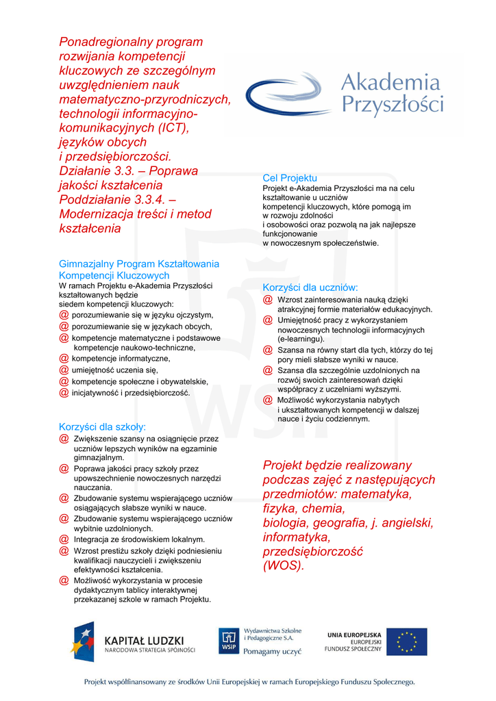 Ponadregionalny program rozwijania kompetencji kluczowych ze szczególnym uwzględnieniem nauk matematyczno-przyrodniczych, technologii informacyjnokomunikacyjnych (ICT), języków obcych i przedsiębiorczości. Działanie 3.3. – Poprawa jakości kształcenia Poddziałanie 3.3.4. – Modernizacja treści i metod kształcenia Cel Projektu Projekt e-Akademia Przyszłości ma na celu kształtowanie u uczniów kompetencji kluczowych, które pomogą im w rozwoju zdolności i osobowości oraz pozwolą na jak najlepsze funkcjonowanie w nowoczesnym społeczeństwie. Gimnazjalny Program Kształtowania Kompetencji Kluczowych W ramach Projektu e-Akademia Przyszłości kształtowanych będzie siedem kompetencji kluczowych: @ porozumiewanie się w języku ojczystym, @ porozumiewanie się w językach obcych, @ kompetencje matematyczne i podstawowe kompetencje naukowo-techniczne, @ kompetencje informatyczne, @ umiejętność uczenia się, @ kompetencje społeczne i obywatelskie, @ inicjatywność i przedsiębiorczość. Korzyści dla szkoły: @ Zwiększenie szansy na osiągnięcie przez @ @ @ @ @ @ uczniów lepszych wyników na egzaminie gimnazjalnym. Poprawa jakości pracy szkoły przez upowszechnienie nowoczesnych narzędzi nauczania. Zbudowanie systemu wspierającego uczniów osiągających słabsze wyniki w nauce. Zbudowanie systemu wspierającego uczniów wybitnie uzdolnionych. Integracja ze środowiskiem lokalnym. Wzrost prestiŜu szkoły dzięki podniesieniu kwalifikacji nauczycieli i zwiększeniu efektywności kształcenia. MoŜliwość wykorzystania w procesie dydaktycznym tablicy interaktywnej przekazanej szkole w ramach Projektu. Korzyści dla uczniów: @ Wzrost zainteresowania nauką dzięki @ @ @ @ atrakcyjnej formie materiałów edukacyjnych. Umiejętność pracy z wykorzystaniem nowoczesnych technologii informacyjnych (e-learningu). Szansa na równy start dla tych, którzy do tej pory mieli słabsze wyniki w nauce. Szansa dla szczególnie uzdolnionych na rozwój swoich zainteresowań dzięki współpracy z uczelniami wyŜszymi. MoŜliwość wykorzystania nabytych i ukształtowanych kompetencji w dalszej nauce i Ŝyciu codziennym. Projekt będzie realizowany podczas zajęć z następujących przedmiotów: matematyka, fizyka, chemia, biologia, geografia, j. angielski, informatyka, przedsiębiorczość (WOS). Platforma e-learningowa Projektu e-Akademia Przyszłości Specjalnie do realizacji zaplanowanych w Projekcie zadań zostanie uruchomiona platforma e-learningowa, na której zostaną zamieszczone wszystkie materiały dla uczniów i nauczycieli. Uczniowie będą mogli samodzielnie lub pod opieką nauczyciela, w dowolnym miejscu i czasie, korzystać z jednostek e-learningowych oraz komunikować się z biorącymi udział w Projekcie rówieśnikami z całej Polski. Zajęcia dla uczniów @ Kształtowanie kompetencji kluczowych w ramach wybranych przedmiotów nauczania, z wykorzystaniem 168 jednostek e-learningowych udostępnionych na platformie e-learningowej. KaŜda z jednostek to multimedialny program zawierający: treści nauczania, ćwiczenia, gry dydaktyczne, symulacje kształtujące wybrane umiejętności oraz część sprawdzającą opanowanie kształtowanych umiejętności. Dzięki integracji e-learningu z tradycyjnym kształceniem nauczyciel będzie m dostosować tempo pracy i jej zakres do indywidualnych potrzeb ucznia, a wśród uczniów wzrośnie zaangaŜowanie i potrzeba samokształcenia. @ Szkolne Grupy Wyrównawcze dla uczniów, którzy uzyskali niski wynik ze sprawdzianu na zakończenia 6 klasy. Grupy będą prowadzone przez pedagogów szkolnych metodami warsztatowymi. Celem warsztatów będzie rozwój myślenia abstrakcyjnego, wzrost samooceny, rozbudzenie aspiracji i nastawienie na twórcze rozwiązywanie problemów i podniesienie umiejętności uczenia się. Praca Szkolnych Grup Wyrównawczych jest przewidziana w pierwszym półroczu nauki gimnazjalnej. @ Testy diagnostyczne @ Lokalne Zespoły Projektowe Podczas trwania Projektu będą przeprowadzone 4 sesje testów, których wyniki mają stanowić punkt wyjścia do planowania pracy dydaktycznej z poszczególnymi uczniami Testy pozwolą na: badanie postępów uczniów, wyłonienie uczniów wybitnie utalentowanych w zakresie przedmiotów matematycznoprzyrodniczych, wyłonienie uczniów, którzy po zakończeniu szkoły podstawowej charakteryzują się niskim poziomem kompetencji kluczowych oraz zdiagnozowanie umiejętności wymagających rozwinięcia i dopasowanie właściwego programu pracy. Zadaniem takich zespołów będzie przygotowanie, we współpracy ze środowiskiem lokalnym, projektów interdyscyplinarnych poruszających i rozwiązujących ekologiczne, społeczne, ekonomiczne lub inne problemy regionu. Projekty będą sukcesywnie publikowane na platformie e-learningowej – stworzą Ligę Lokalnych Grup Projektowych. Najlepsze projekty wezmą udział w przeglądzie krajowym. @ Wirtualne Koła Naukowe dla uczniów uzdolnionych. Uczniowie ci stworzą Wirtualną Szkołę, w której pod opieką kadry akademickiej, będą rozwijać swoje uzdolnienia podczas indywidualnego toku nauczania. Dla wyróŜniających się uczniów Wirtualnej Szkoły, po pierwszym i drugim roku realizacji programu, zostaną zorganizowane pięciodniowe obozy naukowe w ośrodkach akademickich. Wydawnictwa Szkolne i Pedagogiczne S.A. Al. Jerozolimskie 136, 02-305 Warszawa (22) 576 25 30 www.wsip.pl www.eakademiaprzyszlosci.pl