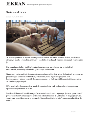 Niezależny serwis społeczności blogerów Świnia człowiek Zorion, 28.01.2017 18:01 W mrożącym krew w żyłach eksperymencie rodem z filmów science fiction, naukowcy stworzyli ludzko- świńskie embriony – po kilku tygodniach wzrostu zniszczyli (uśmiercili) je. Stworzenia posiadały ludzkie komórki macierzyste rozwijające się w świńskich embrionach, stanowiąc niewielką tylko część embrionów. Naukowcy mają nadzieję że taka rekombinacja mogłaby być użyta do hodowli organów na przeszczepy, które nie zostawałyby odrzucane przez organizm pacjenta. Ten kontrowersyjny eksperyment był przeprowadzony w Kaliforni i Hiszpanii, i finansowany ze środków prywatnych . USA zawiesiło finansowanie z pieniędzy podatników tych wzbudzających negatywne opinie eksperymentów w 2015. Możliwość hodowli ludzkich organów w embrionach świni wymaga „jeszcze sporo czasu” powiedział Juan Carlos Izpisua Belmonte z Salk Institute in California w magazynie Cell, w artykule opublikowanym w czwartek. Nazwał te działania jako” pierwszym krokiem do celu”“ strona 1 / 2 Niezależny serwis społeczności blogerów Takie działania pociągają za sobą niesamowite wyzwania.” “ Gatunki ewolują samodzielnie, dlatego wiele czynników dyktujących programy rozwojowe mogło by się rozejść, co czyni bardzo trudnym łączenie i harmonizowanie komórek z jednego gatunku z rosnącym embrionem z innego gatunku.” Powiedział dla CNN Dr. Jun Wu „ Im większy ewolucyjny dystans między gatunkami tym trudniej jest je połączyć” Zwierzeta z komórkami z innych gatunków są zwane chimerami. Takie kombinacje z sukcesem były tworzone z myszy i szczurów, ale większe zwierzęta jak świnie potrzebowałyby stworzenia organów o wielkości ludzkich. To mogłoby wspomóc dawców organów do transplantacji. Co 10 minut pojawia się nowa chora osoba na świecie, która potrzebuje organu do transplantacji, i zgodnie ze statystykami każdego dnia 22 osoby z tej list umierają z powodu braku organu. Zespół z instytutu Salk pracuje nad stworzeniem organów do przeszczepów serc, wątrób i innych w świniach. Zwierzęta te byłyby tylko miejscem rozwoju i wzrostu organów , a potem byłyby poddane eutanazji przed pobraniem organu. Ta wizja podnosi wiele etycznych kwestii, takich jak strach o rozwój jakichś cech ludzkich w zwierzętach. http://www.huffingtonpost.com/entry/strange-new-world- strona 2 / 2 Powered by TCPDF (www.tcpdf.org)