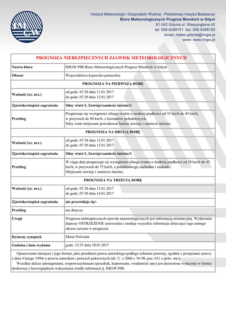 Instytut Meteorologii i Gospodarki Wodnej - Państwowy Instytut Badawczy Biuro Meteorologicznych Prognoz Morskich w Gdyni 81-342 Gdynia ul. Waszyngtona 42 tel: 058-6288151, fax: 058-6288155 email: [email protected] www: www.imgw.pl PROGNOZA NIEBEZPIECZNYCH ZJAWISK METEOROLOGICZNYCH Nazwa biura IMGW-PIB Biuro Meteorologicznych Prognoz Morskich w Gdyni Obszar Województwo kujawsko-pomorskie PROGNOZA NA PIERWSZĄ DOBĘ Ważność (cz. urz.) od godz. 07:30 dnia 11.01.2017 do godz. 07:30 dnia 12.01.2017 Zjawisko/stopień zagrożenia Silny wiatr/1, Zawieje/zamiecie śnieżne/1 Przebieg Prognozuje się wystąpienie silnego wiatru o średniej prędkości od 35 km/h do 45 km/h, w porywach do 80 km/h, z kierunków południowych. Silny wiatr miejscami powodować będzie zawieje i zamiecie śnieżne. PROGNOZA NA DRUGĄ DOBĘ Ważność (cz. urz.) od godz. 07:30 dnia 12.01.2017 do godz. 07:30 dnia 13.01.2017 Zjawisko/stopień zagrożenia Silny wiatr/1, Zawieje/zamiecie śnieżne/1 Przebieg W ciągu dnia prognozuje się wystąpienie silnego wiatru o średniej prędkości od 30 km/h do 45 km/h, w porywach do 75 km/h, z południowego zachodnu i zachodu. Miejscami zawieje i zamiecie śnieżne. PROGNOZA NA TRZECIĄ DOBĘ Ważność (cz. urz.) od godz. 07:30 dnia 13.01.2017 do godz. 07:30 dnia 14.01.2017 Zjawisko/stopień zagrożenia nie przewiduje się/- Przebieg nie dotyczy Uwagi Prognoza niebezpiecznych zjawisk meteorologicznych jest informacją orientacyjną. Wydawanie depeszy OSTRZEŻENIE unieważnia i anuluje wszystkie informacje dotyczące tego samego okresu zawarte w prognozie. Dyżurny synoptyk Maria Poświata Godzina i data wydania godz. 12:53 dnia 10.01.2017 Opracowanie niniejsze i jego format, jako przedmiot prawa autorskiego podlega ochronie prawnej, zgodnie z przepisami ustawy z dnia 4 lutego 1994r o prawie autorskim i prawach pokrewnych (dz. U. z 2006 r. Nr 90, poz. 631 z późn. zm.). Wszelkie dalsze udostępnianie, rozpowszechnianie (przedruk, kopiowanie, wiadomość sms) jest dozwolone wyłącznie w formie dosłownej z bezwzględnym wskazaniem źródła informacji tj. IMGW-PIB.