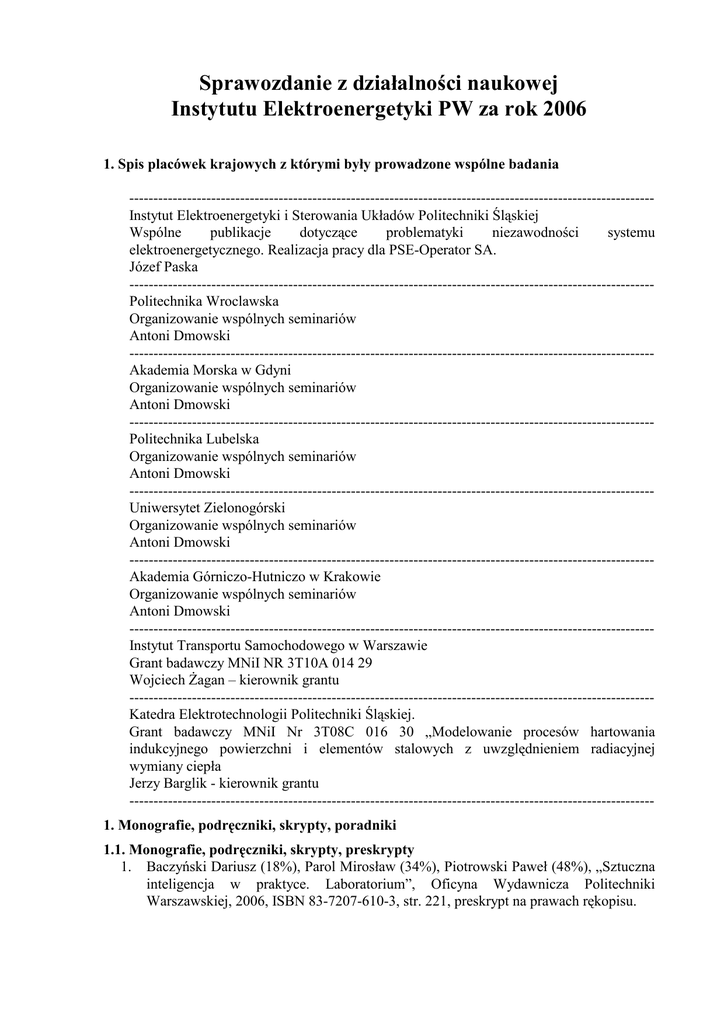 Sprawozdanie z działalności naukowej Instytutu Elektroenergetyki PW za rok 2006 1. Spis placówek krajowych z którymi były prowadzone wspólne badania ------------------------------------------------------------------------------------------------------------Instytut Elektroenergetyki i Sterowania Układów Politechniki Śląskiej Wspólne publikacje dotyczące problematyki niezawodności systemu elektroenergetycznego. Realizacja pracy dla PSE-Operator SA. Józef Paska ------------------------------------------------------------------------------------------------------------Politechnika Wroclawska Organizowanie wspólnych seminariów Antoni Dmowski ------------------------------------------------------------------------------------------------------------Akademia Morska w Gdyni Organizowanie wspólnych seminariów Antoni Dmowski ------------------------------------------------------------------------------------------------------------Politechnika Lubelska Organizowanie wspólnych seminariów Antoni Dmowski ------------------------------------------------------------------------------------------------------------Uniwersytet Zielonogórski Organizowanie wspólnych seminariów Antoni Dmowski ------------------------------------------------------------------------------------------------------------Akademia Górniczo-Hutniczo w Krakowie Organizowanie wspólnych seminariów Antoni Dmowski ------------------------------------------------------------------------------------------------------------Instytut Transportu Samochodowego w Warszawie Grant badawczy MNiI NR 3T10A 014 29 Wojciech śagan – kierownik grantu ------------------------------------------------------------------------------------------------------------Katedra Elektrotechnologii Politechniki Śląskiej. Grant badawczy MNiI Nr 3T08C 016 30 „Modelowanie procesów hartowania indukcyjnego powierzchni i elementów stalowych z uwzględnieniem radiacyjnej wymiany ciepła Jerzy Barglik - kierownik grantu ------------------------------------------------------------------------------------------------------------1. Monografie, podręczniki, skrypty, poradniki 1.1. Monografie, podręczniki, skrypty, preskrypty 1. Baczyński Dariusz (18%), Parol Mirosław (34%), Piotrowski Paweł (48%), „Sztuczna inteligencja w praktyce. Laboratorium”, Oficyna Wydawnicza Politechniki Warszawskiej, 2006, ISBN 83-7207-610-3, str. 221, preskrypt na prawach rękopisu. 2 2. Kowalik Ryszard (60%), Januszewski Marcin (20%), Smolarczyk Adam (20%): „Cyfrowa elektroenergetyczna automatyka zabezpieczeniowa”, Oficyna Wydawnicza Politechniki Warszawskiej, Warszawa 2006, ISBN 83-7207-579-4, 310 stron. 3. Kowalik Ryszard (80%), Pawlicki Cezary (20%): „Podstawy teletechniki dla elektryków”, Oficyna Wydawnicza Politechniki Warszawskiej, Warszawa 2006, ISBN 83-7207-647-2, 412 stron. 4. Kowalik Ryszard (70%), Gazarkiewicz Robert (30%): „Dydaktyczny system mikroprocesorowy DSM-51, Ćwiczenia w języku C dla mikrokontrolera 8051”, Wydawnictwo Naukowe PWN S.A., Warszawa 2006, ISBN-10 83-01-14963-9, 232 stron. 5. Marzecki Jerzy: „Terenowe sieci elektroenergetyczne”, Państwowy Instytut Badawczy – Instytut Technologii Eksploatacji, Warszawa, 2006, ISBN 83-7204-526-7, str. 260, monografia. 6. Marzecki Jerzy: „Elektroenergetyczne sieci miejskie. Zagadnienia wybrane”, Oficyna Wydawnicza Politechniki Warszawskiej, 2006, ISBN 83-7207-649-9, str. 230, II wydanie, zmienione i rozszerzone. 7. Marzecki Jerzy: „Przemysłowe sieci elektroenergetyczne”, Państwowy Instytut Badawczy – Instytut Technologii Eksploatacji, Warszawa-Radom, 2006, ISBN 837204-559-3, str. 204, ksiąŜka. 1.2. Rozdziały w ksiąŜkach (poradnikach) innych autorów 1. Helt Piotr, Klimczak Grzegorz: „Geoportal jako istotne źródło informacji przestrzennej dla przedsiębiorstw uŜyteczności publicznej”, rozdz. XVI, str. 164-175, w „Informatyka w administracji”, Redakcja naukowa: Jerzy S. Nowak, Zbigniew Olejniczak, Janusz K. Grabara, Polskie Towarzystwo Informatyczne - Oddział Górnośląski, Katowice 2006, ISBN 10: 83-60810-02-8, stron 210. 2. Grzonkowski Jan (50%), Pracki Piotr (50%): Podręcznik INPE dla elektryków, Zeszyt 9, „Oświetlenie elektryczne”, INPE Miesięcznik SEP, SEP – COSiW, Warszawa, ISSN 1234-0081, maj 2006, (112 stron). 2. Rozprawy doktorskie i habilitacyjne 2.1. Habilitacyjne (obronione) brak 2.2. Doktorskie (obronione) 1. Glinko Grzegorz: „Identyfikacja fotometryczna i aplikacje oświetleniowe niekonwencjonalnych form odbłyśników”, Politechnika Warszawska – Wydział Elektryczny, 2006, promotor: prof. dr hab. inŜ. Wojciech śagan. 2. Kłos Mariusz: „Aspekty techniczne i ekonomiczne magazynowania energii elektrycznej na przykładzie elektrowni wiatrowej”, Politechnika Warszawska – Wydział Elektryczny, 2006, promotor: prof. nzw. dr hab. inŜ. Józef Paska (obrona w dniu 19.12.2006, nadanie stopnia doktora w dniu 24.01.2007). 3. Konarzewski Piotr: „Wykorzystanie algorytmów mrówkowych w analizach przesyłu energii w systemach połączonych”, Politechnika Warszawska – Wydział Elektryczny, 2006, promotor: dr hab. inŜ. Stanisław Ziemianek. 4. Ozimek Paweł: „Nowa koncepcja systemu zasilania ukladów potrzeb własnych w elektroenergetyce”, Politechnika Warszawska – Wydział Elektryczny, 2006, promotor: prof. dr hab. inŜ. Antoni Dmowski (obrona w dniu 19.12.2006, nadanie stopnia doktora w dniu 24.01.2007). 5. Pawlak Karol: „Ocena zastosowań i instrumentów pochodnych w zarządzaniu ryzykiem rynkowym w systemie elektroenergetycznym”, Politechnika Warszawska – Wydział Elektryczny, 2006, promotor: prof. dr hab. inŜ. Szczęsny Kujszczyk 3 3. Artykuły w czasopismach międzynarodowych brak 4. Artykuły w czasopismach krajowych 1. 2. 3. 4. 5. 6. 7. 8. 9. 10. 11. 12. 13. 14. 15. 16. 17. Biczel Piotr: „MoŜliwości i ograniczenia UPS-ów czyli jak prawidłowo dobrać zasilacz do odbiorników”, Elektroinfo, ISS