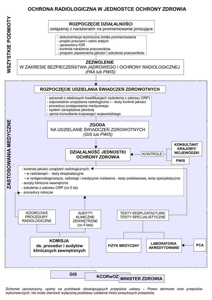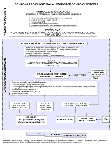 WSZYSTKIE PODMIOTY OCHRONA RADIOLOGICZNA W JEDNOSTCE OCHRONY ZDROWIA ROZPOCZĘCIE DZIAŁALNOŚCI związanej z narażeniem na promieniowanie jonizujące - dokumentacja techniczna źródła promieniowania - projekt pracowni i osłon stałych - uprawniony IOR - kontrola narażenia pracowników, - program zapewnienia jakości i szkolenia pracowników ZEZWOLENIE W ZAKRESIE BEZPIECZEŃSTWA JĄDROWEGO I OCHRONY RADIOLOGICZNEJ (PAA lub PWIS) ROZPOCZĘCIE UDZIELANIA ŚWIADCZEŃ ZDROWOTNYCH ZASTOSOWANIA MEDYCZNE - personel o właściwych kwalifikacjach (szkolenia z zakresu ORP) - odpowiednie urządzenia radiologiczne ← testy kontroli jakości - procedury postępowania medycznego - system zarządzania jakością - opinia konsultanta krajowego/ wojewódzkiego ZGODA NA UDZIELANIE ŚWIADCZEŃ ZDROWOTNYCH (GIS lub PWIS) DZIAŁALNOŚĆ JEDNOSTKI OCHRONY ZDROWIA KONTROLE KONSULTANT KRAJOWY/ WOJEWÓDZKI PWIS - kontrola jakości urządzeń radiologicznych: ▪ w radioterapii - testy eksploatacyjne ▪ w rentgenodiagnostyce, radiologii i medycynie nuklearne - testy podstawowe, testy specjalistyczne - audyty kliniczne wewnętrzne - szkolenia z zakresu ORP (co 5 lat) - procedury robocze WZORCOWE PROCEDURY RADIOLOGICZNE AUDYTY KLINICZNE ZEWNĘTRZNE (co 4 lata) KOMISJA ds. procedur i audytów klinicznych zewnętrznych GIS TESTY EKSPLOATACYJNE/ TESTY SPECJALISTYCZNE FIZYK MEDYCZNY KCORwOZ LABORATORIA AKREDYTOWANE PCA MINISTER ZDROWIA Schemat uproszczony, oparty na podstawie obowiązujących przepisów ustawy – Prawo atomowe oraz przepisów wykonawczych; nie może stanowić wyłącznej podstawy ustalania treści powyższych przepisów.
