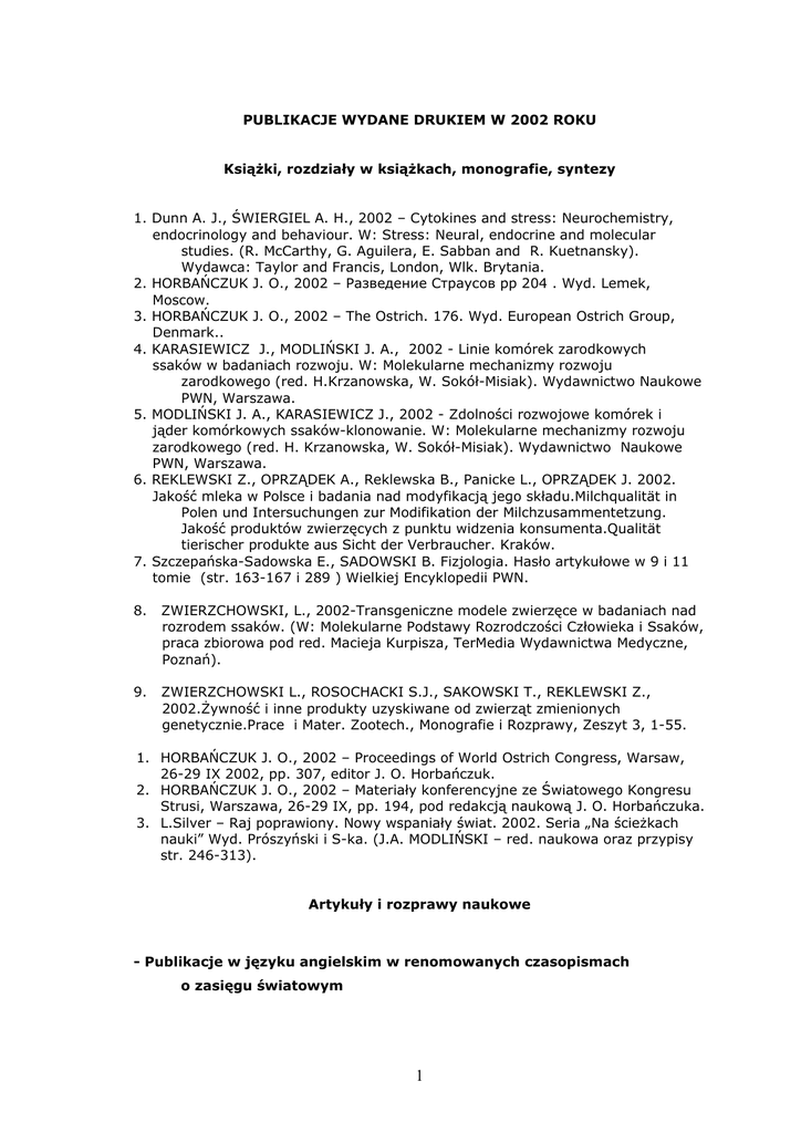 PUBLIKACJE WYDANE DRUKIEM W 2002 ROKU Książki, rozdziały w książkach, monografie, syntezy 1. Dunn A. J., ŚWIERGIEL A. H., 2002 – Cytokines and stress: Neurochemistry, endocrinology and behaviour. W: Stress: Neural, endocrine and molecular studies. (R. McCarthy, G. Aguilera, E. Sabban and R. Kuetnansky). Wydawca: Taylor and Francis, London, Wlk. Brytania. 2. HORBAŃCZUK J. O., 2002 – Разведениe Страусов pp 204 . Wyd. Lemek, Moscow. 3. HORBAŃCZUK J. O., 2002 – The Ostrich. 176. Wyd. European Ostrich Group, Denmark.. 4. KARASIEWICZ J., MODLIŃSKI J. A., 2002 - Linie komórek zarodkowych ssaków w badaniach rozwoju. W: Molekularne mechanizmy rozwoju zarodkowego (red. H.Krzanowska, W. Sokół-Misiak). Wydawnictwo Naukowe PWN, Warszawa. 5. MODLIŃSKI J. A., KARASIEWICZ J., 2002 - Zdolności rozwojowe komórek i jąder komórkowych ssaków-klonowanie. W: Molekularne mechanizmy rozwoju zarodkowego (red. H. Krzanowska, W. Sokół-Misiak). Wydawnictwo Naukowe PWN, Warszawa. 6. REKLEWSKI Z., OPRZĄDEK A., Reklewska B., Panicke L., OPRZĄDEK J. 2002. Jakość mleka w Polsce i badania nad modyfikacją jego składu.Milchqualität in Polen und Intersuchungen zur Modifikation der Milchzusammentetzung. Jakość produktów zwierzęcych z punktu widzenia konsumenta.Qualität tierischer produkte aus Sicht der Verbraucher. Kraków. 7. Szczepańska-Sadowska E., SADOWSKI B. Fizjologia. Hasło artykułowe w 9 i 11 tomie (str. 163-167 i 289 ) Wielkiej Encyklopedii PWN. 8. ZWIERZCHOWSKI, L., 2002-Transgeniczne modele zwierzęce w badaniach nad rozrodem ssaków. (W: Molekularne Podstawy Rozrodczości Człowieka i Ssaków, praca zbiorowa pod red. Macieja Kurpisza, TerMedia Wydawnictwa Medyczne, Poznań). 9. ZWIERZCHOWSKI L., ROSOCHACKI S.J., SAKOWSKI T., REKLEWSKI Z., 2002.Żywność i inne produkty uzyskiwane od zwierząt zmienionych genetycznie.Prace i Mater. Zootech., Monografie i Rozprawy, Zeszyt 3, 1-55. 1. HORBAŃCZUK J. O., 2002 – Proceedings of World Ostrich Congress, Warsaw, 26-29 IX 2002, pp. 307, editor J. O. Horbańczuk. 2. HORBAŃCZUK J. O., 2002 – Materiały konferencyjne ze Światowego Kongresu Strusi, Warszawa, 26-29 IX, pp. 194, pod redakcją naukową J. O. Horbańczuka. 3. L.Silver – Raj poprawiony. Nowy wspaniały świat. 2002. Seria „Na ścieżkach nauki” Wyd. Prószyński i S-ka. (J.A. MODLIŃSKI – red. naukowa oraz przypisy str. 246-313). Artykuły i rozprawy naukowe - Publikacje w języku angielskim w renomowanych czasopismach o zasięgu światowym 1 1. PŁUSA B., GRABAREK, J., PIOTROWSKA K., Glover DM, Zernicka-Goetz M., 2002. Site of the previous meiotic division defines cleavage orientation in the mouse embryo. Nature Cell Biology, 4:811-815. 2. PIOTROWSKA K., Zernicka-Goetz M., 2002. Early pattering of the mouse embryo-contribution of sperm and egg. Development, 129(24):5803-5813. 3. ŚWIERGIEL A. H., Dunn A. J., 2002 – Distinct roles for cyclooxydenases 1 and 2 in interleukin-1-induced behavioral changes. J. Pharmacol Exp. Ther. 302 (3): 1031-6 4. PŁUSA B., PIOTROWSKA K., Zernicka-Goetz M., 2002 – Sperm entry position as surface marker for the first cleavage plane of the mouse zygote, Genesis, 32: 193-198. 5. GRABAREK J., PŁUSA B., Glover DM, Zernicka-Goetz M., 2002.- Efficient delivery of dsRNA into zona-enclosed oocytes and preimplantation embryos by electroporation. Genesis, 32:269-276. 6. Palamarchouk V. S., ŚWIERGIEL A. H., Dunn A. J., 2002 – Hippocampal noradrenergic responses to CRF injected into the locus coeruleus of unanesthetized rats. Brain Res. 20, 950 (1-2): 31-8. 7. SACHARCZUK M., JASZCZAK K., SADOWSKI B., 2002 – Cytogenetic comparison of the sensitivity to mutagens in mice selected for high (HA) and low (LA) swim stress-induced analgesia. Mutation Research. 535 (1) 95-102. 4. Martin P, SZYMANOWSKA M, ZWIERZCHOWSKI L, Leroux C., 2002 –The impact of genetic polymorphisms on the protein composition of ruminant milks. Reproduction Nutrition and Development 42 433-459. 5. OLSZAŃSKA B., STĘPIŃSKA U., Perry M.M., 2002 - Development of embryos from in vitro ovulated and fertilized oocytes of the quail. J. Exp. Zool. 292, 580586. 6. MALEWSKI T., GAJEWSKA M., ŻEBROWSKA T., ZWIERZCHOWSKI L., 2002 Differential induction of transcription factors and expression of milk protein genes by prolactin and growth hormone in the mammary gland of rabbits. Growth Hormone and IGF Research 12, 41-53. 11. KORWIN-KOSSAKOWSKA A., Reed K. M., Pelak C., Krause E., MorrisonL.,and Alexander L. J., 2002- Radiation hybrid mapping of 118 new porcine microsatellites. Anim.Genet 33, 224-228. 12. Sazanov AA., Trukhina AV., Smirnov AF., JASZCZAK K., 2002 - Two chicken genes APOA1 and ETS1 are physically assigned to the same microchromosome. Animal Genetics. 33: 321-322. 7. Reklewska B., OPRZĄDEK A., REKLEWSKI Z., Panicke L., Kuczyńska B., OPRZĄDEK J. 2002 – „Alternative for modifying the fatty acid composition and decreasing the cholesterol level in the milk of cows”. Livestock Production Science 6, 235-243. 8. MODLINSKI J.A., Ozil J-P, Modlińska M.K, Szarska A., Reed MA., Wagner TE, Karasiewicz J., 2002. Development of single mouse blastomeres enlarged to zygote size in conditions of nucleo-cytoplasmic synchrony. Zygote, 10: 283290. 2 9. Witek B., Ochwanowska E., Ślewa A., KOŁĄTAJ A., 2002 – Effect of hydrocortisone on the activity of some lysosomal enzymes in mice. Neuroendocrinology Letters, 23, 83-86. 10. ROSOCHACKI S.J., Strzelecka M., Kozikowa L., Matejczyk M., Obłap R., POŁOSZYNOWICZ J., ZWIERZCHOWSKI L., 2002 - Expression of microinjected reporter gene lacZ during first cleavages of rabbit embryos. Folia Biologica (Kraków), 50, 61-67. 11. Sederstrom R., Mayntz M., SENDER G., 2002 – Effect of afterstimulation on milk yield and fat composition in beef cattle: a form of honest begging? Acta Agriculturae Scandinavica, Sect. A, Animal Sci. 52, 4, 161-166. 12. GROCHOWSKA, R.,GAJEWSKA, A., SNOCHOWSKI, M.,ZWIERZCHOWSKI, L., 2002 – 