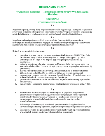REGULAMIN PRACY w Zespole Szkolno – Przedszkolnym nr 5 w Wodzisławiu Śląskim ROZDZIAŁ I POSTANOWIENIA OGÓLNE §1 Regulamin pracy, zwany dalej Regulaminem ustala organizację i porządek w procesie pracy oraz związane z tym prawa i obowiązki pracodawcy i pracowników. Organizację zajęć dydaktyczno – wychowawczych i opiekuńczych określa Statut Szkoły. §2 Regulamin obowiązuje wszystkich pracowników (nauczycieli i pracowników niebędących nauczycielami) bez względu na rodzaj wykonywanej pracy jak również zajmowane stanowisko oraz podstawę nawiązania stosunku pracy. §3 Ilekroć w regulaminie jest mowa o: 1. 2. 3. 4. 5. 6. przepisach prawa pracy - oznacza to ustawę Kodeks pracy (USTAWA z dnia 26 czerwca 1974 r. tekst pierwotny: Dz. U. 1974 r. Nr 24 poz. 141, tekst jednolity: Dz. U. 1998 r. Nr 21 poz. 94) oraz przepisy wydane na jej podstawie, ustawie o systemie oświaty - oznacza to Ustawę z dnia 7 września 1991 r. o systemie oświaty (Dz. U. 2004 Nr 256 poz. 2572), oraz przepisy wydane na jej podstawie, Karcie Nauczyciela oznacza Ustawę Karta Nauczyciela z dnia 26 stycznia 1982 r. (tekst jednolity: Dz. U. 2003. nr 118, poz. 1112 ze zmianami) pracodawcy - należy przez to rozumieć Zespół Szkolno – Przedszkolny nr 5 w Wodzisławiu Śl reprezentowany przez dyrektora, pracownik - oznacza to osobę zatrudnioną na podstawie umowy o pracę lub mianowania, nauczyciele– oznacza to pracowników podlegających przepisom ustawy KN. §4 1. Pracodawca obowiązany jest co najmniej raz w tygodniu przyjmować pracowników w sprawach skarg i wniosków dotyczących spraw ogólnych szkoły i kadry kierowniczej, wyjaśniać je i analizować przyczyny ich powstawania oraz udzielać rzetelnych odpowiedzi skarżącym lub wnioskodawcom. 2. Informacje o konkretnych terminach przyjmowania skarg i wniosków wywiesza się na tablicy ogłoszeń, usytuowanej w miejscu ogólnie dostępnym. 3. Żaden pracownik nie poniesie konsekwencji służbowych z powodu złożenia wniosku lub skargi, zawierających prawdziwe informacje. §5 1. Pracownik nie może tłumaczyć się nieznajomością postanowień zawartych w niniejszym Regulaminie. 2. Każdy pracownik przed dopuszczeniem do pracy podlega zaznajomieniu z Regulaminem; oświadczenie o zapoznaniu z treścią Regulaminu, zaopatrzone w podpis pracownika i datę jest dołączane do akt osobowych. 3. Wszyscy pracownicy przed dopuszczeniem do pracy podlegają szkoleniu wstępnemu w zakresie bezpieczeństwa i higieny pracy oraz ochrony przeciwpożarowej; podlegają także szkoleniom okresowym. Przyjęcie do wiadomości regulaminu ochrony przeciwpożarowej pracownik potwierdza własnoręcznym podpisem. ROZDZIAŁ II OBOWIĄZKI PRACOWNIKA I PRACODAWCY Obowiązki wynikające z Ustawy o systemie oświaty (Art.4) : Nauczyciel w swoich działaniach dydaktycznych, wychowawczych i opiekuńczych. §6 1. Podstawowym obowiązkiem pracownika jest: 1) troska o zapewnienie uczniom bezpiecznych i higienicznych warunków nauki, 2) sumienne i staranne wykonywanie pracy, 3) dążenie do uzyskiwania w pracy jak najlepszych wyników, 4) wykonywanie zadań określonych w indywidualnych przydziałach czynności, a także wynikających z odrębnych przepisów, 5) podnoszenie kwalifikacji zawodowych oraz doskonalenie umiejętności pracy, 6) dbanie o dobro zakładu pracy i jego mienie, 7) przestrzeganie Regulaminu Pracy, innych regulaminów obowiązujących w szkole i ustalonego w niej porządku, 8) stosowanie się do poleceń przełożonych, które dotyczą pracy, jeżeli nie są one sprzeczne przepisami prawa lub umową o pracę, 9) przestrzeganie ustalonego czasu pracy, 10) przestrzeganie przepisów i zasad bezpieczeństwa i higieny pracy, sanitarno - epidemiologicznych oraz przepisów przeciwpożarowych , 11) dbanie o dobro zakładu pracy, 12) używanie środków pracy zgodnie z ich przeznaczeniem wyłącznie do wykonywania zadań służbowych, współpraca z pracodawcą i przełożonym w realizowaniu obowiązków służbowych, 13) 14) zachowanie w tajemnicy informacji, których ujawnienie mogłoby narazić pracodawcę na szkodę, 15) przestrzeganie tajemnicy określonej w odrębnych przepisach, 16) przestrzeganie w zakładzie zasad współżycia społecznego, 17) dbanie o czystość i porządek wokół swojego stanowiska pracy, 18) należyte zabezpieczenie, po zakończeniu pracy, swojego stanowiska i pomieszczenia pracy. 19) w czasie zajęć dydaktycznych i opiekuńczych ma obowiązek kierowania się dobrem uczniów, troską o ich zdrowie, postawę moralną i obywatelską z poszanowaniem godności osobistej ucznia. 2. Zabrania się pracownikom: 1) opuszczania stanowiska pracy w czasie pracy bez zgody przełożonego, 2) używania urządzeń nie związanych bezpośrednio z wykonywaniem zleconych obowiązków i czynności, 3) samowolnego demontowania części urządzeń oraz ich naprawy bez specjalnego upoważnienia, 4) palenia tytoniu1 ( poza wyznaczonym miejscem) na terenie obiektu szkolnego, zażywania narkotyków. §7 1. Dyrektor szkoły jest zobowiązany do: 1) zapewnienia pracownikowi przydziału pracy zgodnie z treścią zawartej umowy pracy, 2) organizowania pracy w sposób zapewniający wykorzystanie czasu pracy i kwalifikacji pracowników, 3) zapoznawania pracowników podejmujących pracę z zakresem ich obowiązków, sposobem wykonywania pracy na wyznaczonym stanowisku oraz ich podstawowymi uprawnieniami, 4) zapewnienia bezpiecznych i higienicznych warunków pracy i nauki, prowadzenia systematycznego szkolenia pracowników w zakresie bezpieczeństwa i higieny pracy, 5) terminowego i prawidłowego wypłacania wynagrodzeń, 6) prowadzenia dokumentacji w sprawach związanych ze stosunkiem pracy oraz akt osobowych pracowników, 7) ułatwiania pracownikom podnoszenia kwalifikacji zawodowych, 8) zaspokajania w miarę posiadanych środków, socjalnych potrzeb pracowników, 9) stosowania obiektywnych i sprawiedliwych kryteriów przy ocenie pracowników oraz wynikó
