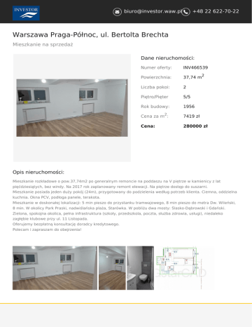 [email protected] +48 22 622-70-22 Warszawa Praga-Północ, ul. Bertolta Brechta Mieszkanie na sprzedaż Dane nieruchomości: Numer oferty: INV466539 Powierzchnia: 37,74 m Liczba pokoi: 2 Piętro/Pięter 5/5 Rok budowy: 1956 2 2 Cena za m : 7419 zł Cena: 280000 zł Opis nieruchomości: Mieszkanie rozkładowe o pow.37,74m2 po generalnym remoncie na poddaszu na V piętrze w kamienicy z lat pięćdziesiątych, bez windy. Na 2017 rok zaplanowany remont elewacji. Na piętrze dostęp do suszarni. Mieszkanie posiada jeden duży pokój (24m), przygotowany do podzielenia według potrzeb klienta. Ciemna, oddzielna kuchnia. Okna PCV, podłoga panele, terakota. Mieszkanie w doskonałej lokalizacji: 5 min pieszo do przystanku tramwajowego, 8 min pieszo do metra Dw. Wileński, 8 min. W okolicy Park Praski, nadwiślańska plaża, Starówka. W pobliżu dwa mosty: Ślasko-Dąbrowski i Gdański. Zielona, spokojna okolica, pełna infrastruktura (szkoły, przedszkola, poczta, służba zdrowia, usługi), niedaleko zagłębie klubowe przy ul. 11 Listopada. Oferujemy bezpłatną konsultację doradcy kredytowego. Polecam i zapraszam do obejrzenia!