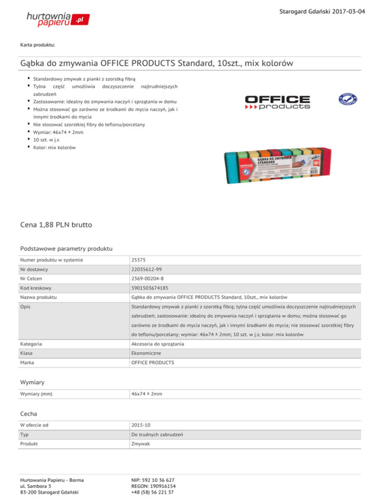 Starogard Gdański 2017-03-04 Karta produktu: Gąbka do zmywania OFFICE PRODUCTS Standard, 10szt., mix kolorów Standardowy zmywak z pianki z szorstką fibrą Tylna część umożliwia doczyszczenie najtrudniejszych zabrudzeń Zastosowanie: idealny do zmywania naczyń i sprzątania w domu Można stosować go zarówno ze środkami do mycia naczyń, jak i innymi środkami do mycia Nie stosować szorstkiej fibry do teflonu/porcelany Wymiar: 46x74 ± 2mm 10 szt. w j.s Kolor: mix kolorów Cena 1,88 PLN brutto Podstawowe parametry produktu Numer produktu w systemie 25375 Nr dostawcy 22035612-99 Nr Celcen 2369-00204-8 Kod kreskowy 5901503674185 Nazwa produktu Gąbka do zmywania OFFICE PRODUCTS Standard, 10szt., mix kolorów Opis Standardowy zmywak z pianki z szorstką fibrą; tylna część umożliwia doczyszczenie najtrudniejszych zabrudzeń; zastosowanie: idealny do zmywania naczyń i sprzątania w domu; można stosować go zarówno ze środkami do mycia naczyń, jak i innymi środkami do mycia; nie stosować szorstkiej fibry do teflonu/porcelany; wymiar: 46x74 ± 2mm; 10 szt. w j.s; kolor: mix kolorów Kategoria Akcesoria do sprzątania Klasa Ekonomiczne Marka OFFICE PRODUCTS Wymiary Wymiary (mm) 46x74 ± 2mm Cecha W ofercie od 2015-10 Typ Do trudnych zabrudzeń Produkt Zmywak Hurtowania Papieru - Borma ul. Sambora 3 83-200 Starogard Gdański NIP: 592 10 36 627 REGON: 190916154 +48 (58) 56 221 37 Starogard Gdański 2017-03-04 Karta katalogowa produktu cd. Gąbka do zmywania OFFICE PRODUCTS Standard, 10szt., mix kolorów Wspólny słownik zamówień CPV 39224300-1 Miotły i szczotki i inne artykuły do sprzątania w gospodarstwie domowym Certyfikaty Nowy produkt w ofercie Standard Hit Standard Kolor Kolor Mix kolorów Serdecznie zapraszamy do współpracy Hurtowania Papieru - Borma zespół. Hurtowania Papieru - Borma ul. Sambora 3 83-200 Starogard Gdański NIP: 592 10 36 627 REGON: 190916154 +48 (58) 56 221 37