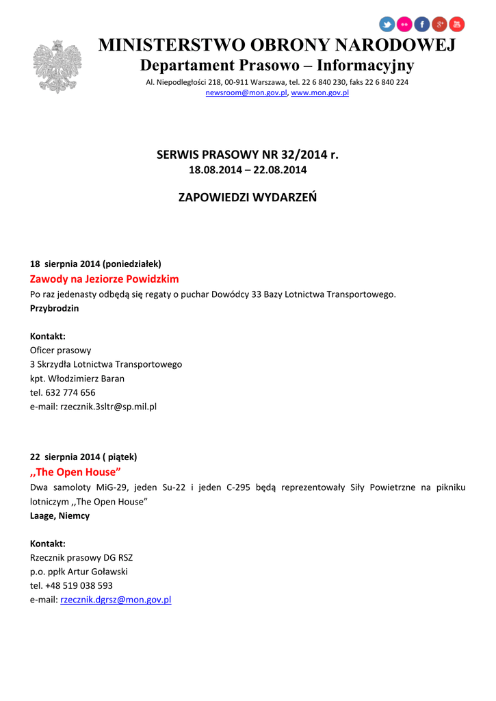 MINISTERSTWO OBRONY NARODOWEJ Departament Prasowo – Informacyjny Al. Niepodległości 218, 00-911 Warszawa, tel. 22 6 840 230, faks 22 6 840 224 [email protected], www.mon.gov.pl SERWIS PRASOWY NR 32/2014 r. 18.08.2014 – 22.08.2014 ZAPOWIEDZI WYDARZEŃ 18 sierpnia 2014 (poniedziałek) Zawody na Jeziorze Powidzkim Po raz jedenasty odbędą się regaty o puchar Dowódcy 33 Bazy Lotnictwa Transportowego. Przybrodzin Kontakt: Oficer prasowy 3 Skrzydła Lotnictwa Transportowego kpt. Włodzimierz Baran tel. 632 774 656 e-mail: [email protected] 22 sierpnia 2014 ( piątek) ,,The Open House” Dwa samoloty MiG-29, jeden Su-22 i jeden C-295 będą reprezentowały Siły Powietrzne na pikniku lotniczym ,,The Open House” Laage, Niemcy Kontakt: Rzecznik prasowy DG RSZ p.o. ppłk Artur Goławski tel. +48 519 038 593 e-mail: [email protected] 22 sierpnia 2014 ( piątek) Obchody rocznicowe w BLMW Obchody 20-lecia Brygady Lotnictwa Marynarki Wojennej. Dzień otwarty lotniska w Darłowie. Wystawa statyczna samolotów i śmigłowców Brygady. Gdynia Darłowo Kontakt: Oficer prasowy BLMW kmdr ppor. Czesław Cichy tel. 665 991 292 e-mail: [email protected] 22 sierpnia 2014 ( piątek) Pierwszy pomnik gen. Maczka w Normandii Z inicjatywy Ambasadora Rzeczpospolitej Polskiej we Francji Tomasza Orłowskiego oraz stowarzyszeń kultywujących tradycje 1 Polskiej Dywizji Pancernej (1PDPanc) we Francji w trakcie uroczystości upamiętniających bitwę polskich pancerniaków w Normandii zostanie odsłonięty pomnik generała Stanisława Maczka. Będzie to jeden z głównych punktów uroczystości, które odbędą się na Wzgórzu 262, osławionej reducie obronnej polskich pancerniaków, która zapisała się w historii polskiego oręża pod nazwą „Maczugi”. Rzeźba została wykonana w brązie. Będzie to pierwszy pomnik w Normandii dedykowany generałowi, który w sierpniu 1944 roku dowodził 1PDPanc w bojach decydujących o ostatecznych rozstrzygnięciach bitwy. Stanie on tuż obok memoriału upamiętniającego bitwę, a odsłoniętego w jego obecności w 1964 roku. Francja, Wzgórze 262 Kontakt: Sekcja Prasowa 11LDKPanc Szef sekcji - oficer prasowy mjr Artur Pinkowski kom. 695 858 042 tel.(68) 4 75 81 22 e-mail: [email protected] KRONIKA 11 sierpnia 2014 (poniedziałek) O polsko-amerykańskiej współpracy sił powietrznych O perspektywach współpracy wojskowej rozmawiał dowódca generalny rodzajów sił zbrojnych generał broni pilot Lech Majewski z przebywającym w Polsce dowódcą 3 Sił Powietrznych USA generałem broni pilotem Daryllem Robersonem. Więcej… 12 sierpnia 2014 (wtorek) Zgoda na podpisanie umowy między rządem RP a SHAPE Rada Ministrów podjęła uchwałę w sprawie udzielenia zgody na podpisanie umowy między rządem Rzeczypospolitej Polskiej a Naczelnym Dowództwem Sojuszniczych Sił w Europie (SHAPE) dotyczącej stacjonowania, statusu prawnego i wsparcia 3. Batalionu Łączności NATO (3NSB), elementu podporządkowanego Grupie Systemów Łączności i Informatyki NATO (NCISG) dyslokowanego w Rzeczypospolitej Polskiej, przedłożoną przez ministra obrony narodowej. Więcej… 13 sierpnia 2014 (środa) Minister Tomasz Siemoniak na Śląsku W środę, z okazji zbliżającego się święta Wojska Polskiego minister obrony narodowej Tomasz Siemoniak odwiedził 18 Batalion Powietrznodesantowy w Bielsku-Białej, gdzie spotkał się z kadrą dowódczą, żołnierzami i pracownikami cywilnymi jednostki. Więcej… 14 sierpnia 2014 (czwartek) Wojsko uczciło poległych w wojnie polsko-bolszewickiej Święto Wojska Polskiego jest świętem całego narodu – powiedział minister obrony narodowej Tomasz Siemoniak podczas uroczystości na warszawskich Powązkach w przededniu święta Wojska Polskiego i 94. rocznicy bitwy warszawskiej 1920 r. Więcej… 14 sierpnia 2014 (czwartek) Spotkanie z rodziną Michaela Ollisa "Wszyscy mamy w pamięci sierpniowy dzień, kiedy została zaatakowana baza Ghazni. (…) W tym dniu zginął także amerykański żołnierz Michael Ollis, który ratując swojego polskiego kolegę wykazał się największym poświęceniem" – powiedział podczas spotkania z rodziną sierżanta sztabowego Michaela H. Ollisa minister obrony narodowej Tomasz Siemoniak. Więcej… 14 sierpnia 2014 (czwartek) Uroczystości w przeddzień święta Wojska Polskiego Święto Wojska Polskiego to okazja do wyróżnienia najlepszych jednostek, instytucji wojskowych i żołnierzy służby czynnej. W tym dniu zawsze wspominamy też tych żołnierzy, którzy w minionym roku odeszli powiedział podczas spotkania z żołnierzami, byłymi żołnierzami, weteranami oraz pracownikami wojska minister obrony narodowej Tomasz Siemoniak. Więcej… 15 sierpnia 2014 (piątek) Żołnierski festyn w Warszawie W piątek w ramach obchodów święta Wojska Polskiego i 94. rocznicy Bitwy Warszawskiej w Warszawie odbył się żołnierski festyn. Więcej… 15 sierpnia 2014 (piątek) Wręczenie nominacji generalskich i admiralskich Prezydent Bronisław Komorowski wręczył w piątek z okazji święta Wojska Polskiego nominacje na stopnie generalskie i admiralskie 13 oficerom. W uroczystości uczestniczył minister obrony narodowej Tomasz Siemoniak. Więcej… 15 sierpnia 2014 (piątek) Minister Siemoniak na uroczystościach święta WP Minister obrony narodowej Tomasz Siemoniak uczestniczył w piątek w obchodach święta Wojska Polskiego. Więcej… 15 sierpnia 2014 (piątek) W powietrzu i na lądzie – defilada wojskowa W piątek przed pomnikiem marszałka Józefa Piłsudskiego (obok Belwederu) odbyły się centralne uroczystości państwowe święta Wojska Polskiego oraz 94. rocznicy Bitwy Warszawskiej. Więcej…