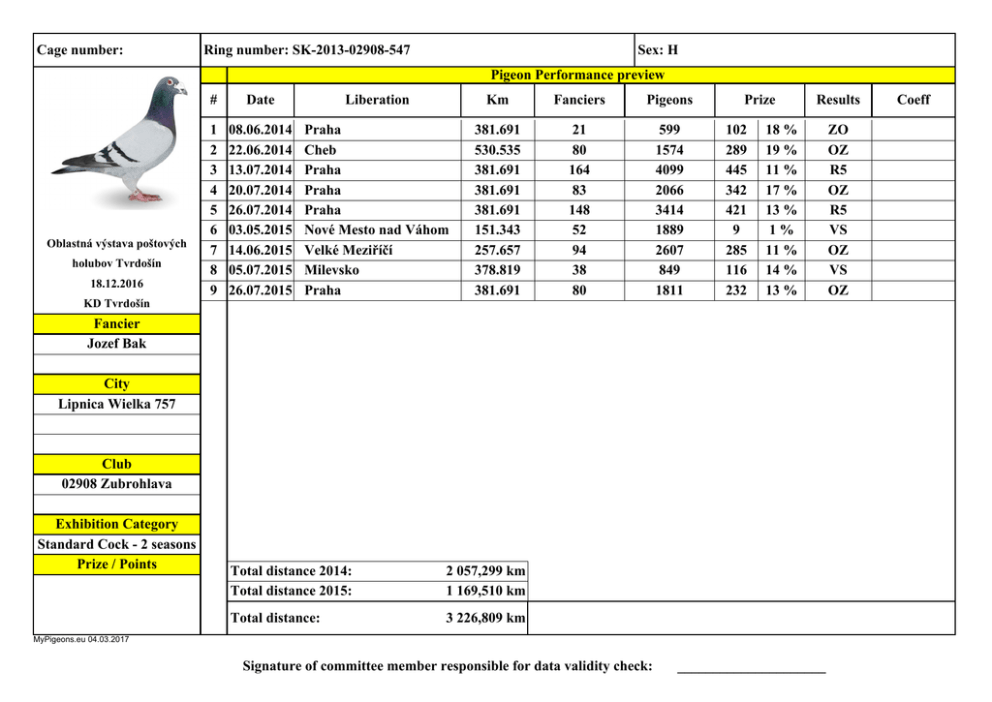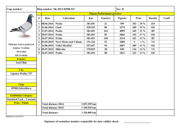 Cage number: Ring number: SK-2013-02908-547 Sex: H Pigeon Performance preview Oblastná výstava poštových holubov Tvrdošín 18.12.2016 KD Tvrdošín # Date Liberation Km Fanciers Pigeons 1 2 3 4 5 6 7 8 9 08.06.2014 22.06.2014 13.07.2014 20.07.2014 26.07.2014 03.05.2015 14.06.2015 05.07.2015 26.07.2015 Praha Cheb Praha Praha Praha Nové Mesto nad Váhom Velké Meziříčí Milevsko Praha 381.691 530.535 381.691 381.691 381.691 151.343 257.657 378.819 381.691 21 80 164 83 148 52 94 38 80 599 1574 4099 2066 3414 1889 2607 849 1811 Prize 102 289 445 342 421 9 285 116 232 Results 18 % 19 % 11 % 17 % 13 % 1% 11 % 14 % 13 % Fancier Jozef Bak City Lipnica Wielka 757 Club 02908 Zubrohlava Exhibition Category Standard Cock - 2 seasons Prize / Points Total distance 2014: Total distance 2015: 2 057,299 km 1 169,510 km Total distance: 3 226,809 km MyPigeons.eu 04.03.2017 Signature of committee member responsible for data validity check: _____________________ ZO OZ R5 OZ R5 VS OZ VS OZ Coeff