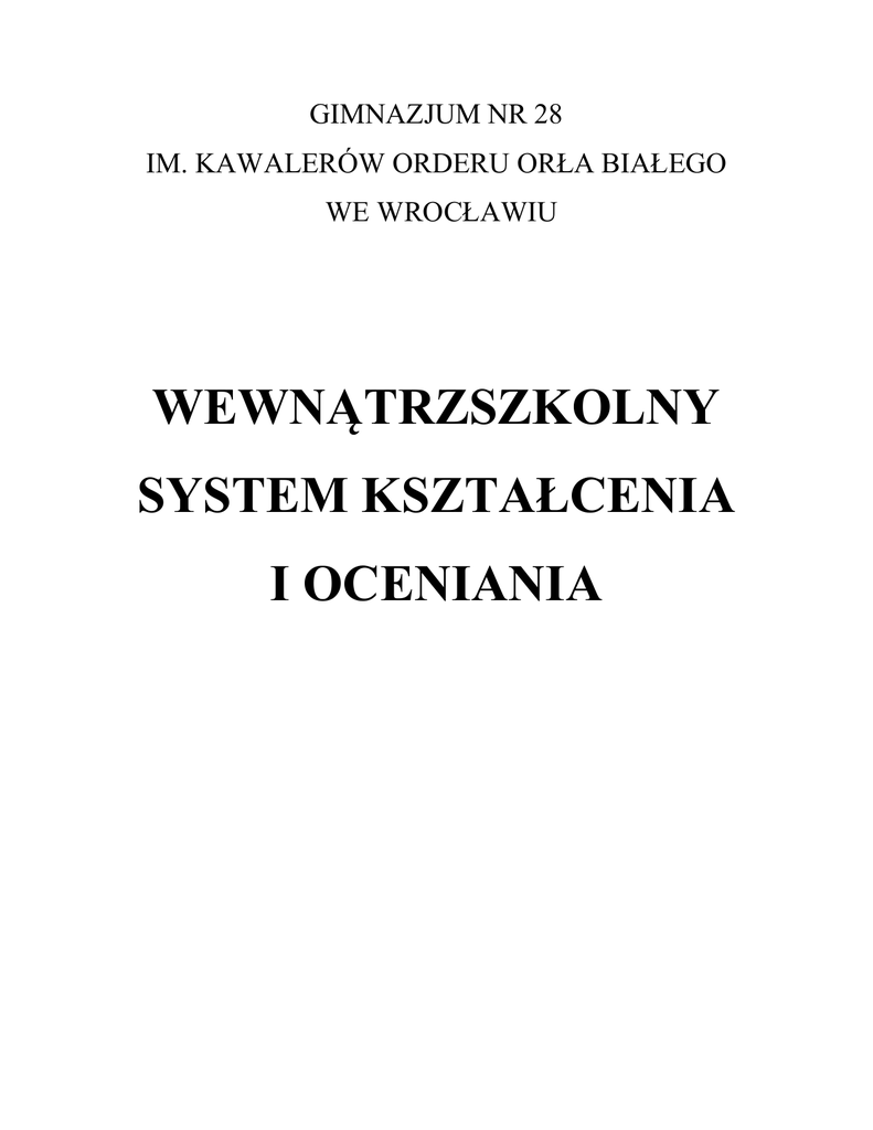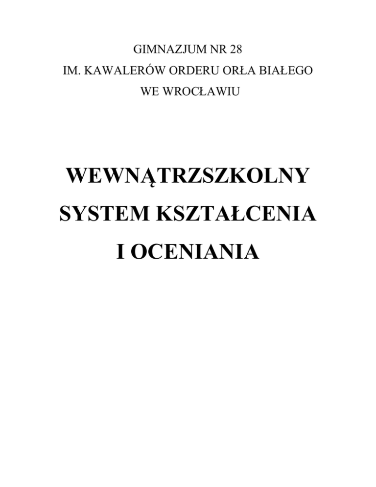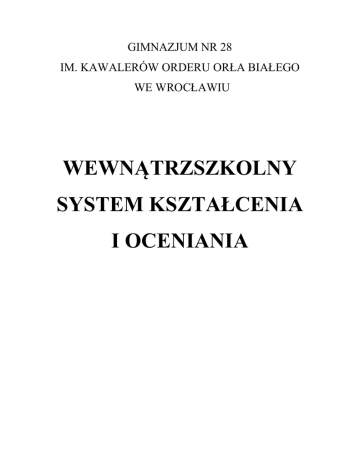 GIMNAZJUM NR 28 IM. KAWALERÓW ORDERU ORŁA BIAŁEGO WE WROCŁAWIU WEWNĄTRZSZKOLNY SYSTEM KSZTAŁCENIA I OCENIANIA SPIS TREŚCI I. ZAŁOŻENIA WEWNĄTRZSZKOLNEGO SYSTEMU OCENIANIA I PRZEDMIOTOWEGO SYSTEMU OCENIANIA ..................................................................................................................................2 II. EGZAMIN KLASYFIKACYJNY I EGZAMIN POPRAWKOWY ..........................................................6 III. OCENA ZACHOWANIA ...........................................................................................................................7 1. 2. 3. 4. Ocenie zachowania podlegają następujące elementy: ................................................................................... 7 Ocenę zachowania wystawia wychowawca klasy po uwzględnieniu: ............................................................ 7 Oceną wyjściową zachowania ucznia jest ocena dobra. ................................................................................ 7 Skala ocen zachowania: wzorowa, bardzo dobra, dobra, poprawna, nieodpowiednia, naganna. ................ 7 IV. DOSTOSOWANIE WYMAGAŃ DLA UCZNIÓW O SPECJALNYCH POTRZEBACH EDUKACYJNYCH ............................................................................................................................................8 V. OCENIANIE UCZNIÓW O SPECJALNYCH POTRZEBACH EDUKACYJNYCH ..............................8 Uczniowie z zaburzeniami sprawności ruchowej ................................................................................................... 8 Uczniowie niedosłyszący ........................................................................................................................................ 9 Uczniowie ze specyficznymi trudnościami w uczeniu się ....................................................................................... 9 Uczniowie niedowidzący ...................................................................................................................................... 10 Uczniowie z zaburzeniami zachowania ................................................................................................................ 10 VI. PRZEDMIOTOWE SYSTEMY OCENIANIA ........................................................................................11 1. 2. 3. 4. 5. 6. 7. 8. 9. 10. 11. 12. 13. 14. 15. 16. 17. 18. 19. 20. KATECHEZA .................................................................................................................................................. 11 JĘZYK POLSKI ............................................................................................................................................... 12 HISTORIA ....................................................................................................................................................... 17 WOS ................................................................................................................................................................. 21 JĘZYK ANGIELSKI ....................................................................................................................................... 24 JĘZYK NIEMIECKI ........................................................................................................................................ 25 JĘZYK FRANCUSKI ...................................................................................................................................... 26 JĘZYK ROSYJSKI .......................................................................................................................................... 27 MATEMATYKA ............................................................................................................................................. 29 FIZYKA ....................................................................................................................................................... 32 CHEMIA ...................................................................................................................................................... 36 BIOLOGIA .................................................................................................................................................. 39 GEOGRAFIA............................................................................................................................................... 41 INFORMATYKA ........................................................................................................................................ 43 ZAJĘCIA TECHNICZNE ............................................................................................................................ 45 PLASTYKA I MUZYKA ............................................................................................................................ 47 ZAJĘCIA MUZYCZNO-PLASTYCZNE ................................................................................................... 52 TANIEC ....................................................................................................................................................... 56 WYCHOWANIE FIZYCZNE ..................................................................................................................... 57 EDUKACJA DLA BEZPIECZEŃSTWA .................................................................................................... 62 1 WEWNĄTRZSZKOLNY SYSTEM OCENIANIA W GIMNAZJUM NR 28 WE WROCŁAWIU Na podstawie Rozporządzenia MEN z dn. 30 kwietnia 2007 r. Rada Pedagogiczna Gimnazjum Nr 28 we Wrocławiu przyjmuje do stosowania następujące założenia wewnątrzszkolnego systemu oceniania, które stanowić będą podstawę do budowania przedmiotowego systemu oceniania przez każdego nauczyciela przedmiotu i wychowawcę, zatwierdzając tym samym niżej opisany regulamin wewnątrzszkolnego systemu oceniania. I. ZAŁOŻENIA WEWNĄT