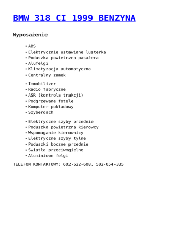BMW 318 CI 1999 BENZYNA Wyposażenie ABS Elektrycznie ustawiane lusterka Poduszka powietrzna pasażera Alufelgi Klimatyzacja automatyczna Centralny zamek Immobilizer Radio fabryczne ASR (kontrola trakcji) Podgrzewane fotele Komputer pokładowy Szyberdach Elektryczne szyby przednie Poduszka powietrzna kierowcy Wspomaganie kierownicy Elektryczne szyby tylne Poduszki boczne przednie Światła przeciwmgielne Aluminiowe felgi TELEFON KONTAKTOWY: 602-622-608, 502-054-335
