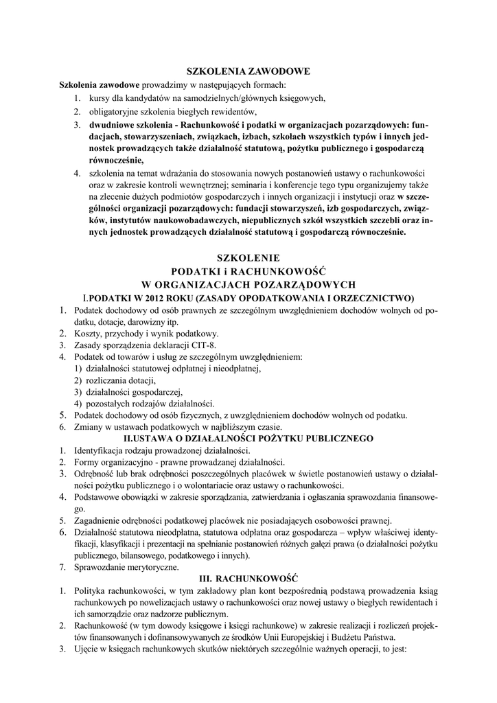 SZKOLENIA ZAWODOWE Szkolenia zawodowe prowadzimy w następujących formach: 1. kursy dla kandydatów na samodzielnych/głównych księgowych, 2. obligatoryjne szkolenia biegłych rewidentów, 3. dwudniowe szkolenia - Rachunkowość i podatki w organizacjach pozarządowych: fundacjach, stowarzyszeniach, związkach, izbach, szkołach wszystkich typów i innych jednostek prowadzących także działalność statutową, pożytku publicznego i gospodarczą równocześnie, 4. szkolenia na temat wdrażania do stosowania nowych postanowień ustawy o rachunkowości oraz w zakresie kontroli wewnętrznej; seminaria i konferencje tego typu organizujemy także na zlecenie dużych podmiotów gospodarczych i innych organizacji i instytucji oraz w szczególności organizacji pozarządowych: fundacji stowarzyszeń, izb gospodarczych, związków, instytutów naukowobadawczych, niepublicznych szkół wszystkich szczebli oraz innych jednostek prowadzących działalność statutową i gospodarczą równocześnie. SZKOLENIE PODATKI i RACHUNKOWOŚĆ W ORGANIZACJACH POZARZĄDOWYCH I.PODATKI W 2012 ROKU (ZASADY OPODATKOWANIA I ORZECZNICTWO) 1. Podatek dochodowy od osób prawnych ze szczególnym uwzględnieniem dochodów wolnych od podatku, dotacje, darowizny itp. 2. Koszty, przychody i wynik podatkowy. 3. Zasady sporządzenia deklaracji CIT-8. 4. Podatek od towarów i usług ze szczególnym uwzględnieniem: 1) działalności statutowej odpłatnej i nieodpłatnej, 2) rozliczania dotacji, 3) działalności gospodarczej, 4) pozostałych rodzajów działalności. 5. Podatek dochodowy od osób fizycznych, z uwzględnieniem dochodów wolnych od podatku. 6. Zmiany w ustawach podatkowych w najbliższym czasie. II.USTAWA O DZIAŁALNOŚCI POŻYTKU PUBLICZNEGO 1. Identyfikacja rodzaju prowadzonej działalności. 2. Formy organizacyjno - prawne prowadzanej działalności. 3. Odrębność lub brak odrębności poszczególnych placówek w świetle postanowień ustawy o działalności pożytku publicznego i o wolontariacie oraz ustawy o rachunkowości. 4. Podstawowe obowiązki w zakresie sporządzania, zatwierdzania i ogłaszania sprawozdania finansowego. 5. Zagadnienie odrębności podatkowej placówek nie posiadających osobowości prawnej. 6. Działalność statutowa nieodpłatna, statutowa odpłatna oraz gospodarcza – wpływ właściwej identyfikacji, klasyfikacji i prezentacji na spełnianie postanowień różnych gałęzi prawa (o działalności pożytku publicznego, bilansowego, podatkowego i innych). 7. Sprawozdanie merytoryczne. III. RACHUNKOWOŚĆ 1. Polityka rachunkowości, w tym zakładowy plan kont bezpośrednią podstawą prowadzenia ksiąg rachunkowych po nowelizacjach ustawy o rachunkowości oraz nowej ustawy o biegłych rewidentach i ich samorządzie oraz nadzorze publicznym. 2. Rachunkowość (w tym dowody księgowe i księgi rachunkowe) w zakresie realizacji i rozliczeń projektów finansowanych i dofinansowywanych ze środków Unii Europejskiej i Budżetu Państwa. 3. Ujęcie w księgach rachunkowych skutków niektórych szczególnie ważnych operacji, to jest: 1) aktywów trwałych i obrotowych, 2) rozliczeń międzyokresowych kosztów i przychodów, 3) ewidencji, kalkulacji oraz wyodrębnienia i rozliczenia kosztów w/g rodzajów działalności, 4) rezerw (na straty i przyszłe zobowiązania, odprawy emerytalne itp.), 5) ustalenia i rozliczenia wyniku finansowego. 4. Inwentaryzacja aktywów i pasywów oraz rozliczenie i ujęcie jej skutków w księgach rachunkowych. 5. Wyodrębnienie oraz powiązania działalności statutowej (statutowej pożytku publicznego) oraz gospodarczej. IV. DYSKUSJA ORAZ PYTANIA I ODPOWIEDZI Szkolenia odbędą się w naszym lokalu w Warszawie, Aleja Komisji Edukacji Narodowej 98 (przy stacji metra „URSYNÓW”) w godz. 09:30 – 16:00 w następujących terminach: 09-10.10.2012 r. oraz 06-07.11.2012 r. (odpłatność 620 zł od osoby) w tym materiały szkoleniowe, napoje, obiady. (wszyscy uczestnicy szkolenia otrzymują bezpłatnie, odpowiedni do rodzaju działalności, zakładowy plan kont z komentarzem i pozostałe części zakładowych zasad (polityki) rachunkowości lub inne wydawnictwo według życzeń) Zgłoszenia uczestnictwa w szkoleniach prosimy dokonać na poniższym druku przesyłając go wraz z kopią dowodu wpłaty na konto nr 91 1500 1865 1218 6009 8582 0000, PERFECTUM – AUDIT Doradcy Finansowo – Księgowi Spółka z o. o., 02-777 Warszawa, Al. Komisji Edukacji Narodowej 98. Liczbę miejsc, ze względów organizacyjnych, ograniczamy do 40 na poszczególne terminy; zadecyduje kolejność zgłoszeń potwierdzona wpłatami. Prosimy uprzejmie o podanie, celem wystawienia faktury VAT z tytułu wniesionej opłaty, nr NIP. Pragniemy poinformować, że prowadzimy szkolenia w powyższej tematyce także na indywidualne zlecenia jednostek wielooddziałowych. Wykładowcami na szkoleniach będą biegli rewidenci badający, pod bezpośrednim naszym nadzorem, sprawozdania finansowe w organizacjach pozarządowych, autorzy wydawnictw książkowych w oferowanej problematyce posiadający równocześnie uprawnienia pedagogiczne. Oferty naszych wydawnictw oraz innych usług, w tym badania sprawozdań finansowych, audytów zewnętrznych projektów unijnych, prowadzenia ksiąg rachunkowych itd. znajdziecie Państwo na naszej stronie internetowej www.perfectumaudit.pl ----------------------------------------------------------------------------------------------------------------............................................... (zgłaszający - imię i nazwisko lub pieczęć firmowa) ZGŁASZAM UCZESTNICTWO w szkoleniu: PODATKI I RACHUNKOWOŚĆ W ORGANIZACJACH POZARZĄDOWYCH w następującym terminie (nach): ................................................................................................. 1. (imię i nazwisko, data i miejsce urodzenia) 2. 3. (adres zamieszkania, kod pocztowy) (nazwa firmy, adres, NIP do wystawienia faktury VAT) 4. (nr tel., e-mail) Data....................