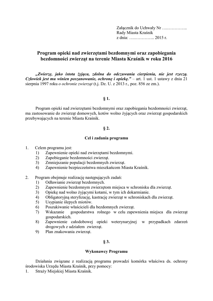 Załącznik do Uchwały Nr ….………….. Rady Miasta Kraśnik z dnia: ….………….. 2015 r. Program opieki nad zwierzętami bezdomnymi oraz zapobiegania bezdomności zwierząt na terenie Miasta Kraśnik w roku 2016 „Zwierzę, jako istota żyjąca, zdolna do odczuwania cierpienia, nie jest rzeczą. Człowiek jest mu winien poszanowanie, ochronę i opiekę.” – art. 1 ust. 1 ustawy z dnia 21 sierpnia 1997 roku o ochronie zwierząt (t.j. Dz. U. z 2013 r., poz. 856 ze zm.). § 1. Program opieki nad zwierzętami bezdomnymi oraz zapobiegania bezdomności zwierząt, ma zastosowanie do zwierząt domowych, kotów wolno żyjących oraz zwierząt gospodarskich przebywających na terenie Miasta Kraśnik. § 2. Cel i zadania programu 1. Celem programu jest: 1) Zapewnienie opieki nad zwierzętami bezdomnymi. 2) Zapobieganie bezdomności zwierząt. 3) Zmniejszanie populacji bezdomnych zwierząt. 4) Zapewnienie bezpieczeństwa mieszkańcom Miasta Kraśnik. 2. Program obejmuje realizację następujących zadań: 1) Odławianie zwierząt bezdomnych. 2) Zapewnienie bezdomnym zwierzętom miejsca w schronisku dla zwierząt. 3) Opiekę nad wolno żyjącymi kotami, w tym ich dokarmianie. 4) Obligatoryjną sterylizację, kastrację zwierząt w schroniskach dla zwierząt. 5) Usypianie ślepych miotów. 6) Poszukiwanie właścicieli dla bezdomnych zwierząt. 7) Wskazanie gospodarstwa rolnego w celu zapewnienia miejsca dla zwierząt gospodarskich. 8) Zapewnienie całodobowej opieki weterynaryjnej w przypadkach zdarzeń drogowych z udziałem zwierząt. 9) Plan znakowania zwierząt. § 3. Wykonawcy Programu Działania związane z realizacją programu prowadzi komórka właściwa ds. ochrony środowiska Urzędu Miasta Kraśnik, przy pomocy: 1. Straży Miejskiej Miasta Kraśnik. 2. 3. Schroniska dla bezdomnych zwierząt ……………………………………………………. Lecznicy dla zwierząt: 1) Gabinet Weterynaryjny:…………………………………………………………... 2) Przychodnia Weterynaryjna: ...……………………..……………………………... 3) Gospodarstwo rolne: ………………………………………………………………. 4) Organizacje społeczne, stowarzyszenia, fundacje, których statutowym celem jest przeciwdziałanie bezdomności zwierząt we współpracy z organami gminy. 5) Opiekunowie zwierząt, wolontariusze. § 3. Odławianie zwierząt bezdomnych 1. 2. 3. 4. 5. 6. Odławianiem są objęte bezdomne zwierzęta pozostawione bez opieki, w stosunku do których nie istnieje możliwość ustalenia ich właściciela lub innej osoby, pod której opieką dotychczas pozostawały, a w szczególności chore lub zagrażające życiu, zdrowiu i bezpieczeństwu ludzi. Czynności odławiania bezdomnych zwierząt prowadzone są przez pracowników Schroniska: ...………..…………………………………………………………………… przy pomocy funkcjonariuszy Straży Miejskiej w Kraśniku. Odłowione zwierzęta są przewożone i przetrzymywane w Schronisku: ……………………………………………………………………………………………. Odłowione zwierzęta gospodarskie oddawane są pod opiekę gospodarstwa rolnego: ……………………………………………………………………………………………. Odłowione zwierzęta zapewnione mają godziwe warunki bytu, ochronę, wyżywienie, obsługę i opiekę weterynaryjną. Wyłapywanie, transport i przetrzymywanie w schronisku odłowionych zwierząt odbywa się zgodnie z obowiązującymi w tym zakresie przepisami prawa, nie zadając cierpienia a także nie stwarzając zagrożenia dla życia i zdrowia zwierząt. § 4. Zapewnienie zwierzętom bezdomnym miejsca w schronisku 1. 2. Zapewnienie bezdomnym zwierzętom miejsca przez Miasto Kraśnik realizowane jest poprzez umieszczenie bezdomnych zwierząt domowych w schronisku: ……………………………………………………………………………………………. Zwierzęta bezdomne trafiające do schroniska, w przypadku nieodnalezienia właściciela zwierzęcia w okresie 14 dni od daty umieszczenia w schronisku są trwale znakowane poprzez podskórne wszczepienie elektronicznych identyfikatorów oraz wprowadzane do bazy danych, na potrzeby późniejszej identyfikacji oraz postępowania adopcyjnego. § 5. Opieka nad kotami wolno żyjącymi 1. Opieka nad kotami wolno żyjącymi na terenie Miasta Kraśnik sprawowana jest przez komórkę właściwą ds. ochrony środowiska Urzędu Miasta Kraśnik przy pomocy opiekunów wolno żyjących kotów, zarejestrowanych na podstawie złożonych deklaracji oraz wolontariuszy. 2. 3. Opieka obejmuje w szczególności: 1) wydawanie karmy zarejestrowanym w Urzędzie Miasta Kraśnik opiekunom wolno żyjących kotów, w okresie jesienno - zimowym, 2) leczenie zwierząt potrąconych w wypadkach komunikacyjnych, 3) sterylizację, kastrację i odrobaczanie wolno żyjących kotów. Sterylizacja, kastracja i odrobaczanie wolno żyjących kotów z terenu Miasta Kraśnik odbywa się w: …………………………………………..………………………………... Odławianie wolno żyjących kotów w celu dokonania zabiegu sterylizacji, kastracji, odrobaczania dokonuje zarejestrowany opiekun wolno żyjących kotów, członkowie organizacji społecznych oraz wolontariusze, po uprzednim otrzymaniu pisemnego skierowania na zabieg wydanym przez pracownika komórki właściwej ds. ochrony środowiska Urzędu Miasta Kraśnik oraz funkcjonariusze Straży Miejskiej w Kraśniku. § 6. Sterylizacja, kastracja, leczenie oraz eutanazja zwierząt w schronisku 1. 2. 3. W zależności od sytuacji i potrzeby zwierzęta są poddawane sterylizacji, kastracji leczeniu lub eutanazji. Zabiegi sterylizacji, kastracji, leczenia lub poddawania eutanazji dokonywane są wyłącznie przez lekarza weterynarii. Zabiegom o których mowa w pkt 1, nie podlegają zwierzęt