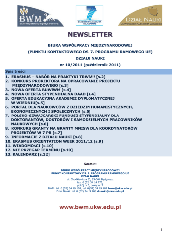 NEWSLETTER BIURA WSPÓŁPRACY MIĘDZYNARODOWEJ (PUNKTU KONTAKTOWEGO DS. 7. PROGRAMU RAMOWEGO UE) DZIAŁU NAUKI nr 10/2011 (październik 2011) Spis treści 1. ERASMUS – NABÓR NA PRAKTYKI TRWA!!! [s.2] 2. KONKURS PROREKTORA NA OPRACOWANIE PROJEKTU MIĘDZYNARODOWEGO [s.3] 3. NOWA OFERTA BUWiWM [s.4] 4. NOWA OFERTA STYPENDIALNA DAAD [s.4] 5. OFERTA EDUKACYJNA AKADEMII DYPLOMATYCZNEJ W WIEDNIU[s.5] 6. PORTAL DLA NAUKOWCÓW Z DZIEDZIN HUMANISTYCZNYCH, EKONOMICZNYCH I SPOŁECZNYCH [s.5] 7. POLSKO-SZWAJCARSKI FUNDUSZ STYPENDIALNY DLA DOKTORANTÓW, DOKTORÓW I SAMODZIELNYCH PRACOWNIKÓW NAUKOWYCH [s.6] 8. KONKURS GRANTY NA GRANTY MNISW DLA KOORDYNATORÓW PROJEKTÓW W 7 PR [s.7] 9. INFORMACJE Z DZIAŁU NAUKI [s.8] 10. ERASMUS ORIENTATION WEEK 2011/12 [s.9] 11. WIADOMOŚCI [s.10] 12. NIE PRZEGAP TERMINU [s.10] 13. KALENDARZ [s.12] Kontakt: BIURO WSPÓŁPRACY MIĘDZYNARODOWEJ PUNKT KONTAKTOWY DS. 7. PROGRAMU RAMOWEGO UE DZIAŁ NAUKI ul. Chodkiewicza 30, 85-064 Bydgoszcz fax. 0 (52) 34 14 773, pokój nr 5, pokój nr 7 BWM: tel. 0 (52) 34 19 108, tel. 0 (52) 34 19 107 [email protected] Dział Nauki: tel. 0 (52) 34 19 208 [email protected] www.bwm.ukw.edu.pl 1 ERASMUS – NABÓR NA PRAKTYKI TRWA!!! Przypominamy, że TRWA NABÓR NA MIN. 3-MIESIĘCZNE PRAKTYKI Z PROGRAMU ERASMUS 2011/12 TERMIN PRZYJMOWANIA ZGŁOSZEŃ: DO WYCZERPANIA MIEJSC Zainteresowanych prosimy o kontakt z Biurem Współpracy Międzynarodowej. Biuro Współpracy Międzynarodowej UKW ul. Chodkiewicza 30, budynek główny, parter, pok. 5 Kontakt: [email protected] Zapraszamy do współpracy UWAGA: Oferty praktyk - na stronie Biura Współpracy Międzynarodowej w zakładce Biuro - Praktyki. Zachęcamy też do szukania praktyk we własnym zakresie. Informujemy również, że: RUSZYŁA NOWA STRONA PROGRAMU ERASMUS Zapraszamy do odwiedzenia strony: www.erasmus.org. 2 KONKURS PROREKTORA NA OPRACOWANIE PROJEKTU MIĘDZYNARODOWEGO Prorektor ds. Nauki i Współpracy z Zagranicą, prof. dr hab. Janusz Ostoja-Zagórski ogłasza konkurs dla pracowników naukowych w roku akademickim 2011/12 na opracowanie projektu międzynarodowego realizowanego w ramach umowy międzyuczelnianej, listu intencyjnego lub umowy konsorcjum projektowego. 1. Projekt wymaga uzgodnienia z uczelnią partnerską/konsorcjum projektowym następujących zagadnień: • czas trwania projektu, • charakter współpracy, • tematyka, • przewidywane rezultaty, • harmonogram działań, • kosztorys. 2. Zakres działań: • opracowanie wniosku do projektu międzynarodowego (m.in. 7 Program Ramowy, Leonardo da Vinci, program CEEPUS, kurs intensywny w ramach LLP, Erasmus Mundus itp.), • organizacja wspólnego seminarium/warsztatów/konferencji, • wydanie wspólnej publikacji/opracowania/broszury, • inne formy współpracy międzynarodowej. Dofinansowanie ze strony Prorektora może wynieść do 5 tys. PLN. Projekt wymaga akceptacji merytorycznej dyrektora instytutu/kierownika katedry oraz dziekana właściwego wydziału. Harmonogram działań: 8 listopada 2011 – termin przygotowania zgłoszeń, 10 listopada 2011 – termin rozstrzygnięcia konkursu, 30 września 2012 – ostateczny termin rozliczenia finansowego i merytorycznego. Formularz aplikacyjny znajduje się na stronie Biura Współpracy Międzynarodowej, www.bwm.ukw.edu.pl Kontakt: Aniela Bekier Jasińska, [email protected] kierownik Biura Współpracy Międzynarodowej UKW 3 NOWA OFERTA STYPENDIALNA BIURA UZNAWALNOŚCI WYKSZTAŁCENIA I WYMIANY MIĘDZYNARODOWEJ Przypominamy, że na stronie internetowej www.buwiwm.edu.pl/wym/intro.htm dostępna jest już oferta stypendialna na rok akademicki 2012/2013. Zawiera informacje o możliwościach wyjazdów zagranicznych na studia częściowe, staże i misje naukowe, staże doktoranckie oraz kursy językowe. Termin składania podań na większość wyjazdów to 30 listopada 2011. Będziemy na bieżąco informować o aktualnych ofertach. Termin składania podań do Biura Współpracy Międzynarodowej to 24 listopada 2011. Gorąco zachęcamy do skorzystania z oferty. NOWA OFERTA STYPENDIALNA DAAD Jest już gotowa nowa oferta stypendialna: Niemieckiej Centrali Wymiany Akademickiej DAAD 2012/13. Oferta ta skierowana jest do studentów, absolwentów oraz naukowców z polskich uczelni, a wśród propozycji, jak co roku, stypendia na pobyty studyjne, badawcze oraz kursy językowe w Niemczech itp. Broszurę zawierającą pełną tegoroczną ofertę stypendialną znaleźć można na polskiej stronie instytucji: www.daad.pl . Przypominamy, że koordynatorem DAAD na naszej uczelni jest pani Friederike Partzsch z Katedry Germanistyki ([email protected]). Jednocześnie informujemy, że na początku listopada odbędą się spotkania informacyjne, podczas których będzie można zapoznać się ze szczegółami oferty stypendialnej BUWiWM, DAAD i Erasmus. O terminie spotkań poinformujemy Państwa na stronie internetowej Biura Współpracy Międzynarodowej. 4 OFERTA EDUKACYJNA AKADEMII DYPLOMATYCZNEJ W WIEDNIU Ambasada Austrii informuje o następujących kursach, które prowadzone będą przez Akademię Dyplomatyczną w Wiedniu w roku 2012/13. • roczny kurs podyplomowy oferujący szerokie wykształcenie interdyscyplinarne w dziedzinie stosunków międzynarodowych, skierowany do absolwentów wszystkich kierunków. Główny akcent położony jest na przekazanie wiedzy o strukturach i politykach UE. O szczególnym profilu kursu decyduje nacisk na rozwój umiejętności praktycznych (technika prezentacji i negocjacji, retoryka, zarządzanie projektem), intensywny program nauki języka oraz zajęcia wielojęzyczne. • kurs M.A.I.S. (Master of Advanced International Studies): dwuletni program z naciskiem na sprawy europejskie. Kandydaci posiadający już wystarczające interdyscyplinarne wykształcenie akademickie w dziedzinie stosunków międzynarodowych mogą być przyjęci od razu na drugi rok. Kurs jest prowadzony wspólnie z Uniwersytetem Wiedeńskim. • Master in Environmental Techno
