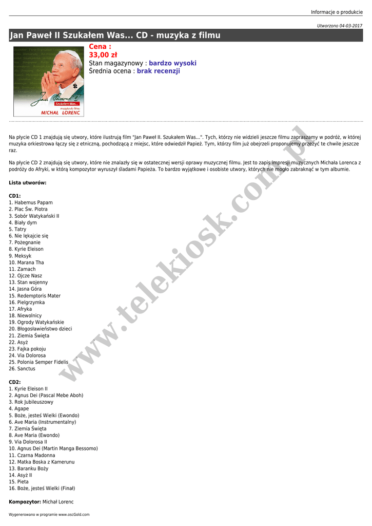 Informacje o produkcie Utworzono 04-03-2017 Jan Paweł II Szukałem Was... CD - muzyka z filmu Cena : 33,00 zł Stan magazynowy : bardzo wysoki Średnia ocena : brak recenzji .p l Na płycie CD 1 znajdują się utwory, które ilustrują film "Jan Paweł II. Szukałem Was...". Tych, którzy nie widzieli jeszcze filmu zapraszamy w podróż, w której muzyka orkiestrowa łączy się z etniczną, pochodzącą z miejsc, które odwiedził Papież. Tym, którzy film już obejrzeli proponujemy przeżyć te chwile jeszcze raz. m Na płycie CD 2 znajdują się utwory, które nie znalazły się w ostatecznej wersji oprawy muzycznej filmu. Jest to zapis impresji muzycznych Michała Lorenca z podróży do Afryki, w którą kompozytor wyruszył śladami Papieża. To bardzo wyjątkowe i osobiste utwory, których nie mogło zabraknąć w tym albumie. sk io ek .t el w w w CD1: 1. Habemus Papam 2. Plac Św. Piotra 3. Sobór Watykański II 4. Biały dym 5. Tatry 6. Nie lękajcie się 7. Pożegnanie 8. Kyrie Eleison 9. Meksyk 10. Marana Tha 11. Zamach 12. Ojcze Nasz 13. Stan wojenny 14. Jasna Góra 15. Redemptoris Mater 16. Pielgrzymka 17. Afryka 18. Niewolnicy 19. Ogrody Watykańskie 20. Błogosławieństwo dzieci 21. Ziemia Święta 22. Asyż 23. Fajka pokoju 24. Via Dolorosa 25. Polonia Semper Fidelis 26. Sanctus .c o Lista utworów: CD2: 1. Kyrie Eleison II 2. Agnus Dei (Pascal Mebe Aboh) 3. Rok Jubileuszowy 4. Agape 5. Boże, jesteś Wielki (Ewondo) 6. Ave Maria (Instrumentalny) 7. Ziemia Święta 8. Ave Maria (Ewondo) 9. Via Dolorosa II 10. Agnus Dei (Martin Manga Bessomo) 11. Czarna Madonna 12. Matka Boska z Kamerunu 13. Baranku Boży 14. Asyż II 15. Pieta 16. Boże, jesteś Wielki (Finał) Kompozytor: Michał Lorenc Wygenerowano w programie www.oscGold.com Dystrybutor: Polskie Radio S.A. Nośnik: CD w w w .t el ek io sk .c o m .p l Rok wydania: 2011