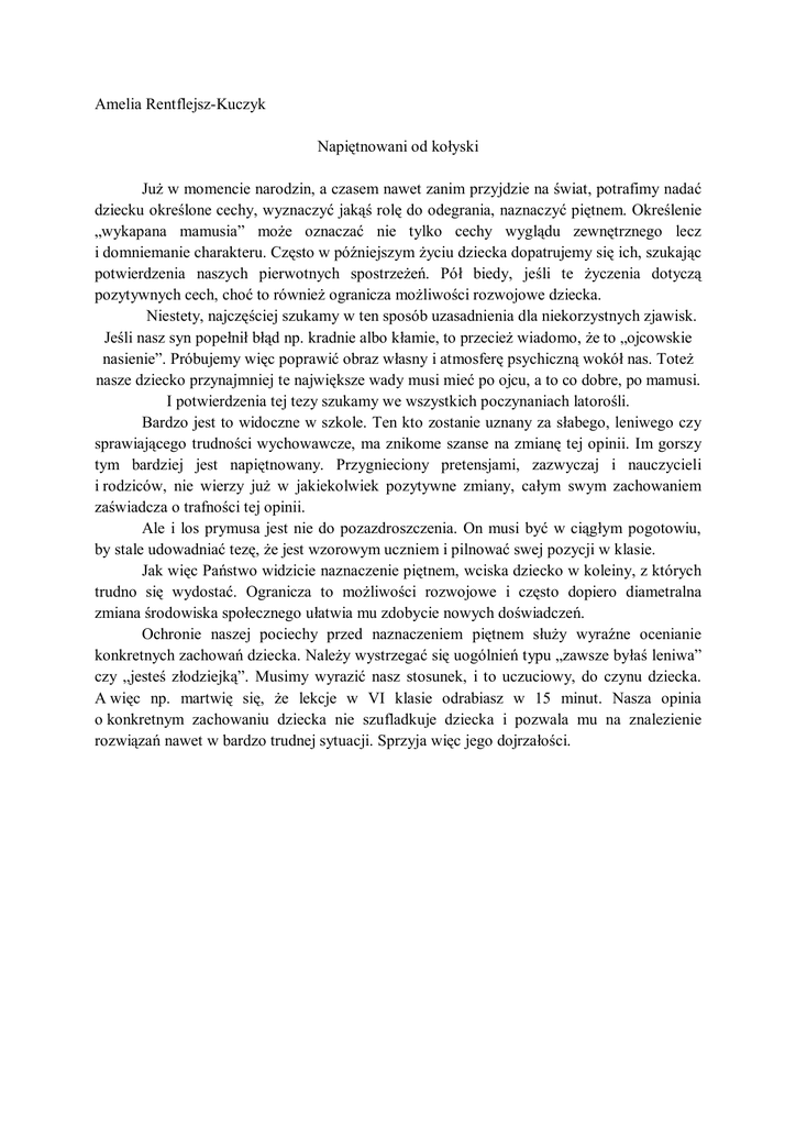 Amelia Rentflejsz-Kuczyk Napiętnowani od kołyski Już w momencie narodzin, a czasem nawet zanim przyjdzie na świat, potrafimy nadać dziecku określone cechy, wyznaczyć jakąś rolę do odegrania, naznaczyć piętnem. Określenie „wykapana mamusia” może oznaczać nie tylko cechy wyglądu zewnętrznego lecz i domniemanie charakteru. Często w późniejszym życiu dziecka dopatrujemy się ich, szukając potwierdzenia naszych pierwotnych spostrzeżeń. Pół biedy, jeśli te życzenia dotyczą pozytywnych cech, choć to również ogranicza możliwości rozwojowe dziecka. Niestety, najczęściej szukamy w ten sposób uzasadnienia dla niekorzystnych zjawisk. Jeśli nasz syn popełnił błąd np. kradnie albo kłamie, to przecież wiadomo, że to „ojcowskie nasienie”. Próbujemy więc poprawić obraz własny i atmosferę psychiczną wokół nas. Toteż nasze dziecko przynajmniej te największe wady musi mieć po ojcu, a to co dobre, po mamusi. I potwierdzenia tej tezy szukamy we wszystkich poczynaniach latorośli. Bardzo jest to widoczne w szkole. Ten kto zostanie uznany za słabego, leniwego czy sprawiającego trudności wychowawcze, ma znikome szanse na zmianę tej opinii. Im gorszy tym bardziej jest napiętnowany. Przygnieciony pretensjami, zazwyczaj i nauczycieli i rodziców, nie wierzy już w jakiekolwiek pozytywne zmiany, całym swym zachowaniem zaświadcza o trafności tej opinii. Ale i los prymusa jest nie do pozazdroszczenia. On musi być w ciągłym pogotowiu, by stale udowadniać tezę, że jest wzorowym uczniem i pilnować swej pozycji w klasie. Jak więc Państwo widzicie naznaczenie piętnem, wciska dziecko w koleiny, z których trudno się wydostać. Ogranicza to możliwości rozwojowe i często dopiero diametralna zmiana środowiska społecznego ułatwia mu zdobycie nowych doświadczeń. Ochronie naszej pociechy przed naznaczeniem piętnem służy wyraźne ocenianie konkretnych zachowań dziecka. Należy wystrzegać się uogólnień typu „zawsze byłaś leniwa” czy „jesteś złodziejką”. Musimy wyrazić nasz stosunek, i to uczuciowy, do czynu dziecka. A więc np. martwię się, że lekcje w VI klasie odrabiasz w 15 minut. Nasza opinia o konkretnym zachowaniu dziecka nie szufladkuje dziecka i pozwala mu na znalezienie rozwiązań nawet w bardzo trudnej sytuacji. Sprzyja więc jego dojrzałości.