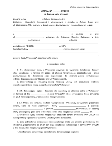 Projekt umowy na dostawę paliwa UMOWA NR _______ /KT/ZP/16 na dostawę paliw płynnych Zawarta w dniu ______________ w Zielonej Górze pomiędzy: Zakładem Gospodarki Komunalnej i Mieszkaniowej z siedzibą w Zielonej Górze przy ul. Zjednoczenia 110, zwanym w treści umowy „Zamawiającym” reprezentowanym przez: _________________________________________________________________________________ _________________________________________________________________________________, a z ________________________________________________ ul.___________________________, wpisanym do Krajowego siedzibą Rejestru w Sądowego przy w dniu ______________ pod numerem ___________________________ w Sądzie____________________ _________________________________________________________________________________ posiadającym REGON :________________________,nr NIP : ______________________________, kapitał zakładowy _________________________________, reprezentowanym przez: _________________________________________________________________________________ _________________________________________________________________________________, zwanym dalej „Wykonawcą”, została zawarta umowa o następującej treści: § 1.1. Zamawiający zleca, a Wykonawca przyjmuje do wykonania świadczenie dostawy oleju napędowego w terminie 24 godzin od złożenia telefonicznego zapotrzebowania Zamawiającego do dostarczenia oleju napędowego do zbiornika paliwa przez usytuowanego w Dziale Zagospodarowania Odpadów przy ul. Wrocławskiej 73. 2. Strony ustalają, że integralną częścią niniejszej umowy jest specyfikacja istotnych warunków zamówienia wraz z załącznikami oraz ofertą Wykonawcy. § 2.1. Zamawiający będzie dostarczał olej napędowy do zbiornika paliwa u Wykonawcy w terminie od dnia ______________ do dnia 31.12.2017r. lub do wyczerpania kwoty określonej w § 3.1. niniejszej umowy, w zależności co nastąpi wcześniej. § 3.1. Ustala się umowną wartość wynagrodzenia Wykonawcy za wykonanie przedmiotu umowy, która nie może przekroczyć kwoty __________________________ zł (słownie: ____________________________) w tym VAT _____________________ zł wynikającą ze złożonej oferty przetargowej gdzie cena jednostkowa netto oleju napędowego wynosi: ________ zł/l . 2. Oferowana wyżej cena oleju napędowego odpowiada cenom producenta PKN ORLEN na dzień publikacji ogłoszenia w Dzienniku Urzędowym Unii Europejskiej. 3. Cena jednostkowa oferowanego oleju napędowego może ulec zmianie (podwyższeniu lub obniżeniu), proporcjonalnie do zmian cen oleju napędowego ogłoszonego w cenniku PKN ORLEN z dnia zakupu oleju napędowego przez Wykonawcę. 4. Każda zmiana ceny wymaga powiadomienia Zamawiającego na piśmie. 1 Projekt umowy na dostawę paliwa 5. Wykonawca gwarantuje utrzymanie stałej marży w wysokości _____ zł / l. 6. Cena podana na fakturze wynika z ceny określonej w ust. 3 i z określonej stałej marży w ust.5 plus należny podatek VAT. § 4.1. Strony postanawiają, że rozliczenie za przedmiot umowy odbywać będzie się na podstawie faktury wystawionej przez Wykonawcę po każdorazowej dostawie oleju napędowego do zbiornika. 2. Faktury płatne będą w terminie 21 dni od daty ich otrzymania przez Zamawiającego na konto Wykonawcy nr ___________________________________________________________ . § 5. Zamawiający ma obowiązek zapłaty faktury w terminie 21 dni licząc od daty jej otrzymania. § 6.1. Olej napędowy sprzedawany przez Wykonawcę w ramach niniejszej umowy będzie zgodny pod każdym względem z właściwą Polską Normą. 2. Zamawiający w przypadku stwierdzenia wad jakościowych oleju napędowego w trakcie realizacji zamówienia zastrzega sobie prawo żądania dostarczenia badania składu frakcyjnego i zawartości zanieczyszczeń oleju napędowego próbki paliwa - pobranej przy udziale Zamawiającego ze zbiornika Wykonawcy. 3. Koszty ekspertyzy poniesie Strona: 1) Zamawiający w przypadku zgodności badanej próbki z Polską Normą; 2) Wykonawca w przypadku braku zgodności badanej próbki z Polską Normą. 4. Wszelkie udokumentowane koszty powstałe w następstwie złej jakości oleju napędowego zostaną pokryte przez Wykonawcę. § 7.1. Zamawiający odstąpi od umowy jeżeli Wykonawca: 1) pomimo 2-krotnych pisemnych zastrzeżeń ze strony Zamawiającego wykonuje usługę wadliwie, niezgodnie z opisem przedmiotu zamówienia zawartym w siwz oraz warunkami niniejszej umowy, a także nie reaguje na polecenia Zamawiającego dotyczące poprawek i zmian sposobu wykonania w wyznaczonym przez Zamawiającego terminie; 2) zostanie postawiony w stan likwidacji. 2. Wykonawca może odstąpić od umowy jeżeli Zamawiający wykazuje opóźnienia w płatnościach faktur dłuższe niż 21 dni. 3. W razie odstąpienia od umowy z przyczyn zawinionych przez jedną ze Stron, Strona z której winy odstąpiono od umowy, zobowiązana jest zapłacić drugiej Stronie karę umowną w wysokości 20% wynagrodzenia umownego brutto (§ 3 ust.1 umowy). 4. W przypadku przedterminowego zerwania niniejszej umowy przez Wykonawcę, zapłaci on Zamawiającemu karę w wysokości 20% wynagrodzenia umownego brutto (§ 3 ust.1umowy). 5. Roszczenie o zapłatę kar umownych staje się wymagalne z dniem zaistnienia określonych w niniejszej umowie podstaw do ich naliczenia. 2 Projekt umowy na dostawę paliwa 6. Wykonawcy nie przysługuje odszkodowanie za odstąpienie Zamawiającego od umowy z winy Wykonawcy. 7. W przypadku odstąpienia lub rozwiązania umowy Strony zachowują prawo egzekucji kar umownych. § 8. Strony zastrzegają sobie prawo do dochodzenia kar umownych za niezgodne z niniejszą umową lub nienależyte wykonanie zobowiązań wynikających z umowy, przy czym Zamawiający ma prawo potrącenia kar umownych z bieżących faktur. § 9.1. Strony ustalają, że obowiązującą je formą odszkodowania są kary umowne. Wykonawca płaci Zamawiającemu karę umowną za zwłokę w wystawieniu faktury w wysokoś