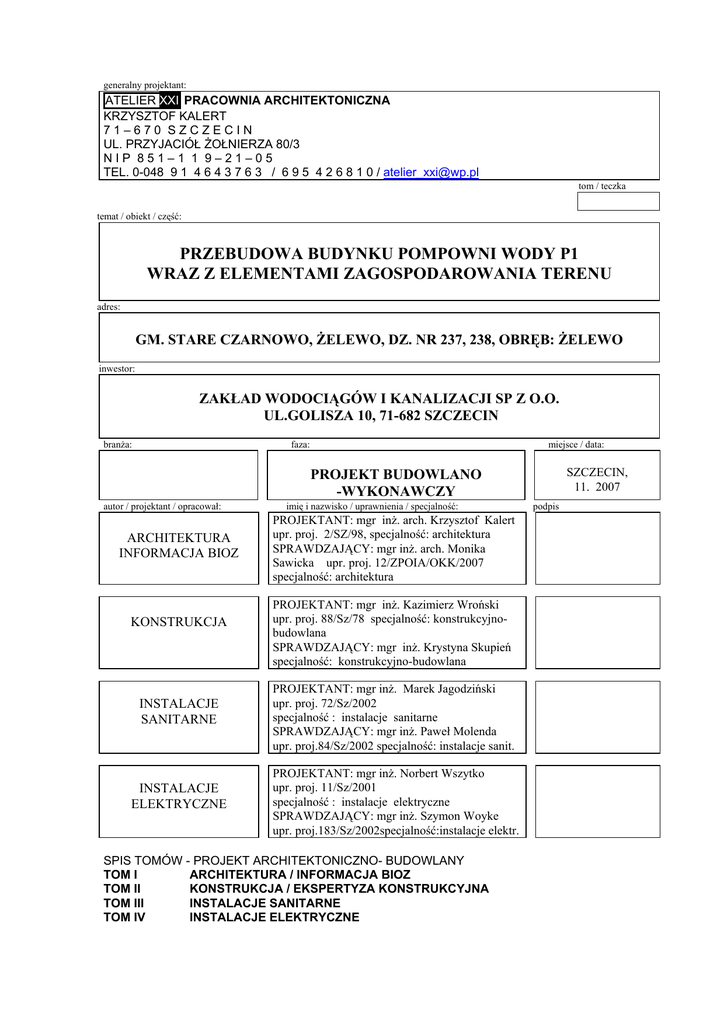 generalny projektant: ATELIER XXI PRACOWNIA ARCHITEKTONICZNA KRZYSZTOF KALERT 71–670 SZCZECIN UL. PRZYJACIÓŁ ŻOŁNIERZA 80/3 NIP 851–1 1 9–21–05 TEL. 0-048 9 1 4 6 4 3 7 6 3 / 6 9 5 4 2 6 8 1 0 / [email protected] tom / teczka temat / obiekt / część: PRZEBUDOWA BUDYNKU POMPOWNI WODY P1 WRAZ Z ELEMENTAMI ZAGOSPODAROWANIA TERENU adres: GM. STARE CZARNOWO, ŻELEWO, DZ. NR 237, 238, OBRĘB: ŻELEWO inwestor: ZAKŁAD WODOCIĄGÓW I KANALIZACJI SP Z O.O. UL.GOLISZA 10, 71-682 SZCZECIN branża: faza: miejsce / data: SZCZECIN, 11. 2007 PROJEKT BUDOWLANO -WYKONAWCZY autor / projektant / opracował: ARCHITEKTURA INFORMACJA BIOZ KONSTRUKCJA imię i nazwisko / uprawnienia / specjalność: PROJEKTANT: mgr inż. arch. Krzysztof Kalert upr. proj. 2/SZ/98, specjalność: architektura SPRAWDZAJĄCY: mgr inż. arch. Monika Sawicka upr. proj. 12/ZPOIA/OKK/2007 specjalność: architektura PROJEKTANT: mgr inż. Kazimierz Wroński upr. proj. 88/Sz/78 specjalność: konstrukcyjnobudowlana SPRAWDZAJĄCY: mgr inż. Krystyna Skupień specjalność: konstrukcyjno-budowlana INSTALACJE SANITARNE PROJEKTANT: mgr inż. Marek Jagodziński upr. proj. 72/Sz/2002 specjalność : instalacje sanitarne SPRAWDZAJĄCY: mgr inż. Paweł Molenda upr. proj.84/Sz/2002 specjalność: instalacje sanit. INSTALACJE ELEKTRYCZNE PROJEKTANT: mgr inż. Norbert Wszytko upr. proj. 11/Sz/2001 specjalność : instalacje elektryczne SPRAWDZAJĄCY: mgr inż. Szymon Woyke upr. proj.183/Sz/2002specjalność:instalacje elektr. SPIS TOMÓW - PROJEKT ARCHITEKTONICZNO- BUDOWLANY TOM I ARCHITEKTURA / INFORMACJA BIOZ TOM II KONSTRUKCJA / EKSPERTYZA KONSTRUKCYJNA TOM III INSTALACJE SANITARNE TOM IV INSTALACJE ELEKTRYCZNE podpis generalny projektant: ATELIER XXI PRACOWNIA ARCHITEKTONICZNA KRZYSZTOF KALERT 71–670 SZCZECIN UL. PRZYJACIÓŁ ŻOŁNIERZA 80/3 NIP 851–1 1 9–21–05 TEL. 0-048 9 1 4 6 4 3 7 6 3 / 6 9 5 4 2 6 8 1 0 SZCZECIN 20.08.2008 tom / teczka I temat / obiekt / część: PRZEBUDOWA BUDYNKU POMPOWNI WODY P1 WRAZ Z ELEMENTAMI ZAGOSPODAROWANIA TERENU adres: GM. STARE CZARNOWO, ŻELEWO, DZ. NR 237, 238, OBRĘB: ŻELEWO inwestor: ZAKŁAD WODOCIĄGÓW I KANALIZACJI SP Z O.O. UL.GOLISZA 10, 71-682 SZCZECIN branża: faza: miejsce / data: PROJEKT BUDOWLANO -WYKONAWCZY SZCZECIN, 08. 2007 Oświadczam, że projekt budowlany sporządzono zgodnie z obowiązującymi przepisami oraz zasadami wiedzy technicznej (zgodnie z art. 20 ustawy Prawo Budowlane). autor / projektant / opracował: ARCHITEKTURA INFORMACJA BIOZ imię i nazwisko / uprawnienia / specjalność: podpis PROJEKTANT: mgr inż. arch. Krzysztof Kalert ZP-0383 upr. proj. 2/Sz/98 specjalność: architektura SPRAWDZAJĄCY: mgr inż. arch. Monika Sawicka upr. proj. 12/ZPOIA/OKK/2007 specjalność: architektura 2 2. SPIS ZAWARTOŚCI OPRACOWANIA 1. 2. 3. 4. 5. 6. Karta tytułowa Spis zawartości opracowania Spis rysunków Spis dokumentów i uzgodnień Opis techniczny projektu architektoniczno-budowlanego. Rysunki 3. SPIS RYSUNKÓW PB/A/01 PB/A/02 PB/A/03 PB/A/04 PB/A/05 PB/A/06 PB/A/07 PB/A/08 PB/A/09 PB/A/10 PB/A/11 PB/A/12 PB/A/13 Projekt zagospodarowania terenu Rzut piwnicy, Rzut parteru, Rzut dachu Przekrój A-A Przekrój B-B Elewacje wschodnia, północna Elewacje zachodnia, południowa Budynek B gospodarczy – rzut, elewacje Zestawienie stolarki drzwiowej, krat stalowych Zestawienie klap i stolarki okiennej Detal ogrodzenia Schemat usytuowania ogrodzenia, detal drabiny 1:500 1:100 1:100 1:100 1:100 1:100 1:100 1:100 1:100 1:100 1:100 1:25 1:20 4. SPIS DOKUMENTÓW I UZGODNIEŃ 4.1. 4.2. 4.3. 4.4. 4.5. 4.7. 4.8. 4.9. 4.10. 4.11. 4.12. 4.13. Karta rejestracyjna wtórnika geodezyjnego Uprawnienia projektowe i zaświadczenia o przynależności do Izby Architektów i Urbanistów wydane dla pana Krzysztofa Kalerta Uprawnienia projektowe i zaświadczenia o przynależności do Izby Architektów i Urbanistów wydane dla pani Moniki Sawickiej. Uprawnienia i zaświadczenie o przynależności do Izby Inżynierów i Techników Budownictwa wydane dla pana Kazimierza Wrońskiego Uprawnienia i zaświadczenie o przynależności do Izby Inżynierów i Techników Budownictwa wydane dla pani Krystyny Skupień Uprawnienia i zaświadczenie o przynależności do Izby Inżynierów i Techników Budownictwa wydane dla pana Marka Jagodzińskiego. Uprawnienia i zaświadczenie o przynależności do Izby Inżynierów i Techników Budownictwa wydane dla pana Pawła Molendy Uprawnienia i zaświadczenie o przynależności do Izby Inżynierów i Techników Budownictwa wydane dla pana Norberta Wszytko. Uprawnienia i zaświadczenie o przynależności do Izby Inżynierów i Techników Budownictwa wydane dla pana Szymona Woyke. Uzgodnienie z rzeczoznawcą p.poż (oryginały na rysunkach). Uzgodnienie w zakresie san.-epid (oryginały na rysunkach). Uzgodnienie z rzeczoznawcą BHP (oryginały na rysunkach). 3 5. I. OPIS TECHNICZNY PROJEKTU ARCHITEKTONICZNO –BUDOWLANEGO PRZEBUDOWY BUDYNKU POMPOWNI WODY P1 WRAZ Z ELEMENTAMI ZAGOSPODAROWANIA TERENU PROJEKT ZAGOSPODAROWANIA TERENU 1. PRZEDMIOT INWESTYCJI Przedmiotem inwestycji jest projekt architektoniczno-budowlany przebudowy budynku pompowni wody P1 wraz z elementami zagospodarowania terenu polegający na: BUDYNEK A – POMPOWNIA P1 a. wykonaniu nowej kolorystyki oraz remontu elewacji, wraz z zamurowaniem lub wymianą okien i drzwi, remoncie daszków nad wejściem, likwidacją świetlików dachowych, dociepleniu stropodachu i wymianie pokrycia dachu. b. wewnątrz na wyburzeniu poszczególnych ścianek działowych, zamurowaniu otworów drzwiowych, zamurowaniu otworów w stropie po kolumnach do zasów, wykonaniu nowych ścian działowych, zamknięciu obudowie schodów wejściowych, c. remoncie ścian wewnętrznych i stropów z zabezpieczeniem antykorozyjnym, wykonaniu poręczy i balustrad wewnętrznych, wyminie i wykonaniu nowej instalacji elektrycznej wewnętrznej i odgromowej, wyminie i wykonaniu nowej instalacji wod-kan i dostosowaniu instalacji co z fragmentarycz