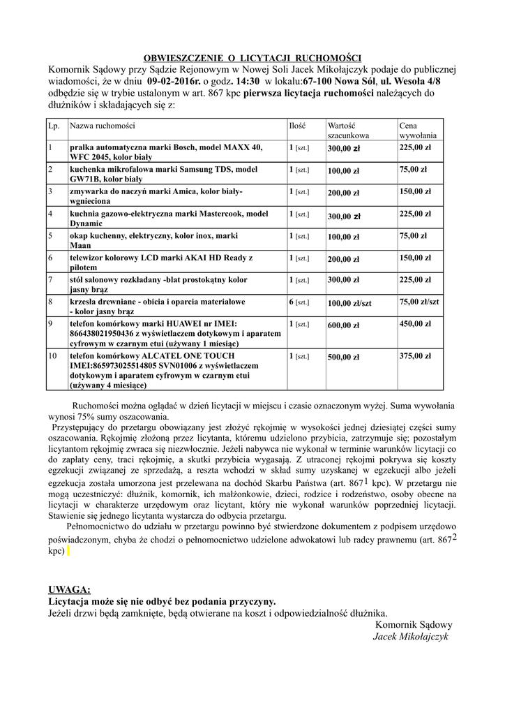 OBWIESZCZENIE O LICYTACJI RUCHOMOŚCI Komornik Sądowy przy Sądzie Rejonowym w Nowej Soli Jacek Mikołajczyk podaje do publicznej wiadomości, że w dniu 09-02-2016r. o godz. 14:30 w lokalu:67-100 Nowa Sól, ul. Wesoła 4/8 odbędzie się w trybie ustalonym w art. 867 kpc pierwsza licytacja ruchomości należących do dłużników i składających się z: Lp. Nazwa ruchomości Ilość Wartość szacunkowa 1 pralka automatyczna marki Bosch, model MAXX 40, WFC 2045, kolor biały kuchenka mikrofalowa marki Samsung TDS, model GW71B, kolor biały zmywarka do naczyń marki Amica, kolor białywgnieciona kuchnia gazowo-elektryczna marki Mastercook, model Dynamic okap kuchenny, elektryczny, kolor inox, marki Maan telewizor kolorowy LCD marki AKAI HD Ready z pilotem stół salonowy rozkładany -blat prostokątny kolor jasny brąz krzesła drewniane - obicia i oparcia materiałowe - kolor jasny brąz telefon komórkowy marki HUAWEI nr IMEI: 866438021950436 z wyświetlaczem dotykowym i aparatem cyfrowym w czarnym etui (używany 1 miesiąc) telefon komórkowy ALCATEL ONE TOUCH IMEI:865973025514805 SVN01006 z wyświetlaczem dotykowym i aparatem cyfrowym w czarnym etui (używany 4 miesiące) 1 [szt.] 300,00 zł Cena wywołania 225,00 zł 1 [szt.] 100,00 zł 75,00 zł 1 [szt.] 200,00 zł 150,00 zł 1 [szt.] 300,00 zł 225,00 zł 1 [szt.] 100,00 zł 75,00 zł 1 [szt.] 200,00 zł 150,00 zł 1 [szt.] 300,00 zł 225,00 zł 6 [szt.] 100,00 zł/szt 75,00 zł/szt 1 [szt.] 600,00 zł 450,00 zł 1 [szt.] 500,00 zł 375,00 zł 2 3 4 5 6 7 8 9 10 Ruchomości można oglądać w dzień licytacji w miejscu i czasie oznaczonym wyżej. Suma wywołania wynosi 75% sumy oszacowania. Przystępujący do przetargu obowiązany jest złożyć rękojmię w wysokości jednej dziesiątej części sumy oszacowania. Rękojmię złożoną przez licytanta, któremu udzielono przybicia, zatrzymuje się; pozostałym licytantom rękojmię zwraca się niezwłocznie. Jeżeli nabywca nie wykonał w terminie warunków licytacji co do zapłaty ceny, traci rękojmię, a skutki przybicia wygasają. Z utraconej rękojmi pokrywa się koszty egzekucji związanej ze sprzedażą, a reszta wchodzi w skład sumy uzyskanej w egzekucji albo jeżeli egzekucja została umorzona jest przelewana na dochód Skarbu Państwa (art. 867 1 kpc). W przetargu nie mogą uczestniczyć: dłużnik, komornik, ich małżonkowie, dzieci, rodzice i rodzeństwo, osoby obecne na licytacji w charakterze urzędowym oraz licytant, który nie wykonał warunków poprzedniej licytacji. Stawienie się jednego licytanta wystarcza do odbycia przetargu. Pełnomocnictwo do udziału w przetargu powinno być stwierdzone dokumentem z podpisem urzędowo poświadczonym, chyba że chodzi o pełnomocnictwo udzielone adwokatowi lub radcy prawnemu (art. 867 2 kpc) UWAGA: Licytacja może się nie odbyć bez podania przyczyny. Jeżeli drzwi będą zamknięte, będą otwierane na koszt i odpowiedzialność dłużnika. Komornik Sądowy Jacek Mikołajczyk