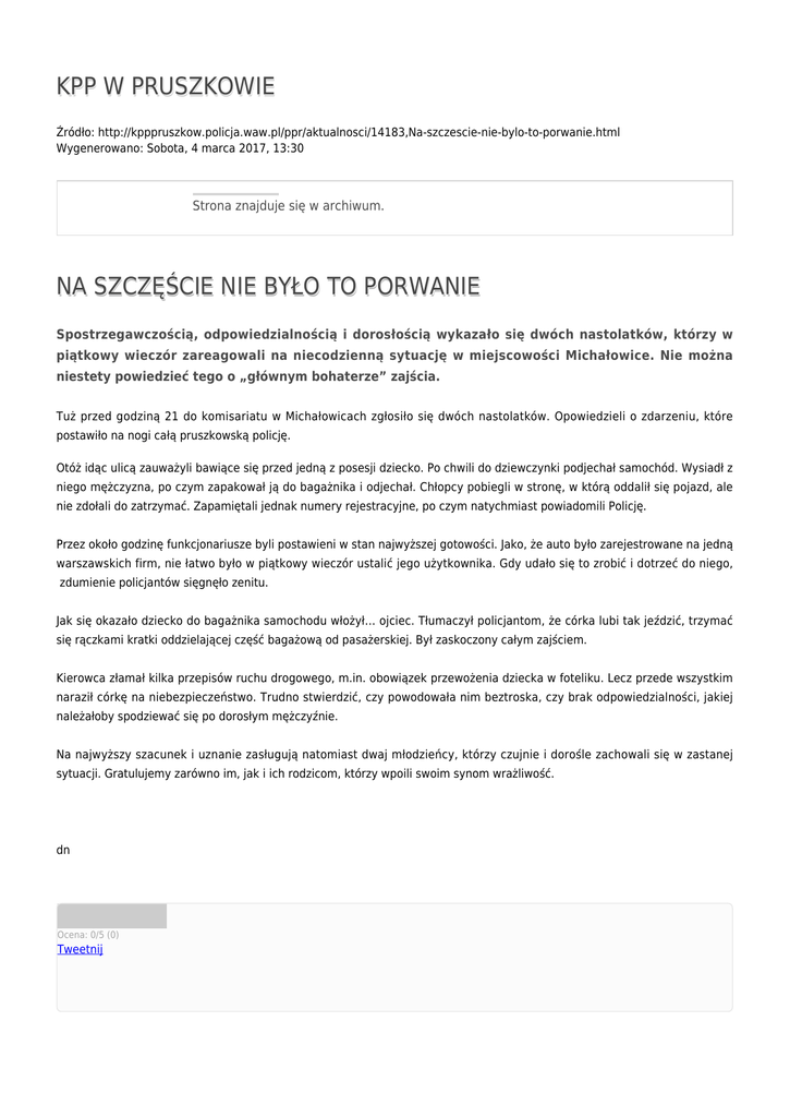 KPP W PRUSZKOWIE Źródło: http://kpppruszkow.policja.waw.pl/ppr/aktualnosci/14183,Na-szczescie-nie-bylo-to-porwanie.html Wygenerowano: Sobota, 4 marca 2017, 13:30 Strona znajduje się w archiwum. NA SZCZĘŚCIE NIE BYŁO TO PORWANIE Spostrzegawczością, odpowiedzialnością i dorosłością wykazało się dwóch nastolatków, którzy w piątkowy wieczór zareagowali na niecodzienną sytuację w miejscowości Michałowice. Nie można niestety powiedzieć tego o „głównym bohaterze” zajścia. Tuż przed godziną 21 do komisariatu w Michałowicach zgłosiło się dwóch nastolatków. Opowiedzieli o zdarzeniu, które postawiło na nogi całą pruszkowską policję. Otóż idąc ulicą zauważyli bawiące się przed jedną z posesji dziecko. Po chwili do dziewczynki podjechał samochód. Wysiadł z niego mężczyzna, po czym zapakował ją do bagażnika i odjechał. Chłopcy pobiegli w stronę, w którą oddalił się pojazd, ale nie zdołali do zatrzymać. Zapamiętali jednak numery rejestracyjne, po czym natychmiast powiadomili Policję. Przez około godzinę funkcjonariusze byli postawieni w stan najwyższej gotowości. Jako, że auto było zarejestrowane na jedną warszawskich firm, nie łatwo było w piątkowy wieczór ustalić jego użytkownika. Gdy udało się to zrobić i dotrzeć do niego, zdumienie policjantów sięgnęło zenitu. Jak się okazało dziecko do bagażnika samochodu włożył… ojciec. Tłumaczył policjantom, że córka lubi tak jeździć, trzymać się rączkami kratki oddzielającej część bagażową od pasażerskiej. Był zaskoczony całym zajściem. Kierowca złamał kilka przepisów ruchu drogowego, m.in. obowiązek przewożenia dziecka w foteliku. Lecz przede wszystkim naraził córkę na niebezpieczeństwo. Trudno stwierdzić, czy powodowała nim beztroska, czy brak odpowiedzialności, jakiej należałoby spodziewać się po dorosłym mężczyźnie. Na najwyższy szacunek i uznanie zasługują natomiast dwaj młodzieńcy, którzy czujnie i dorośle zachowali się w zastanej sytuacji. Gratulujemy zarówno im, jak i ich rodzicom, którzy wpoili swoim synom wrażliwość. dn Ocena: 0/5 (0) Tweetnij
