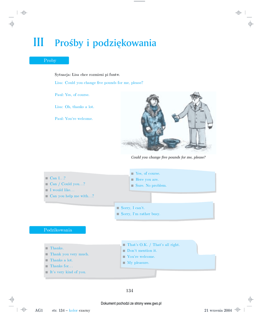 III Prośby i podziękowania Could you change five pounds for me, please? # $ % & ! " ! $ ! $ ! & ' ' ' ' ! ' ( " ' ) * Dokument pochodzi ze strony www.gwo.pl III. Prośby i podziękowania 1 Sformułuj prośby według wzoru. Wykorzystaj podane czasowniki. change the channel on TV 1. your bike 2. your phone borrow go use listen Can I change the channel? ................................................................................................................................................................. ..................................................................................................................................................................................... ................................................................................................................................................................................ 3. more pocket money 2 get ............................................................................................................................................................. 4. to the news ................................................................................................................................................................................ 5. to the party ................................................................................................................................................................................ Chcesz, aby zrobiono coś dla ciebie. Sformułuj odpowiednie prośby. You want somebody to: Could you lend me some money? lend you some money 1. open the window ....................................................................................................................................................... .................................................................................................................................................................. 2. pick you up after school 3. post a letter for you 4. peel the potatoes ............................................................................................................................................................. ................................................................................................................................................................... 5. explain a maths problem 3 .................................................................................................................................................. ................................................................................................................................................. Ułóż zdania w języku angielskim, których użyjesz w podanych sytuacjach. Wyjeżdżasz i chcesz, żeby siostra podlewała kwiaty. Could you water the flowers? ................................................................................................................................................................................................................... 1. W pokoju brata radio gra głośno i nie możesz się skupić. ................................................................................................................................................................................................................... 2. Chcesz, żeby mama obudziła cię jutro o siódmej rano. ................................................................................................................................................................................................................... 3. Chcesz się napić zimnego mleka, a babcia właśnie otwiera lodówkę. ................................................................................................................................................................................................................... 4. Musisz się przygotować do testu z matematyki. Twój kolega jest dobry z tego przedmiotu. ................................................................................................................................................................................................................... Dokument pochodzi ze strony www.gwo.pl