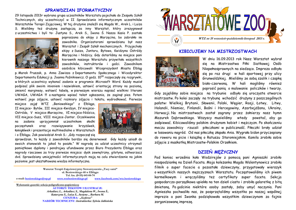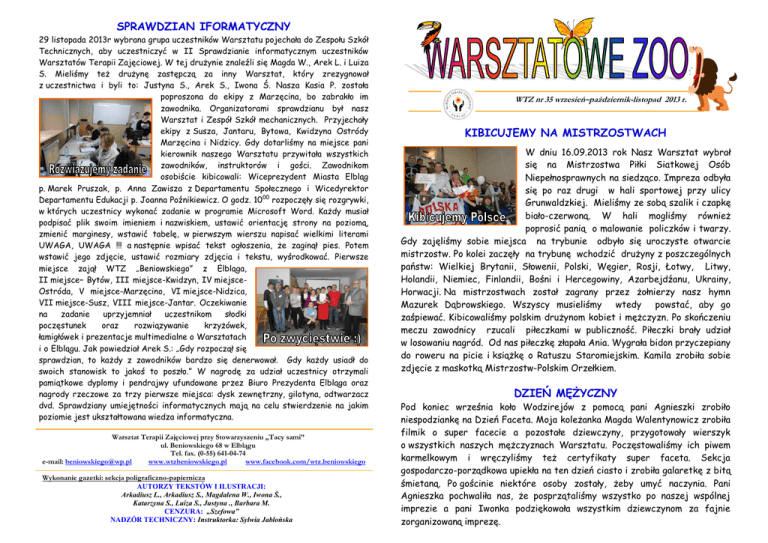 SPRAWDZIAN IFORMATYCZNY 29 listopada 2013r wybrana grupa uczestników Warsztatu pojechała do Zespołu Szkół Technicznych, aby uczestniczyć w II Sprawdzianie informatycznym uczestników Warsztatów Terapii Zajęciowej. W tej drużynie znaleźli się Magda W., Arek L. i Luiza S. Mieliśmy też drużynę zastępczą za inny Warsztat, który zrezygnował z uczestnictwa i byli to: Justyna S., Arek S., Iwona Ś. Nasza Kasia P. została poproszona do ekipy z Marzęcina, bo zabrakło im zawodnika. Organizatorami sprawdzianu był nasz Warsztat i Zespół Szkół mechanicznych. Przyjechały ekipy z Susza, Jantaru, Bytowa, Kwidzyna Ostródy Marzęcina i Nidzicy. Gdy dotarliśmy na miejsce pani kierownik naszego Warsztatu przywitała wszystkich zawodników, instruktorów i gości. Zawodnikom osobiście kibicowali: Wiceprezydent Miasta Elbląg p. Marek Pruszak, p. Anna Zawisza z Departamentu Społecznego i Wicedyrektor Departamentu Edukacji p. Joanna Poźnikiewicz. O godz. 1000 rozpoczęły się rozgrywki, w których uczestnicy wykonać zadanie w programie Microsoft Word. Każdy musiał podpisać plik swoim imieniem i nazwiskiem, ustawić orientację strony na poziomą, zmienić marginesy, wstawić tabelę, w pierwszym wierszu napisać wielkimi literami UWAGA, UWAGA !!! a następnie wpisać tekst ogłoszenia, że zaginął pies. Potem wstawić jego zdjęcie, ustawić rozmiary zdjęcia i tekstu, wyśrodkować. Pierwsze miejsce zajął WTZ „Beniowskiego” z Elbląga, II miejsce– Bytów, III miejsce-Kwidzyn, IV miejsceOstróda, V miejsce-Marzęcino, VI miejsce-Nidzica, VII miejsce-Susz, VIII miejsce-Jantar. Oczekiwanie na zadanie uprzyjemniał uczestnikom słodki poczęstunek oraz rozwiązywanie krzyżówek, łamigłówek i prezentacje multimedialne o Warsztatach i o Elblągu. Jak powiedział Arek S.: „Gdy rozpoczął się sprawdzian, to każdy z zawodników bardzo się denerwował. Gdy każdy usiadł do swoich stanowisk to jakoś to poszło.” W nagrodę za udział uczestnicy otrzymali pamiątkowe dyplomy i pendrajwy ufundowane przez Biuro Prezydenta Elbląga oraz nagrody rzeczowe za trzy pierwsze miejsca: dysk zewnętrzny, gilotyna, odtwarzacz dvd. Sprawdziany umiejętności informatycznych mają na celu stwierdzenie na jakim poziomie jest ukształtowana wiedza informatyczna. Warsztat Terapii Zajęciowej przy Stowarzyszeniu „Tacy sami” ul. Beniowskiego 68 w Elblągu Tel. fax. (0-55) 641-04-74 e-mail: [email protected] www.wtzbeniowskiego.pl www.facebook.com/wtz.beniowskiego Wykonanie gazetki: sekcja poligraficzno-papiernicza AUTORZY TEKSTÓW I ILUSTRACJI: Arkadiusz L., Arkadiusz S., Magdalena W., Iwona Ś., Katarzyna S., Luiza S., Justyna ., Barbara M. CENZURA: „Szefowa” NADZÓR TECHNICZNY: Instruktorka: Sylwia Jabłońska WTZ nr 35 wrzesień–październik-listopad 2013 r. KIBICUJEMY NA MISTRZOSTWACH W dniu 16.09.2013 rok Nasz Warsztat wybrał się na Mistrzostwa Piłki Siatkowej Osób Niepełnosprawnych na siedząco. Impreza odbyła się po raz drugi w hali sportowej przy ulicy Grunwaldzkiej. Mieliśmy ze sobą szalik i czapkę biało-czerwoną. W hali mogliśmy również poprosić panią o malowanie policzków i twarzy. Gdy zajęliśmy sobie miejsca na trybunie odbyło się uroczyste otwarcie mistrzostw. Po kolei zaczęły na trybunę wchodzić drużyny z poszczególnych państw: Wielkiej Brytanii, Słowenii, Polski, Węgier, Rosji, Łotwy, Litwy, Holandii, Niemiec, Finlandii, Bośni i Hercegowiny, Azarbejdźanu, Ukrainy, Horwacji. Na mistrzostwach został zagrany przez żołnierzy nasz hymn Mazurek Dąbrowskiego. Wszyscy musieliśmy wtedy powstać, aby go zaśpiewać. Kibicowaliśmy polskim drużynom kobiet i mężczyzn. Po skończeniu meczu zawodnicy rzucali piłeczkami w publiczność. Piłeczki brały udział w losowaniu nagród. Od nas piłeczkę złapała Ania. Wygrała bidon przyczepiany do roweru na picie i książkę o Ratuszu Staromiejskim. Kamila zrobiła sobie zdjęcie z maskotką Mistrzostw-Polskim Orzełkiem. DZIEŃ MĘŻYCZNY Pod koniec września koło Wodzirejów z pomocą pani Agnieszki zrobiło niespodziankę na Dzień Faceta. Moja koleżanka Magda Walentynowicz zrobiła filmik o super facecie a pozostałe dziewczyny, przygotowały wierszyk o wszystkich naszych mężczyznach Warsztatu. Poczęstowaliśmy ich piwem karmelkowym i wręczyliśmy też certyfikaty super faceta. Sekcja gospodarczo-porządkowa upiekła na ten dzień ciasto i zrobiła galaretkę z bitą śmietaną. Po gościnie niektóre osoby zostały, żeby umyć naczynia. Pani Agnieszka pochwaliła nas, że posprzątaliśmy wszystko po naszej wspólnej imprezie a pani Iwonka podziękowała wszystkim dziewczynom za fajnie zorganizowaną imprezę. WIZYTA UCZNIÓW 13 listopada do naszego Warsztatu przyszli uczniowie ze Specjalnego Ośrodka Szkolno Wychowawczego nr 1 w Elblągu przy ul. Kopernika z klasy I i III ze swoimi nauczycielami. Uczniowie przyszli po to, aby zobaczyć co uczestnicy robią w poszczególnych sekcjach. Zaczęli zwiedzać Warsztat a oprowadzała ich nasza p. kierownik, która opowiadała co uczestnicy robią w danej sekcji. Potem uczniowie mieli okazję brać udział w zajęciach sekcji, w której im najbardziej się podobało. W sekcji poligraficznej papierniczej pani Sylwia przygotowała dla uczni układanie puzzli na komputerze Shreka. Wychodziło im naprawdę dobrze. Potem przepisywali tekst. Uczniowie mówili nam, że za rok jak skończą szkołę to chcieliby przyjść do naszego Warsztatu. JUBILEUSZ 20 LECIA NASZEGO WARSZTATU 11 września 2013 r. w kinie „Orzeł” odbył się jubileusz dwudziestolecia naszego Warsztatu oraz trzydziestolecia Dziennego Domu, który istniał przed Warsztatami. Pomysłodawczynią utworzenia Dziennego Domu dla osób z zaburzeniami neuropsychiatrycznymi była pani Anna Szyszka. Dziś są to Środowiskowe Domy Samopomocy. Prowadzącą cały jubileusz była dziennikarka pani Mira Stankiewicz i nasza szefowa. Rozpoczął się on uroczystym powitaniem