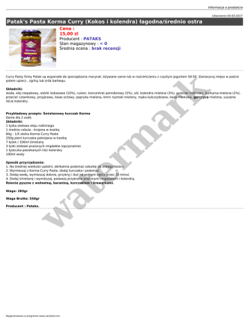 Informacje o produkcie Utworzono 04-03-2017 Patak's Pasta Korma Curry (Kokos i kolendra) łagodna/średnio ostra Cena : 15,00 zl Producent : PATAKS Stan magazynowy : < 0 Średnia ocena : brak recenzji Curry Pasty firmy Patak są wspaniałe do sporządzania marynat..Używane same lub w rozcieńczeniu z czystym jogurtem 50:50. Zamarynuj mięso w paście potem upiecz , zgriluj lub zrób barbequ. er m ar k Składniki: woda, olej rzepakowy, wiórki kokosowe (10%), cukier, koncentrat pomidorowy (5%), sól, kolendra mielona (3%), przecier imbirowy, kurkuma mielona (2%), przecier czosnkowy, przyprawy, kwas octowy, papryka mielona, kmin rzymski mielony, mąka kukurydziana, kwas mlekowy, gorczyca mielona, suszone liście kolendry. Przykładowy przepis: Śmietanowy kurczak Korma Danie dla 2 osób Składniki: 1 łyżka stołowa oleju roślinnego 1 średnia cebula - krojona w kostkę 60g - 1/5 słoika Korma Curry Paste 250g pierś kurczaka pokrojona w kostkę 7 łyżek / 100ml śmietany 3 łyżki stołowe prażonych migdałów (opcjonalnie) 1 łyżeczka posiekanych liści kolendry 100ml wody Waga: 283gr Waga Brutto: 550gr w Producent : Pataks. at Sposób przyrządzania: 1. Na średniej wielkości patelni, delikatnie podsmaż cebulkę do złotego koloru. 2. Wymieszaj z Korma Curry Paste, dodaj kurczaka i podsmaż. 3. Dodaj wodę, wymieszaj dobrze, przykryj i duś na wolnym ogniu przez 20 minut. 4. Dodaj śmietanę i wymieszaj, podawaj przybrane prażonymi migadałami i kolendrą. Równie pyszne z wołowiną, baraniną, kurczakiem i krewetkami. Wygenerowano w programie www.oscGold.com