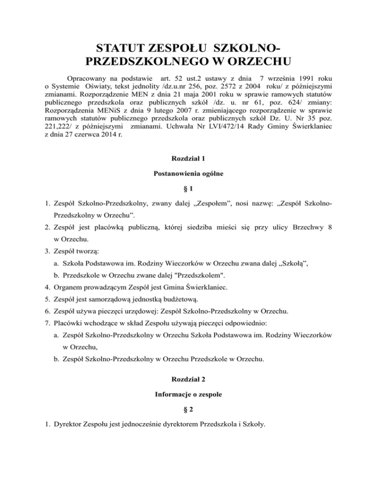 STATUT ZESPOŁU SZKOLNOPRZEDSZKOLNEGO W ORZECHU Opracowany na podstawie art. 52 ust.2 ustawy z dnia 7 września 1991 roku o Systemie Oświaty, tekst jednolity /dz.u.nr 256, poz. 2572 z 2004 roku/ z późniejszymi zmianami. Rozporządzenie MEN z dnia 21 maja 2001 roku w sprawie ramowych statutów publicznego przedszkola oraz publicznych szkół /dz. u. nr 61, poz. 624/ zmiany: Rozporządzenia MENiS z dnia 9 lutego 2007 r. zmieniającego rozporządzenie w sprawie ramowych statutów publicznego przedszkola oraz publicznych szkół Dz. U. Nr 35 poz. 221,222/ z późniejszymi zmianami. Uchwała Nr LVI/472/14 Rady Gminy Świerklaniec z dnia 27 czerwca 2014 r. Rozdział 1 Postanowienia ogólne §1 1. Zespół Szkolno-Przedszkolny, zwany dalej „Zespołem”, nosi nazwę: „Zespół SzkolnoPrzedszkolny w Orzechu”. 2. Zespół jest placówką publiczną, której siedziba mieści się przy ulicy Brzechwy 8 w Orzechu. 3. Zespół tworzą: a. Szkoła Podstawowa im. Rodziny Wieczorków w Orzechu zwana dalej „Szkołą”, b. Przedszkole w Orzechu zwane dalej "Przedszkolem". 4. Organem prowadzącym Zespół jest Gmina Świerklaniec. 5. Zespół jest samorządową jednostką budżetową. 6. Zespół używa pieczęci urzędowej: Zespół Szkolno-Przedszkolny w Orzechu. 7. Placówki wchodzące w skład Zespołu używają pieczęci odpowiednio: a. Zespół Szkolno-Przedszkolny w Orzechu Szkoła Podstawowa im. Rodziny Wieczorków w Orzechu, b. Zespół Szkolno-Przedszkolny w Orzechu Przedszkole w Orzechu. Rozdział 2 Informacje o zespole §2 1. Dyrektor Zespołu jest jednocześnie dyrektorem Przedszkola i Szkoły. 2. Połączenie nie narusza odrębności rad pedagogicznych, rad rodziców, samorządu uczniowskiego Przedszkola i Szkoły. 3. Organem sprawującym nadzór pedagogiczny jest Śląski Kurator Oświaty w Katowicach. Rozdział 3 Cele i zadania zespołu §3 1. Zespół realizuje cele i zadania określone w ustawie o systemie oświaty z dnia 7 września 1991 r. (t.j. Dz. U. z 2004 r. Nr 256, poz. 2572 z późn. zm.) oraz przepisach wykonawczych wydanych na jej podstawie. 2. Statuty poszczególnych placówek wchodzących w skład Zespołu szczegółowo precyzują zadania, cele i sposób ich realizacji. 3. Zespół prowadzi gospodarkę finansową na zasadach określonych w ustawie z dnia 27 sierpnia 2009 r. o finansach publicznych (t.j. Dz. U. z 2013 r. poz. 885 z późn. zm.). Rozdział 4 Organy zespołu szkół §4 1. Organami Zespołu są: a. Dyrektor Zespołu, b. Rada Pedagogiczna, c. Rada Rodziców, d. Samorząd Uczniowski Szkoły. 2. Podczas nieobecności Dyrektora, jego obowiązki przejmuje wicedyrektor. 3. Dyrektor Zespołu w szczególności: a. kieruje działalnością Zespołu oraz reprezentuje go na zewnątrz, b. sprawuje nadzór pedagogiczny, c. sprawuje opiekę nad uczniami oraz stwarza warunki harmonijnego rozwoju psychofizycznego poprzez aktywne działania prozdrowotne, d. realizuje uchwały rady pedagogicznej, podjęte w ramach ich kompetencji, e. dysponuje środkami określonymi w planie finansowym Zespołu zaopiniowanym przez radę pedagogiczną i ponosi odpowiedzialność za ich prawidłowe wykorzystanie, f. wykonuje zadania związane z zapewnieniem bezpieczeństwa uczniom i nauczycielom w czasie zajęć organizowanych przez Zespół, g. wykonuje inne zadania wynikające z przepisów szczególnych, h. odpowiada za właściwą organizację i przebieg sprawdzianów przeprowadzanych w Zespole, i. stwarza warunki do działania w Zespole: wolontariuszy, stowarzyszeń i innych organizacji, w szczególności organizacji harcerskich, których celem statutowym jest działalność wychowawcza lub rozszerzanie i wzbogacanie form działalności dydaktycznej, wychowawczej i opiekuńczej szkoły, j. jest kierownikiem zakładu pracy dla nauczycieli i pracowników niebędących nauczycielami, zatrudnionych w Zespole. 4. Do kompetencji stanowiących Rady Pedagogicznej należy: a. zatwierdzanie planów pracy, b. podejmowanie uchwał w sprawie wyników klasyfikacji i promocji uczniów, c. podejmowanie uchwał w sprawie innowacji i eksperymentów pedagogicznych, d. ustalanie organizacji doskonalenia zawodowego nauczycieli, e. podejmowanie uchwał w sprawach skreślenia z listy uczniów 5. Rada Pedagogiczna opiniuje w szczególności: a. organizację pracy, w tym zwłaszcza tygodniowy rozkład zajęć lekcyjnych i pozalekcyjnych, b. projekt planu finansowego, c. wnioski dyrektora o przyznanie nauczycielom odznaczeń, nagród i innych wyróżnień, d. propozycje dyrektora Zespołu w sprawach przydziału nauczycielom stałych prac i zajęć w ramach wynagrodzenia zasadniczego oraz dodatkowo płatnych zajęć dydaktycznych, wychowawczych i opiekuńczych. 6. Do kompetencji Rady Rodziców należy w szczególności: a. uchwalanie w porozumieniu z radą pedagogiczną: - programu wychowawczego szkoły obejmującego wszystkie treści i działania o charakterze wychowawczym skierowane do uczniów, realizowanego przez nauczycieli, - programu profilaktyki dostosowanego do potrzeb rozwojowych uczniów oraz potrzeb danego środowiska, obejmującego wszystkie treści i działania o charakterze profilaktycznym skierowane do uczniów, nauczycieli i rodziców, b. opiniowanie programu i harmonogramu poprawy efektywności kształcenia lub wychowania Zespołu, c. opiniowanie projektu planu finansowego składanego przez dyrektora Zespołu. 7. Samorząd Uczniowski ma prawo do przedstawiania Radzie Pedagogicznej oraz dyrektorowi wniosków i opinii we wszystkich sprawach szkoły, w szczególności dotyczących realizacji podstawowych praw uczniów. Rozdział 5 Organizacja Zespołu §5 Organizację pracy wchodzących w skład Zespołu Szkoły i Przedszkola określają odpowiednio ich statuty. Rozdział 6 Nauczyciele i inni pracownicy zespołu §6 1. W Zespole zatrudnia się nauczycieli oraz pracowników nie będących nauczycielami. 2. Zasady zatrudniania nauczycieli oraz innych pracowników, o których mowa w ust. 1 określa