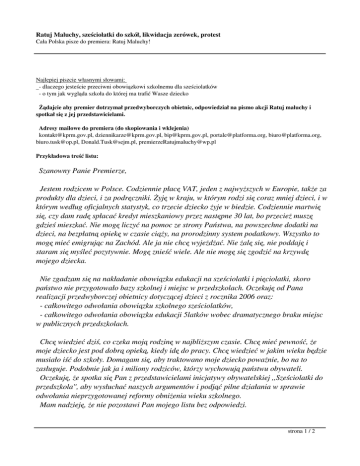 Ratuj Maluchy, sześciolatki do szkół, likwidacja zerówek, protest Cała Polska pisze do premiera: Ratuj Maluchy! Najlepiej piszcie własnymi słowami: - dlaczego jesteście przeciwni obowiązkowi szkolnemu dla sześciolatków - o tym jak wygląda szkoła do której ma trafić Wasze dziecko Żądajcie aby premier dotrzymał przedwyborczych obietnic, odpowiedział na pismo akcji Ratuj maluchy i spotkał się z jej przedstawicielami. Adresy mailowe do premiera (do skopiowania i wklejenia) [email protected], [email protected], [email protected], [email protected], [email protected], [email protected], [email protected], [email protected] Przykładowa treść listu: Szanowny Panie Premierze, Jestem rodzicem w Polsce. Codziennie płacę VAT, jeden z najwyższych w Europie, także za produkty dla dzieci, i za podręczniki. Żyję w kraju, w którym rodzi się coraz mniej dzieci, i w którym według oficjalnych statystyk, co trzecie dziecko żyje w biedzie. Codziennie martwię się, czy dam radę spłacać kredyt mieszkaniowy przez następne 30 lat, bo przecież muszę gdzieś mieszkać. Nie mogę liczyć na pomoc ze strony Państwa, na powszechne dodatki na dzieci, na bezpłatną opiekę w czasie ciąży, na prorodzinny system podatkowy. Wszystko to mogę mieć emigrując na Zachód. Ale ja nie chcę wyjeżdżać. Nie żalę się, nie poddaję i staram się myśleć pozytywnie. Mogę znieść wiele. Ale nie mogę się zgodzić na krzywdę mojego dziecka. Nie zgadzam się na nakładanie obowiązku edukacji na sześciolatki i pięciolatki, skoro państwo nie przygotowało bazy szkolnej i miejsc w przedszkolach. Oczekuję od Pana realizacji przedwyborczej obietnicy dotyczącej dzieci z rocznika 2006 oraz: - całkowitego odwołania obowiązku szkolnego sześciolatków, - całkowitego odwołania obowiązku edukacji 5latków wobec dramatycznego braku miejsc w publicznych przedszkolach. Chcę wiedzieć dziś, co czeka moją rodzinę w najbliższym czasie. Chcę mieć pewność, że moje dziecko jest pod dobrą opieką, kiedy idę do pracy. Chcę wiedzieć w jakim wieku będzie musiało iść do szkoły. Domagam się, aby traktowano moje dziecko poważnie, bo na to zasługuje. Podobnie jak ja i miliony rodziców, którzy wychowują państwu obywateli. Oczekuję, że spotka się Pan z przedstawicielami inicjatywy obywatelskiej ,,Sześciolatki do przedszkola'', aby wysłuchać naszych argumentów i podjąć pilne działania w sprawie odwołania nieprzygotowanej reformy obniżenia wieku szkolnego. Mam nadzieję, że nie pozostawi Pan mojego listu bez odpowiedzi. strona 1 / 2 Ratuj Maluchy, sześciolatki do szkół, likwidacja zerówek, protest Cała Polska pisze do premiera: Ratuj Maluchy! Z poważaniem Rodzic -----------------------------------------------------------------------------------------------A jaki jest Twój list? Zobacz co napisali inni: tutaj listy publikowane są TYLKO za zgodą autorów ------------------------------------------------------------------------------------------------ strona 2 / 2