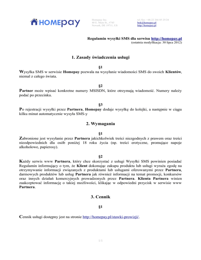 Homepay Inc. 40 E. Main St., #745 Newark, DE 19711, US tel./fax: +48.22 266 85 25/24 [email protected] http://homepay.pl Regulamin wysyłki SMS dla serwisu http://homepay.pl (ostatnia modyfikacja: 30 lipca 2012) 1. Zasady świadczenia usługi §1 Wysyłka SMS w serwisie Homepay pozwala na wysyłanie wiadomości SMS do swoich Klientów, niemal z całego świata. §2 Partner może wpisać konkretne numery MSISDN, które otrzymają wiadomość. Numery należy podać po przecinku. §3 Po rejestracji wysyłki przez Partnera, Homepay dodaje wysyłkę do kolejki, a następnie w ciągu kilku minut automatycznie wysyła SMS-y 2. Wymagania §1 Zabronione jest wysyłanie przez Partnera jakichkolwiek treści niezgodnych z prawem oraz treści nieodpowiednich dla osób poniżej 18 roku życia (np. treści erotyczne, promujące napoje alkoholowe, papierosy). §2 Każdy serwis www Partnera, który chce skorzystać z usługi Wysyłki SMS powinien posiadać Regulamin informujący o tym, że Klient dokonując zakupu produktu lub usługi wyraża zgodę na otrzymywanie informacji związanych z produktami lub usługami oferowanymi przez Partnera, darmowych produktów lub usług Partnera jak również informacji na temat promocji, konkursów oraz innych działań komercyjnych prowadzonych przez Partnera. Klienta Partnera winien zaakceptować informację o takiej możliwości, klikając w odpowiedni przycisk w serwisie www Partnera. 3. Cennik §1 Cennik usługi dostępny jest na stronie http://homepay.pl/stawki-prowizji/. 1/1