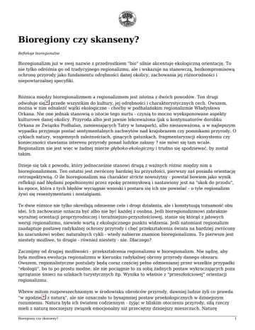 Bioregiony czy skanseny? Refleksje bioregionalne Bioregionalizm już w swej nazwie z przedrostkiem "bio" silnie akcentuje ekologiczną orientację. To nie tylko odróżnia go od tradycyjnego regionalizmu, ale i wskazuje na stanowczą, bezkompromisową ochronę przyrody jako fundamentu odrębności danej okolicy, zachowania jej różnorodności i niepowtarzalnej specyfiki. Różnica między bioregionalizmem a regionalizmem jest istotna z dwóch powodów. Ten drugi odwołuje się przede wszystkim do kultury, jej odrębności i charakterystycznych cech. Owszem, można w nim odnaleźć wątki ekologiczne - choćby w podhalańskim regionalizmie Władysława Orkana. Nie one jednak stanowią o istocie tego nurtu - czynią to mocno wyeksponowane aspekty kulturowe danej okolicy. Przyroda albo jest jawnie lekceważona (jak u kontynuatorów dorobku Orkana ze Związku Podhalan, zamieniających Tatry w lunapark), albo niezauważona, a w najlepszym wypadku przyjmuje postać sentymentalnych zachwytów nad krajobrazem czy pomnikami przyrody. O cyklach natury, wzajemnych zależnościach, ginących gatunkach, fragmentaryzacji ekosystemu czy konieczności stawiania interesu przyrody ponad ludzkie zakusy ? nie mówi się tam wcale. Regionalizm nie jest więc w żadnej mierze głęboko-ekologiczny i trudno się spodziewać, by został takim. Dzieje się tak z powodu, który jednocześnie stanowi drugą z ważnych różnic między nim a bioregionalizmem. Ten ostatni jest zwrócony bardziej ku przyszłości, pierwszy zaś posiada orientację retrospektywną. O ile bioregionalizm ma charakter stricte nowożytny - powstał bowiem jako wynik refleksji nad błędami popełnionymi przez epokę przemysłową i nastawiony jest na "skok do przodu", ku epoce, która z tych błędów wyciągnie wnioski i postara się ich nie powielać - o tyle regionalizm żywi się resentymentami i nostalgiami. Te dwie różnice nie tylko określają odmienne cele i drogi działania, ale i konstytuują tożsamość obu idei. Ich zachowanie oznacza być albo nie być każdej z osobna. Jeśli bioregionalizmowi zabraknie wyraźnej orientacji proprzyrodniczej i teraźniejszo-przyszłościowej, stanie się którąś z jałowych wersji regionalizmu, niewiele wartą z ekologicznego punktu widzenia. Jeśli natomiast regionalizm zaadaptuje postawę radykalnej ochrony przyrody i chęć przekształcenia świata na bardziej zwrócony ku szacunkowi wobec naturalnych cykli - wtedy nabierze znamion bioregionalizmu. To pierwsze jest niestety możliwe, to drugie - również niestety - nie. Dlaczego? Zacznijmy od drugiej możliwości - przekształcenia regionalizmu w bioregionalizm. Nie sądzę, aby była możliwa ewolucja regionalizmu w kierunku radykalnej obrony przyrody danego obszaru. Owszem, regionalistyczne postulaty będą coraz częściej pełne odmienianej przez wszelkie przypadki "ekologii", bo to po prostu modne, ale nie pociągnie to za sobą żadnych postaw wykraczających poza sprzątanie śmieci na szlakach turystycznych itp. Wynika to właśnie z "przeszłościowej" orientacji regionalizmu. Wbrew mitom rozpowszechnionym w środowisku obrońców przyrody, dawniej ludzie żyli co prawda "w zgodzie z naturą", ale nie oznaczało to bynajmniej postaw proekologicznych w dzisiejszym rozumieniu. Natura była ich światem codziennym - żyjąc w bliskim otoczeniu przyrody, siłą rzeczy mieli z naturą mocniejszy związek emocjonalny niż przeciętny dzisiejszy mieszczuch. Naturę Bioregiony czy skanseny? 1 podziwiali i szanowali ? ale tak, jak szanuje się siłę jednocześnie groźną i łaskawą, niemożliwą do ujarzmienia, lecz oferującą dary zapewniające podstawy bytowania. Przyroda była ich codziennością, wiele aspektów swej kultury nasycali więc wątkami odnoszącymi się do niej. Nie zmienia to faktu, że tę samą przyrodę eksploatowali wedle swoich potrzeb i traktowali jak rezerwuar dóbr potrzebnych do przeżycia i zbytku. To, że postępy tej eksploatacji były niewielkie, wynikało przede wszystkim ze słabości o charakterze technologicznym i organizacyjnym. Juraj Lukáč zauważył kiedyś w rozmowie dla "Dzikiego Życia", że dawniej słowacki chłop wycinał naturalne lasy tak samo, jak obecnie robią to robotnicy firm drzewnych - ale nie dysponował nowoczesnymi piłami, traktorami do wywozu pni, spychaczami do tworzenia szerokich dróg leśnych, więc eksploatował drzewostany dużo wolniej. No i ludzi było wówczas o wiele mniej, a i poziom rozwoju technologicznego nie stymulował potrzeby posiadania różnych dóbr, które dzisiaj nawet radykalnym ekologom wydają się niezbędnymi do życia. W środowiskach ekologicznych wciąż żywy jest mit "dobrego dzikusa", który w żaden sposób przyrodzie nie szkodził. Tymczasem antropolodzy i etnolodzy zebrali nie tylko liczne dowody życia w symbiozie z naturą, ale i takie informacje czy artefakty, które świadczą o ogromnej - w stosunku do wielkości grupy i jej możliwości technologicznych - presji na miejscowy ekosystem. Znane są wręcz przykłady spustoszenia jakiejś okolicy przez niecywilizowane ludy. Dość wspomnieć o Saharze będącej efektem nadmiernego wypasu stad zwierząt albo o ustawicznym wypalaniu pierwotnych lasów pod kolejne pola przez rolników nie znających płodozmianu, który pozwala uprawiać ziemię bez jej wyjałowienia. W Australii takie pożary wzniecane przez tubylców doprowadziły do dalekosiężnych zmian w ekosystemie, zamieniając lasy w stepowiejące równiny. W starożytnym Libanie bezpowrotnie zniszczono ogromne połacie cedrowych i cyprysowych lasów, doprowadzając do pustynnienia dużych obszarów. Staromeksykańska metropolia Teotihuacan uległa zagładzie prawdopodobnie na skutek erozji gleby wywołanej rabunkową wycinką okolicznych lasów. Podobnie było z wieloma cywilizacjami Bliskiego Wschodu. O wyniszczeniu lasów w dawnej Grecji i wywołanej tym faktem erozji Platon pisał na długo przed rozwojem przemysłu. Czł