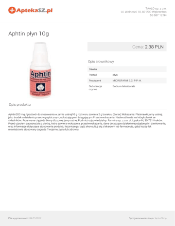 TAALO sp. z o.o. Ul. Wolności 10, 87-200 Wąbrzeźno 56 687 12 94 Aphtin płyn 10g Cena: 2,38 PLN Opis słownikowy Dawka - Postać płyn Producent MICROFARM S.C. P.P.-H. Substancja czynna Sodium tetraborate Opis produktu Aphtin200 mg /groztwór do stosowania w jamie ustnej10 g roztworu zawiera 2 g boraksu (Borax).Wskazania: Pleśniawki jamy ustnej, jako środek o działaniu przeciwgrzybicznym, odkażającym i ściągającym.Przeciwwskazania: Nadwrażliwość na którykolwiek ze składników. Przerwana ciągłość błony śluzowej jamy ustnej.Podmiot odpowiedzialny: Farmina sp. z o.o. ul. Lipska 44, 30-721 Kraków. Przed użyciem zapoznaj się z ulotką, która zawiera wskazania, przeciwwskazania, dane dotyczące działań niepożądanych i dawkowanie, oraz informacje dotyczące stosowania produktu leczniczego, bądź skonsultuj się z lekarzem lub farmaceutą, gdyż każdy lek niewłaściwie stosowany zagraża Twojemu życiu lub zdrowiu. Plik wygenerowano: 04-03-2017 Powered by TCPDF (www.tcpdf.org) Oprogramowanie sklepu: AptusShop