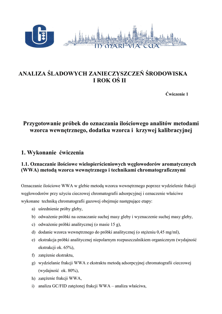 ANALIZA ŚLADOWYCH ZANIECZYSZCZEŃ ŚRODOWISKA I ROK OŚ II Ćwiczenie 1 Przygotowanie próbek do oznaczania ilościowego analitów metodami wzorca wewnętrznego, dodatku wzorca i krzywej kalibracyjnej 1. Wykonanie ćwiczenia 1.1. Oznaczanie ilościowe wielopierścieniowych węglowodorów aromatycznych (WWA) metodą wzorca wewnętrznego i technikami chromatograficznymi Oznaczanie ilościowe WWA w glebie metodą wzorca wewnętrznego poprzez wydzielenie frakcji węglowodorów przy użyciu cieczowej chromatografii adsorpcyjnej i oznaczenie właściwe wykonane techniką chromatografii gazowej obejmuje następujące etapy: a) uśrednienie próby gleby, b) odważenie próbki na oznaczanie suchej masy gleby i wyznaczenie suchej masy gleby, c) odważenie próbki analitycznej (o masie 15 g), d) dodanie wzorca wewnętrznego do próbki analitycznej (o stężeniu 0,45 mg/ml), e) ekstrakcja próbki analitycznej niepolarnym rozpuszczalnikiem organicznym (wydajność ekstrakcji ok. 65%), f) zatężenie ekstraktu, g) wydzielanie frakcji WWA z ekstraktu metodą adsorpcyjnej chromatografii cieczowej (wydajność ok. 80%), h) zatężenie frakcji WWA, i) analiza GC/FID zatężonej frakcji WWA – analiza właściwa, Przygotowanie próbek do oznaczania ilościowego analitów 2 j) wyznaczenie współczynników detekcji, k) obliczenie wyników. Wzorcem wewnętrznym jest 2-metyloantracen, ilość wzorca wewnętrznego w próbce analitycznej powinna być 1,5-2 razy większa niż analitu. Zakłada się, że stężenie poszczególnych WWA w glebie wynosi od 0,1 -1,5 ppm. Zadaniem studenta jest obliczenie wg powyższych danych ilości wzorca wewnętrznego jaką należy dodać do próbki analitycznej, wyznaczenie współczynników detekcji na podstawie Rys.1 oraz obliczenie na podstawie Rys.2 zawartości WWA w glebie. Rys. 1. Chromatogram wzorców WWA do wyznaczania współczynników odpowiedzi uzyskany z analizy GC (stężenie każdego WWA 1 mg/ml, stężenie wzorca wewnętrznego 2 mg/ml) Przygotowanie próbek do oznaczania ilościowego analitów 3 Rys. 2. Chromatogram WWA wyizolowanych z gleby uzyskany z analizy GC (wz-wzorzec wewnętrzny) 1.2. Oznaczanie herbicydów z grupy triazyn: symazyny, atrazyny i propazyny metodą dodatku wzorca i techniką wyskosprawnej chromatografii cieczowej (HPLC) z detektorem spektrofotometrycznym UV Herbicydy z grupy triazyn stanowią grupę zanieczyszczeń środowiska bardzo często wystepujacych zarówno w wodach powierzchniowych jak i gruntowych. Ich najwieksze steżenia rejestruje sie przeważnie w okresie spływu wód roztopowych oraz wykonywania zabiegów agrochemicznych. Z uwagi na ich bardzo dobrą rozpuszczalność w wodzie związki te znacznie szybciej przenikają do wód gruntowych i powierzchniowych. Zawartość herbicydów w wodzie można oznaczyć z wykorzystaniem metody HPLC w układzie faz odwróconych przy długości fali w zakresie 220-450 nm (najczęsciej 270nm). Przygotowanie próbek do oznaczania ilościowego analitów symazyna atrazyna 4 propazyna Rys.3. Budowa chemiczna omawianych herbicydów [http://www.alanwood.net/pesticides/class_herbicides.html#chlorotriazine_herbicides] Oznaczanie symazyny, antrazyny i propazyny w wodzie metodą dodatku wzorca przy użyciu chromatografii cieczowej (HPLC) z detektorem spektrofotometrycznym UV obejmuje następujące etapy: a) uśrednienie próbki wody, b) odmierzenie dwu równoległych próbek analitycznych, c) dodanie wzorców do jednej z próbek analitycznych (o stężeniach: symazyna - 0,06 mg/ml, atrazyna 0,05 mg/ml, propazyna 0,04 mg/ml), d) wykonanie analiz chromatograficznych obu próbek analitycznych – analiza właściwa, e) obliczenie wyników. Zakłada się, że stęzenie poszczególnych analitów wodzie wynosi 0,15-0,25 ppm. Stężenie analitów w próbce po dodaniu wzorców powinno być 1,5-2 razy większe od ich stężenia natywnego. Objętość badanych próbek wody wynosi 10 ml. Zadaniem studenta jest obliczenie wg powyższych danych ilości wzorców jaką należy dodać do próbki analitycznej, wykonanie analizy od punktu a do d oraz obliczenie zawartości herbicydów w próbce wody na podstawie załączonych wyników analizy (Rys.4 i 5). Przygotowanie próbek do oznaczania ilościowego analitów 5 Rys. 4. Chromatogram herbicydów wyizolowanych z wody bez dodatku wzorców Rys. 5. Chromatogram herbicydów wyizolowanych z wody po dodaniu mieszaniny wzorców 1.3. Oznaczanie zawatości żelaza w próbkach wody metodą krzywej kalibracyjnej za pomocą spektrofotometrii UV-Vis Istniejące metody oznaczania żelaza w wodzie nie dają możliwości ilościowego określenia wszystkich postaci żelaza, w jakich występuje ono w przyrodzie. Obecnie znane metody analityczne pozwalają na określenie jedynie ogólnej zawartości żelaza w wodzie, występującego w postaci dwuwartościowego lub trójwartościowego żelaza. Do oznaczania ogólnej zawartości żelaza zastosowanie znajduje metoda kolorymetryczna, która polega na redukcji jonów Fe3+ do Fe2+ za pomocą hydroksylaminy i przeprowadzeniu reakcji barwnej z fenantroliną. Jony Fe2+ tworzą z tym związkiem pomarańczowy kompleks. Intensywność zabarwienia jest proporcjonalna do stężenia żelaza w próbce i oznaczana jest spektrofotometrycznie metodą krzywej kalibracyjnej. Przygotowanie próbek do oznaczania ilościowego analitów 6 Przeprowadzono pomiar absorbancji roztworów żelaza o znanym stężeniu (od 0 do 8 ppm) oraz próbki wody (x), w której należy oznaczyć jego zawartość. Wyniki zestawiono w tabeli 1. Tabela 1. Wyniki pomiaru absorbancji w zależności od zawartości żelaza w próbce Stężenie [ppm] Absorbancja 0 0 0,4 0,00302 0,8 0,00681 1,6 0,01511 4 0,03812 8 0,05360 x 0,02565 Zadaniem studenta jest obliczenie na podstawie danych zestawionych w tabeli 1 zawartości żelaza w próbce analizowanej wody metodą krzywej kalibracyjnej. 1.4. Sporządzenie sprawozdania Sprawozdanie powinno zawierać: • zwięzły opis stosowanych metod oznaczan