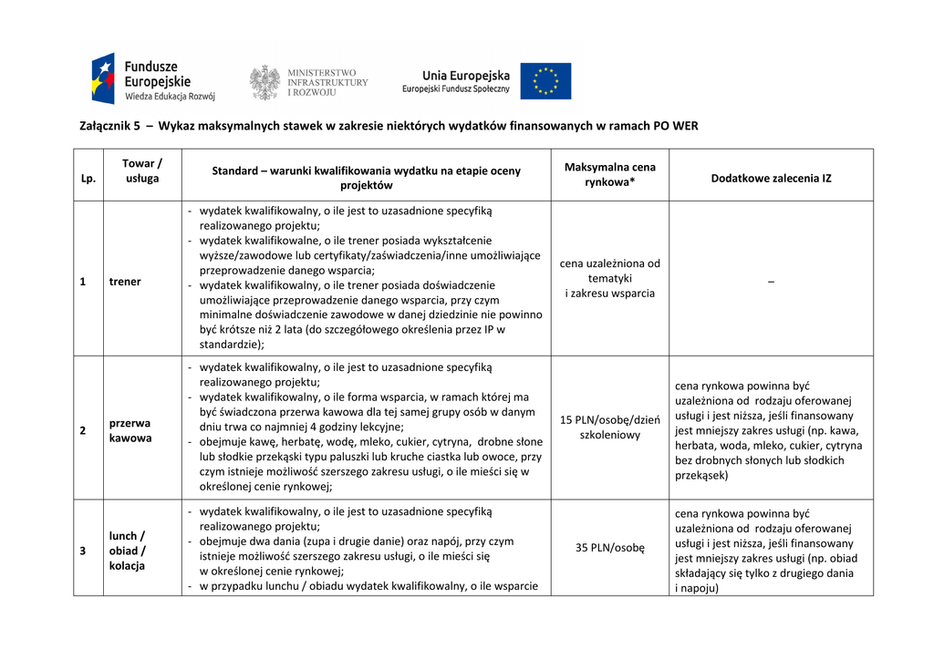 Załącznik 5 – Wykaz maksymalnych stawek w zakresie niektórych wydatków finansowanych w ramach PO WER Lp. 1 2 3 Towar / usługa Standard – warunki kwalifikowania wydatku na etapie oceny projektów Maksymalna cena rynkowa* Dodatkowe zalecenia IZ trener - wydatek kwalifikowalny, o ile jest to uzasadnione specyfiką realizowanego projektu; - wydatek kwalifikowalne, o ile trener posiada wykształcenie wyższe/zawodowe lub certyfikaty/zaświadczenia/inne umożliwiające przeprowadzenie danego wsparcia; - wydatek kwalifikowalny, o ile trener posiada doświadczenie umożliwiające przeprowadzenie danego wsparcia, przy czym minimalne doświadczenie zawodowe w danej dziedzinie nie powinno być krótsze niż 2 lata (do szczegółowego określenia przez IP w standardzie); cena uzależniona od tematyki i zakresu wsparcia – przerwa kawowa - wydatek kwalifikowalny, o ile jest to uzasadnione specyfiką realizowanego projektu; - wydatek kwalifikowalny, o ile forma wsparcia, w ramach której ma być świadczona przerwa kawowa dla tej samej grupy osób w danym dniu trwa co najmniej 4 godziny lekcyjne; - obejmuje kawę, herbatę, wodę, mleko, cukier, cytryna, drobne słone lub słodkie przekąski typu paluszki lub kruche ciastka lub owoce, przy czym istnieje możliwość szerszego zakresu usługi, o ile mieści się w określonej cenie rynkowej; 15 PLN/osobę/dzień szkoleniowy cena rynkowa powinna być uzależniona od rodzaju oferowanej usługi i jest niższa, jeśli finansowany jest mniejszy zakres usługi (np. kawa, herbata, woda, mleko, cukier, cytryna bez drobnych słonych lub słodkich przekąsek) lunch / obiad / kolacja - wydatek kwalifikowalny, o ile jest to uzasadnione specyfiką realizowanego projektu; - obejmuje dwa dania (zupa i drugie danie) oraz napój, przy czym istnieje możliwość szerszego zakresu usługi, o ile mieści się w określonej cenie rynkowej; - w przypadku lunchu / obiadu wydatek kwalifikowalny, o ile wsparcie 35 PLN/osobę cena rynkowa powinna być uzależniona od rodzaju oferowanej usługi i jest niższa, jeśli finansowany jest mniejszy zakres usługi (np. obiad składający się tylko z drugiego dania i napoju) dla tej samej grupy osób w danym dniu trwa co najmniej 6 godzin lekcyjnych (tj. 6 x 45 minut); - w przypadku kolacji wydatek kwalifikowalny, o ile finansowana jest usługa noclegowa; 4 5 nocleg w kraju - wydatek kwalifikowalny, o ile jest to uzasadnione specyfiką realizowanego projektu; - możliwość zagwarantowania noclegu dotyczy uczestników, którzy posiadają miejsce zamieszkania w miejscowości innej niż ta miejscowość, w której odbywa się szkolenie; - wydatek kwalifikowalny, o ile wsparcie (np. szkolenie, spotkanie) dla tej samej grupy osób trwa co najmniej dwa dni; - w przypadku wsparcia trwającego nie dłużej niż jeden dzień wydatek kwalifikowalny w sytuacji, gdy miejsce prowadzenia szkolenia / spotkania jest oddalone od miejsca zamieszkania osoby w nim uczestniczącej o więcej niż 50 km (drogą publiczną, a nie w linii prostej), a jednocześnie wsparcie zaczyna się przed godziną 9.00 lub kończy się po godzinie 17.00, chyba że nie ma dostępnego dojazdu publicznymi środkami transportu; - obejmuje nocleg w miejscu noclegowym o standardzie maksymalnie hotelu 3* wraz ze śniadaniem, przy czym istnieje możliwość szerszego zakresu usługi, o ile mieści się w określonej cenie rynkowej i jest to uzasadnione celami projektu; - obejmuje nocleg, co do zasady w pokojach 2-osobowych (nocleg w pokojach 1-osobowych jest kwalifikowalny tylko w uzasadnionych przypadkach); hotel o maksymalnym standardzie 3*: - 360 PLN/1 nocleg za 2 osoby w pokoju 2- osobowym, - 250 PLN/1 nocleg za 1 osobę w pokoju 1-osobowy hotel o niższym standardzie niż 3* oraz pensjonat, motel itd.: - 260 PLN/1 nocleg za 2 osoby w pokoju 2-osobowym - 120 PLN/1nocleg za 1 osobę w 1-osobowym zwrot kosztów dojazdu - wydatek kwalifikowalny w związku z uzasadnionymi potrzebami grupy docelowej (np. koszty dojazdów dla osób niepełnosprawnych, bezrobotnych); - wydatek kwalifikowalny do wysokości opłat za środki transportu publicznego szynowego lub kołowego (a w przypadku podróży międzynarodowych także transportu lotniczego) zgodnie z cennikiem cena uzależniona od cenników operatorów komunikacji publicznej cena rynkowa powinna być uzależniona od rodzaju oferowanej usługi i jest niższa, jeśli finansowany jest mniejszy zakres usługi (np. nocleg w pokoju 3-osobowym) biletów II klasy obowiązującym na danym obszarze, także w przypadku korzystania ze środków transportu prywatnego (w szczególności samochodem lub taksówką) jako refundacja wydatku faktycznie poniesionego do ww. wysokości; 6 wynajem sal szkoleniowy ch - wydatek kwalifikowalny, o ile jest to uzasadnione specyfiką realizowanego projektu oraz potrzebami grupy docelowej; - obejmuje koszt wynajmu sali wyposażonej, zgodnie z potrzebami projektu, m.in. w stoły, krzesła, rzutnik multimedialny z ekranem, komputer, tablice flipchart lub tablice suchościeralne, bezprzewodowy dostęp do Internetu oraz koszty utrzymania sali, w tym energii elektrycznej; - wydatek kwalifikowalny, o ile sala oraz budynek, w którym się ona znajduje, zapewnia dostęp dla osób z niepełnosprawnością ruchową (tj. dostosowanie architektoniczne), przy czym obowiązek ten nie dotyczy udostępniania sal szkoleniowych jako wkład własny w projekcie; 55 PLN/ za godzinę zegarową szkolenia cena dotyczy też wynajmu sali na różnego typu spotkania, o ile ich realizacja jest niezbędna i wynika z celu realizacji projektu, zaś cena powinna być niższa, jeśli koszt nie obejmuje wyposażenia określonego jak dla wynajmu sali szkoleniowej; cena obejmuje wynajem krótkoterminowy (w przypadku wynajmu sal szkoleniowych na okres dłuższy niż 80 godzin zegarowych cena powinna być niższa); cena nie dotyczy wynajmu specjalistycznych sal szkoleniowych, np. sal komputerowych lub sal wyposażonych w sprzęt specjalisty