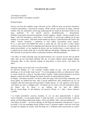 "NIE BÓJCIE SIĘ LUDZI" „Nie bójcie się ludzi!” Jezus powiedział: „Nie bójcie się ludzi”. Kochani ludzie! Zawsze się ktoś taki znajdzie, kogo człowiek się boi. 2600 lat temu żył prorok Jeremiasz, o którym słyszeliśmy w pierwszym czytaniu. Wielu rzucało oszczerstwa na niego, donosili władzy, żeby mu zaszkodzić, nawet jego nieprzyjaciele nie mogli się doczekać, kiedy mu się noga podwinie. To ich prorok nazywa prześladowcami i złoczyńcami. Podobne nieszczęście przeżywał psalmista. Znosił urągania i obelgi i chociaż modlił się do Boga, i choć był zatroskany o dom Boży w Jerozolimie, to nawet jego najbliżsi go do tego stopnia, że on sam mówi: „Dla braci moich stałem się obcym i cudzoziemcem dla synów mej matki”. Prorok Jeremiasz i psalmista to byli ludzie krzywdzeni przez innych. Po co o nich mówi dziś Biblia? Bo może ty jesteś jak oni. Jak się ktoś z ciebie śmieje zwłaszcza przy innych, jak ktoś obgaduje poza plecami, jak jest tak mściwy, że naprawdę nie można przewidzieć, co mu wpadnie do głowy, jak ma szerokie plecy i może zała twić coś w gminie nie po twojej myśli, jak ci wiecznie dokucza narzekając i biadoląc, jak znajdzie się taki człowiek co jest przeciw tobie, to jesteś jak Jeremiasz, albo jak psalmista. I nie tylko, że wtedy człowiek czuje się pokrzywdzony, ale i zaczyna się bać. Boi się takich ludzi, żeby go nie krzywdzili bardziej. Boi się, że znowu będzie musiał słuchać takiego człowieka, albo, że taki człowiek zepsuje im przyszłość. A Jezus mówi: „Nie bójcie się ludzi”. Dlaczego mamy się nie bać tych, co nas krzywdzą? Po pierwsze dlatego, że i tak wszystko wyjdzie kiedyś na jaw. „Nie ma bowiem nic zakrytego, co by nie miało wyjść na jaw”. To co inni gadają na ciebie, co robią przeciw tobie, co nawet myślą źle o tobie to wszystko kiedyś wyjdzie i będą musieli tłumaczyć się przed Bogiem, czemu tak robili. Dlatego nie bójcie się ludzi, bo sprawiedliwość będzie. Po drugie: „Nie bójcie się ludzi”, bo duszy zabić nie mogą. Jeśli cię ktoś bije, maltretuje, jeśli nawet gdyby się znalazł ktoś taki, żeby ci groził zabójstwem, albo szantażował cię, by coś wyłudzić, albo był terrorystą pierwszej klasy i byłbyś pewny, że i tak zginiesz, Jezus mówi: „Nie bójcie się tych, co zabijają ciało.” Nie bójcie się, bo życie to nie jest największy skarb, nie bójcie się, bo duszy ci nie zabiorą, jak im sam nie oddasz. Bój się raczej Boga, bo jak będziesz żył przeciw Niemu, to i ciało i duszę zatracisz w piekle. I tu trzeba powiedzieć szczerze, kochani, że coś się nam poprzestawiało w naszej wierze. Myślimy: „Co powiedzą ludzie?” a mało się myśli: „A co powie Pan Bóg”. Ludzi się boimy, ale Pana Boga załatwiamy krótko: „On to jest daleko” albo „i tak jest miłosierny”. „Nie bójcie się ludzi” – po trzecie dlatego, że Pan Bóg jest doskonale zorientowany i wie co się dzieje. Czyż nie sprzedają dwóch wróbli za asa? A przecież żaden z nich bez woli Ojca waszego nie spadnie na ziemię. Jeśli Pan Bóg wie o wróblach, które kosztowały za czasów Jezusa 2 asy, czyli tyle co pół godziny roboty, jeśli wszystkie włosy na głowie są policzone, to znaczy, że czuwa nad każdym człowiekiem, bo on ważniejszy od wróbli. Po co to mówi Jezus? Jak cię spotyka nieszczęście ze strony innych, to się nie bój, żeś sam został, to się nie bój, że cię Bóg opuścił, to jest niemożliwe. Bóg wie o tym nieszczęściu i patrzy się na nie i jeśli pozwala by ci ktoś krzywdę robił, to ma w tym, jakiś swój cel – może nauczy cię pokory, może chcę cię oczyścić na ziemi i przez to będziesz krócej w czyśćcu, może chce pomóc innym. Pomyśl, ile nadokuczali się św. s. Faustynie za życia, ile św. O. Pio i jakie dobro wyszło z tego po śmierci? Nie da się zrozumieć krzyża, ale jedno jest pewne, Bóg nie opuszcza nigdy i wynagrodzi krzywdy, które człowiek zaznał. Do każdego więc, który się przyzna do mnie przed ludźmi, przyznam się i ja przed moim Ojcem, który jest w niebie. „Nie bójcie się ludzi”. Co do problemu lęku przed drugim człowiekiem ważne są jeszcze trzy sprawy: Po pierwsze – brać przykład z tych, co byli niesprawiedliwie krzywdzeni. Dużo jest takich ludzi, które nie mszczą się, nie rzucają obelgi chociaż inni dość im nabruździli w życiu. Trzeba być jak oni. Po drugie – uwierzyć, że złem zła się nie naprawi. Jak mi ktoś krzywdę robi, to choćbym mu jakie zło wyrządził, choćbym jak się zemścił, to i tak sprawy nie załatwię. Przykład Izraela i Palestyny jest najlepszym dowodem. Dobrze powiedział duchowy przywódca Indii Mahatma Gandhi: „Jak by cały świat stosował zasadę oko za oko, to byśmy wszyscy chodzili z wydłubanymi oczami”. Po trzecie - trzeba się gorąca modlić, kiedy inni robią mi krzywdę. Mówił psalmista: „Ja, o Panie, modlę się do ciebie” a nieco dalej „Pan wysłuchuje biednych i swoimi więźniami nie gardzi”. Sam Jezus powiedział przed śmiercią: „Ojcze, przebacz im, bo nie wiedzą, co czynią”. Trzeba się modlić za tych, co mnie krzywdzą i za siebie, kiedy mnie krzywdzą. Co to jest jedno „Ojcze nasz” dziennie za takiego? To nie jest wiele a bez modlitwy ciężko jest o przebaczenie i o wiarę, że „Bóg naprawdę jest przy mnie jako potężny mocarz i moi prześladowcy ustaną i nie zwyciężą”. Drodzy rodacy! Wiecie dobrze, jak po 11 września ubiegłego roku świat zaczął się bać terrorystów, ilu mniej pasażerów, ile mniej wycieczek, jakie drobiazgowe kontrole, ile paniki czasami naprawdę głupiej. Czy jednak ten strach zlikwidował cokolwiek? Czy bojaźń wprowadziła więcej pokoju? Czy to, że się ludzie bardziej boją zmieniło terrorystów albo ułatwiło życie? Dobrze byłoby, gdyby na świecie nie było takich ludzi, którzy st