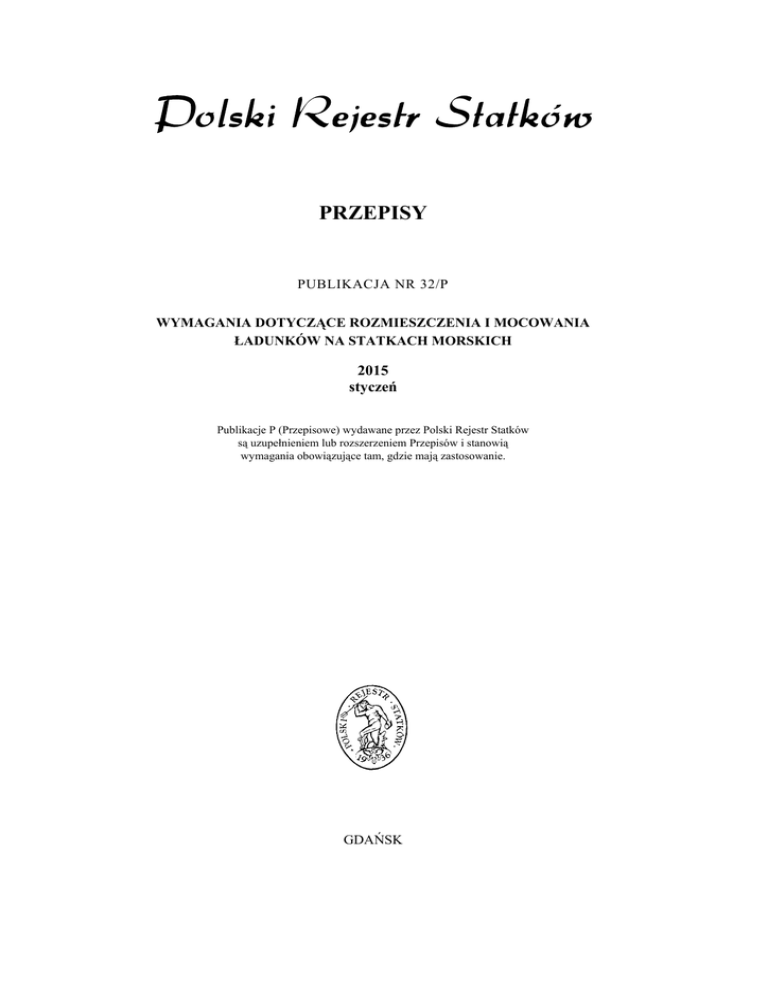 PRZEPISY PUBLIKACJA NR 32/P WYMAGANIA DOTYCZĄCE ROZMIESZCZENIA I MOCOWANIA ŁADUNKÓW NA STATKACH MORSKICH 2015 styczeń Publikacje P (Przepisowe) wydawane przez Polski Rejestr Statków są uzupełnieniem lub rozszerzeniem Przepisów i stanowią wymagania obowiązujące tam, gdzie mają zastosowanie. GDAŃSK Publikacja Nr 32/P – Wymagania dotyczące rozmieszczenia i mocowania ładunków na statkach morskich – styczeń 2015, została zatwierdzona przez Zarząd Polskiego Rejestru Statków S.A. w dniu 29 grudnia 2014 r. i wchodzi w życie z dniem 1 stycznia 2015 r. Niniejsza publikacja zastępuje Publikację Nr 32/P – Wymagania dotyczące rozmieszczenia i mocowania ładunków na statkach morskich – 2003. © Copyright by Polski Rejestr Statków S.A., 2015 PRS/OP, 12/2014 ISBN 978-83-7664-258-1 SPIS TREŚCI str. 1 Postanowienia ogólne .............................................................................................................................. 1.1 Zakres zastosowania........................................................................................................................ 1.2 Dokumentacja techniczna................................................................................................................ 5 5 5 2 Osprzęt do ustalania położenia i mocowania ładunków....................................................................... 2.1 Wymagania ogólne i zakres zastosowania ...................................................................................... 2.2 Zakres nadzoru ................................................................................................................................ 2.3 Podział osprzętu i wymagania szczegółowe.................................................................................... 5 5 6 7 3 Rozmieszczenie i mocowanie kontenerów ............................................................................................. 3.1 Zakres zastosowania........................................................................................................................ 3.2 Określenia ....................................................................................................................................... 3.3 Rozmieszczenie kontenerów na statkach ........................................................................................ 3.4 Mocowanie kontenerów na statkach ............................................................................................... 3.5 Obliczenia zamocowań kontenerów................................................................................................ 3.6 Mocowanie bloku kontenerów ........................................................................................................ 3.7 Dopuszczalne wartości sił występujących w elementach kontenerów, odciągach i innych urządzeniach mocujących.................................................................................................. 3.8 Zabezpieczenie stosu kontenerów przed oderwaniem od podłoża .................................................. 11 11 11 11 12 13 24 24 25 Załącznik 1 Wzory do obliczania poziomych i pionowych sił podpierających dla typowych przypadków mocowania stosów kontenerów................................................................................. Załącznik 2 Przykłady obliczeniowe typowych stosów kontenerów................................................................. 28 30 4 Rozmieszczenie i mocowanie pojazdów drogowych i rolltrailerów..................................................... 4.1 Wymagania ogólne i zakres zastosowania ...................................................................................... 4.2 Określenia i objaśnienia .................................................................................................................. 4.3 Wymagania techniczne ................................................................................................................... 4.4 Obliczenia zamocowań pojazdów drogowych i rolltrailerów ......................................................... 37 37 37 38 41 5 Rozmieszczenie i mocowanie pokładowego ładunku drewna .............................................................. 5.1 Wymagania ogólne i zakres zastosowania ...................................................................................... 5.2 Określenia i objaśnienia .................................................................................................................. 5.3 Zakres nadzoru ................................................................................................................................ 5.4 Zakres przeglądów .......................................................................................................................... 5.5 Stateczność ...................................................................................................................................... 5.6 Składowanie ładunku ....................................................................................................................... 5.7 Alternatywne zasady projektowania zabezpieczeń do przewozu drewna na pokładzie ..................... 48 48 48 48 48 49 49 50 Załącznik 3 Wytyczne dotyczące zapewniania bezpiecznych warunków pracy w czasie mocowania kontenerów na pokładzie................................................................................................................ 51 1 POSTANOWIENIA OGÓLNE 1.1 Zakres zastosowania 1.1.1 Niniejsza Publikacja ma zastosowanie do klasyfikowanych przez PRS statków morskich o normalnie spotykanym przeznaczeniu oraz zgodnym z zasadami dobrej praktyki morskiej sposobie eksploatacji, przewożących wszelkiego rodzaju ładunki inne niż suche ładunki masowe i ładunki ciekłe luzem oraz przewożących pokładowy ładunek drewna. 1.1.2 Wymienione w niniejszej Publikacji: – Część I – Zasady klasy
