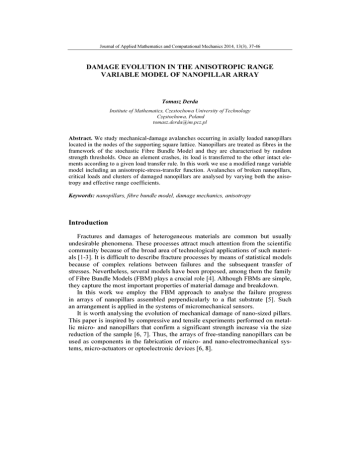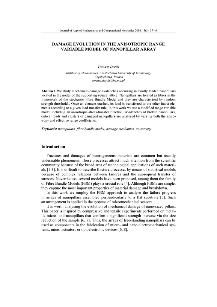 Journal of Applied Mathematics and Computational Mechanics 2014, 13(3), 37-46 DAMAGE EVOLUTION IN THE ANISOTROPIC RANGE VARIABLE MODEL OF NANOPILLAR ARRAY Tomasz Derda Institute of Mathematics, Czestochowa University of Technology Częstochowa, Poland [email protected] Abstract. We study mechanical-damage avalanches occurring in axially loaded nanopillars located in the nodes of the supporting square lattice. Nanopillars are treated as fibres in the framework of the stochastic Fibre Bundle Model and they are characterised by random strength thresholds. Once an element crashes, its load is transferred to the other intact elements according to a given load transfer rule. In this work we use a modified range variable model including an anisotropic-stress-transfer function. Avalanches of broken nanopillars, critical loads and clusters of damaged nanopillars are analysed by varying both the anisotropy and effective range coefficients. Keywords: nanopillars, fibre bundle model, damage mechanics, anisotropy Introduction Fractures and damages of heterogeneous materials are common but usually undesirable phenomena. These processes attract much attention from the scientific community because of the broad area of technological applications of such materials [1-3]. It is difficult to describe fracture processes by means of statistical models because of complex relations between failures and the subsequent transfer of stresses. Nevertheless, several models have been proposed, among them the family of Fibre Bundle Models (FBM) plays a crucial role [4]. Although FBMs are simple, they capture the most important properties of material damage and breakdown. In this work we employ the FBM approach to analyse the failure progress in arrays of nanopillars assembled perpendicularly to a flat substrate [5]. Such an arrangement is applied in the systems of micromechanical sensors. It is worth analysing the evolution of mechanical damage of nano-sized pillars. This paper is inspired by compressive and tensile experiments performed on metallic micro- and nanopillars that confirm a significant strength increase via the size reduction of the sample [6, 7]. Thus, the arrays of free-standing nanopillars can be used as components in the fabrication of micro- and nano-electromechanical systems, micro-actuators or optoelectronic devices [6, 8]. 38 T. Derda 1. Anisotropic range variable model The system is composed of N = L × L nanopillars located in the nodes of square lattice of side length L . Each nanopillar xi is characterised by its critical load σ thi , which is a strength threshold of the given pillar. Because of various defects during the fabrication process the pillar-strength-thresholds σ thi , i = 1,2,.., N are independent quenched random variables. It is assumed that the randomness of pillarstrength-thresholds σ thi , i = 1,2,.., N reflects the disorder of heterogeneous material. In this paper we employ uniform distribution of pillar-strength-thresholds with the probability density and distribution functions p(σ th ) = 1 , P(σ th ) = σ th . The strength-thresholds are drawn from the interval [0,1] . Under the load σ i exceeding strength-threshold σ thi the pillar is instantaneously and irreversibly damaged. Initially all the pillars are intact, which corresponds to a zero load. Then the set of pillars is subjected to a quasi-statically increased external load F . In this approach longitudinal load F is the control parameter of the model. The increase of F is uniform for all intact pillars and it stops immediately when the weakest intact pillar crashes. After this destruction the load carried by the damaged pillar is redistributed to the other intact pillars. In this work we employ an idea of variable range of interaction proposed by Hidalgo et al. [9]. Due to the substrate elasticity we introduce anisotropy in stress transfer, so the stress-transfer function has the following form: G (rij , γ , α ) = rij−γ (α ) ∑i∈I rij−γ (α ) (1) Here, γ is an adjustable parameter and I denotes the set of all intact pillars. In the original work [9] rij denotes distance between the intact element i and the damaged element j. Modifying rij by an anisotropy coefficient α we obtain the formula for relative distance: xi − x j rij (α ) = α 2 + ( yi − y j )2 (2) Coefficient α is a measure of stress transfer anisotropy, i.e. α = 1 corresponds to the isotropic model and α > 1 represents the stress transfer to pillars in the x-direction is α times faster than the transfer in the y-direction. It is necessary to note that this paper is in the spirit of work [10], where a somewhat different anisotropic load sharing model has been proposed in reference to a generalised discrete model. 39 Damage evolution in the anisotropic range variable model of nanopillar array The presented model ensures load transfer from the broken pillar to all intact pillars in the system, so the range of interaction overlays the entire system. However, the effective range of interaction depends on parameter γ . The limits γ → 0 and γ → ∞ correspond to two extreme rules of load sharing, namely global (GLS) and local (LLS). The GLS rule represents mean-field approach with long-range interactions between pillars. After a pillar breaks, its load is equally redistributed to all the remaining elements irrespective of their distances from the damaged element. Contrary to the GLS, in the LLS rule only short-range interactions are assumed. In this scheme the load from the broken element is transferred to neighbouring elements only, usually to the nearest ones. From the equation (1) it is seen that an increasing γ reduces the effective range of interaction. Exemplary results of the load transfer from the broken pillar to its nearest neighbours are presented in Table 1. Different values of γ and α are examined within both the GLS and LLS rules and it is assumed that only one pillar breaks, whereas other pillars stay intact. Ta