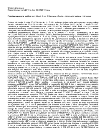 Umowa znacząca Raport bieŜący nr 5/2010 z dnia 05.02.2010 roku Podstawa prawna ogólna: art. 56 ust. 1 pkt 2 Ustawy o ofercie – informacje bieŜące i okresowe Emitent informuje, iŜ dnia 05.02.2010 roku do Spółki wpłynęła trójstronnie podpisana umowa na zakup sprzętu datowana na 30.01.2010 roku. Jej stronami są: 1) Emitent (KUPUJĄCY), 2) AMROC INC. z siedzibą w Hagerstown, 760 Bowman Ave. (SPRZEDAWCA), Maryland 21740, USA oraz 3) Industriele Handelsonderneming NIEUWENHAGEN B.V. Import - Export, z siedzibą pod adresem: 63-73, miasto Landgraaf, ulica Kleikoeleweg 132, Holandia (AGENT) razem zwanymi STRONAMI. Preambuła przedmiotowej umowy stanowi, Ŝe: A) KUPUJĄCY i AGENT oświadczają, iŜ w dniu 19.12.2008 roku zawarli umowę na zakup sprzętu, która obejmowała zakup u SPRZEDAWCY towarów wyspecyfikowanych w załącznikach A i B do tej umowy. (Umowa, o której mowa w punkcie A została przez Emitenta szczegółowo opisana w punkcie 15 „Sprawozdania Zarządu z działalności BUMECH S.A. za rok obrotowy 2008” stanowiącego element raportu okresowego publikowanego 30.04.2009 roku); B) KUPUJĄCY I AGENT oświadczają, iŜ umowa opisana powyŜej nie została pomiędzy nimi zrealizowana; C) STRONY ustalają, Ŝe zaliczki zapłacone przez KUPUJĄCEGO AGENTOWI w oparciu o zapisy umowy powołanej w punkcie A, AGENT przekazał SPRZEDAWCY, natomiast wszystkie inne warunki transakcji reguluje niniejsza umowa; D) AGENT i KUPUJĄCY oświadczają, iŜ wraz z zawarciem niniejszej umowy wygasają wszelkie roszczenia powstałe lub mogące powstać w przyszłości między nimi, z tytułu umowy z dnia 19.12.2008 roku na zakup sprzętu; E) Przy uwzględnieniu powyŜszych zastrzeŜeń strony zawierają umowę opisywaną poniŜej. Przedmiotem umowy na zakup sprzętu zawartej 30.01.2010 roku jest nabycie przez Emitenta czterech kombajnów AM 75 (jeden z nich jest po kapitalnym remoncie a trzy kompletne po eksploatacji) wraz z częściami zamiennymi do nich, łącznie nazywane TOWARAMI. Dostawa TOWARÓW zostanie podzielona na dwa etapy: 1) załadunek TOWARÓW wyspecyfikowanych w załączniku A będzie miał miejsce w marcu 2010 roku i zostanie dokonany w terminie do 21 dni od daty otrzymania akceptowalnej akredytywy przez SPRZEDAWCĘ; 2) załadunek TOWARÓW wyspecyfikowanych w załączniku B będzie miał miejsce we wrześniu 2010 roku i zostanie dokonany w terminie 21 dni od daty otrzymania akceptowalnej akredytywy przez SPRZEDAWCĘ. Niniejsza umowa jest zawierana na okres dziesięciu miesięcy od dnia jej zawarcia. Termin moŜe zostać przedłuŜony na podstawie pisemnej zgody KUPUJĄCEGO i SPRZEDAJĄCEGO. KUPUJĄCY nabywa TOWARY ZA KWOTĘ 2 660 000 $ (co w przeliczeniu po średnim kursie NBP z dnia wystąpienia zdarzenia, o którym Emitent jest zobowiązany przekazać raport bieŜący odpowiada wartości 7 957 390 złotych). Strony ustalają i oświadczają, iŜ na poczet ceny zostają zaliczone zapłacone AGENTOWI przez KUPUJĄCEGO w wysokości 200 000 $ (co w przeliczeniu po średnim kursie NBP z dnia wystąpienia zdarzenia, o którym Emitent jest zobowiązany przekazać raport bieŜący odpowiada wartości 598 300 złotych). KUPUJĄCY wpłaci SPRZEDAWCY zaliczkę w kwocie 225 000 $ (co w przeliczeniu po średnim kursie NBP z dnia wystąpienia zdarzenia, o którym Emitent jest zobowiązany przekazać raport bieŜący odpowiada wartości 6 73 087,50 złotych) w ciągu 7 dni od podpisania umowy przez wszystkie STRONY. Zapłata za pierwszy etap dostawy w wysokości 1 330 000 $ (co w przeliczeniu po średnim kursie NBP z dnia wystąpienia zdarzenia, o którym Emitent jest zobowiązany przekazać raport bieŜący odpowiada wartości 3 978 695) złotych nastąpi do końca lutego 2010 w formie akredytywy dokumentowej, która powinna być nieodwołalna, potwierdzona przez amerykański bank, płatna na Ŝądanie, waŜna do 15 kwietnia 2010 roku. Zapłata za drugi etap dostawy w wysokości 905 000 $ co w przeliczeniu po średnim kursie NBP z dnia wystąpienia zdarzenia, o którym Emitent jest zobowiązany przekazać raport bieŜący odpowiada wartości 2 707 307,50 złotych) nastąpi do końca sierpnia 2010 w formie akredytywy dokumentowej, która powinna być nieodwołalna, potwierdzona przez amerykański bank, płatna na Ŝądanie, waŜna do 15 października 2010 roku. Jeśli KUPUJĄCY nie dokona trzech powyŜszych płatności SPRZEDAWCA ma prawo zatrzymać zaliczkę w wysokości 200 000 $ (co w przeliczeniu po średnim kursie NBP z dnia wystąpienia zdarzenia, o którym Emitent jest zobowiązany przekazać raport bieŜący odpowiada wartości 598 300 złotych). Jeśli KUPUJĄCY nie dokona płatności za pierwszy etap dostawy w wysokości 1 330 000 $ (co w przeliczeniu po średnim kursie NBP z dnia wystąpienia zdarzenia, o którym Emitent jest zobowiązany przekazać raport bieŜący odpowiada wartości 3 978 695 złotych) oraz za drugi etap dostawy w wysokości 905 000 $ (co w przeliczeniu po średnim kursie NBP z dnia wystąpienia zdarzenia, o którym Emitent jest zobowiązany przekazać raport bieŜący odpowiada wartości 2 707 307,50 złotych) SPRZEDAWCA ma prawo zatrzymać zaliczkę w kwocie 425 000 $ (co w przeliczeniu po średnim kursie NBP z dnia wystąpienia zdarzenia, o którym Emitent jest zobowiązany przekazać raport bieŜący odpowiada wartości 1 271 387,50 złotych). Jeśli SPRZEDAWCA nie wywiąŜe się ze zobowiązań wynikających z umowy zwróci KUPUJĄCEMU zaliczkę w wysokości 225 000 $ (co w przeliczeniu po średnim kursie NBP z dnia wystąpienia zdarzenia, o którym Emitent jest zobowiązany przekazać raport bieŜący odpowiada wartości 673 087,50 złotych). Przedmiotowa umowa nie zawiera kar umownych, a jej warunki nie odbiegają od standartowych przewidzianych dla tego typu umów. Umowa istotna ze względu na wartość przekraczającą 10 % kapitałów własnych Emitenta. Podstawa prawna: §5 ust 1 pkt 3 RMF w sprawie informacji bieŜących i okresowych przekaz