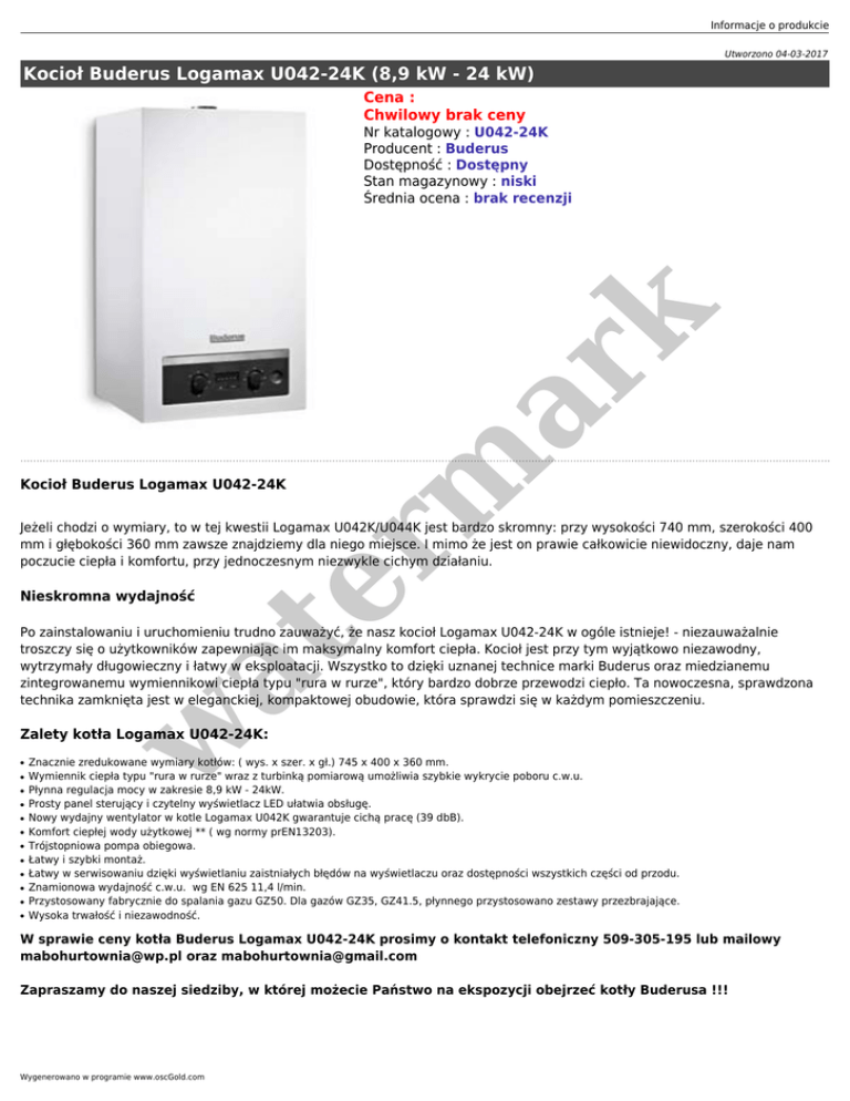 Informacje o produkcie Utworzono 04-03-2017 Kocioł Buderus Logamax U042-24K (8,9 kW - 24 kW) Cena : Chwilowy brak ceny er m ar k Nr katalogowy : U042-24K Producent : Buderus Dostępność : Dostępny Stan magazynowy : niski Średnia ocena : brak recenzji Kocioł Buderus Logamax U042-24K Jeżeli chodzi o wymiary, to w tej kwestii Logamax U042K/U044K jest bardzo skromny: przy wysokości 740 mm, szerokości 400 mm i głębokości 360 mm zawsze znajdziemy dla niego miejsce. I mimo że jest on prawie całkowicie niewidoczny, daje nam poczucie ciepła i komfortu, przy jednoczesnym niezwykle cichym działaniu. Nieskromna wydajność w at Po zainstalowaniu i uruchomieniu trudno zauważyć, że nasz kocioł Logamax U042-24K w ogóle istnieje! - niezauważalnie troszczy się o użytkowników zapewniając im maksymalny komfort ciepła. Kocioł jest przy tym wyjątkowo niezawodny, wytrzymały długowieczny i łatwy w eksploatacji. Wszystko to dzięki uznanej technice marki Buderus oraz miedzianemu zintegrowanemu wymiennikowi ciepła typu "rura w rurze", który bardzo dobrze przewodzi ciepło. Ta nowoczesna, sprawdzona technika zamknięta jest w eleganckiej, kompaktowej obudowie, która sprawdzi się w każdym pomieszczeniu. Zalety kotła Logamax U042-24K: ● ● ● ● ● ● ● ● ● ● ● ● Znacznie zredukowane wymiary kotłów: ( wys. x szer. x gł.) 745 x 400 x 360 mm. Wymiennik ciepła typu "rura w rurze" wraz z turbinką pomiarową umożliwia szybkie wykrycie poboru c.w.u. Płynna regulacja mocy w zakresie 8,9 kW - 24kW. Prosty panel sterujący i czytelny wyświetlacz LED ułatwia obsługę. Nowy wydajny wentylator w kotle Logamax U042K gwarantuje cichą pracę (39 dbB). Komfort ciepłej wody użytkowej ** ( wg normy prEN13203). Trójstopniowa pompa obiegowa. Łatwy i szybki montaż. Łatwy w serwisowaniu dzięki wyświetlaniu zaistniałych błędów na wyświetlaczu oraz dostępności wszystkich części od przodu. Znamionowa wydajność c.w.u. wg EN 625 11,4 l/min. Przystosowany fabrycznie do spalania gazu GZ50. Dla gazów GZ35, GZ41.5, płynnego przystosowano zestawy przezbrajające. Wysoka trwałość i niezawodność. W sprawie ceny kotła Buderus Logamax U042-24K prosimy o kontakt telefoniczny 509-305-195 lub mailowy [email protected] oraz [email protected] Zapraszamy do naszej siedziby, w której możecie Państwo na ekspozycji obejrzeć kotły Buderusa !!! Wygenerowano w programie www.oscGold.com er m ar k at w