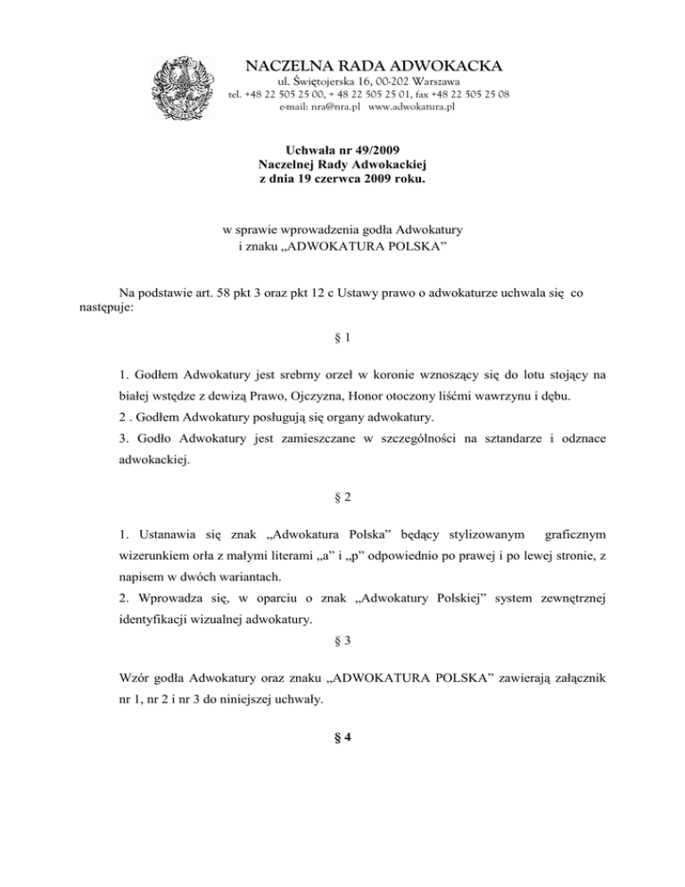 NACZELNA RADA ADWOKACKA ul. Świętojerska 16, 00-202 Warszawa tel. +48 22 505 25 00, + 48 22 505 25 01, fax +48 22 505 25 08 e-mail: [email protected] www.adwokatura.pl Uchwała nr 49/2009 Naczelnej Rady Adwokackiej z dnia 19 czerwca 2009 roku. w sprawie wprowadzenia godła Adwokatury i znaku „ADWOKATURA POLSKA” Na podstawie art. 58 pkt 3 oraz pkt 12 c Ustawy prawo o adwokaturze uchwala się co następuje: §1 1. Godłem Adwokatury jest srebrny orzeł w koronie wznoszący się do lotu stojący na białej wstędze z dewizą Prawo, Ojczyzna, Honor otoczony liśćmi wawrzynu i dębu. 2 . Godłem Adwokatury posługują się organy adwokatury. 3. Godło Adwokatury jest zamieszczane w szczególności na sztandarze i odznace adwokackiej. §2 1. Ustanawia się znak „Adwokatura Polska” będący stylizowanym graficznym wizerunkiem orła z małymi literami „a” i „p” odpowiednio po prawej i po lewej stronie, z napisem w dwóch wariantach. 2. Wprowadza się, w oparciu o znak „Adwokatury Polskiej” system zewnętrznej identyfikacji wizualnej adwokatury. §3 Wzór godła Adwokatury oraz znaku „ADWOKATURA POLSKA” zawierają załącznik nr 1, nr 2 i nr 3 do niniejszej uchwały. §4 NACZELNA RADA ADWOKACKA ul. Świętojerska 16, 00-202 Warszawa tel. +48 22 505 25 00, + 48 22 505 25 01, fax +48 22 505 25 08 e-mail: [email protected] www.adwokatura.pl UpowaŜnia się Prezydium Naczelnej Rady Adwokackiej do uchwalenia zasad i sposobu korzystania ze znaku „ADWOKATURA POLSKA”. §5 Zobowiązuje się Prezydium Naczelnej Rady Adwokackiej do podjęcia działań w celu zapewnienia naleŜytej prawnej ochrony znaku „ADWOKATURY POLSKIEJ”. §6 Uchwała wchodzi w Ŝycie z dniem podjęcia. Prezes Naczelnej Rady Adwokackiej (Joanna Agacka-Indecka) adw. Joanna Agacka-Indecka