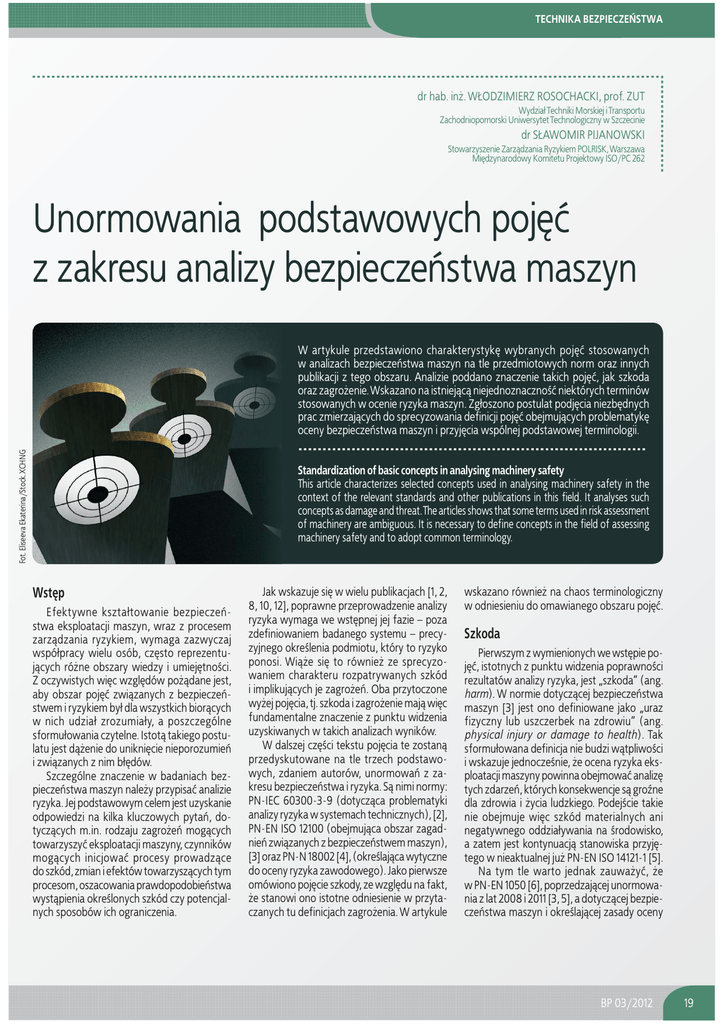 TECHNIKA BEZPIECZEÑSTWA dr hab. in¿. W£ODZIMIERZ ROSOCHACKI, prof. ZUT Wydzia³ Techniki Morskiej i Transportu Zachodniopomorski Uniwersytet Technologiczny w Szczecinie dr S£AWOMIR PIJANOWSKI Stowarzyszenie Zarz¹dzania Ryzykiem POLRISK, Warszawa Miêdzynarodowy Komitetu Projektowy ISO/PC 262 Unormowania podstawowych pojêæ z zakresu analizy bezpieczeñstwa maszyn Fot. Eliseeva Ekaterina/Stock.XCHNG W artykule przedstawiono charakterystykê wybranych pojêæ stosowanych w analizach bezpieczeñstwa maszyn na tle przedmiotowych norm oraz innych publikacji z tego obszaru. Analizie poddano znaczenie takich pojêæ, jak szkoda oraz zagro¿enie. Wskazano na istniej¹c¹ niejednoznacznoæ niektórych terminów stosowanych w ocenie ryzyka maszyn. Zg³oszono postulat podjêcia niezbêdnych prac zmierzaj¹cych do sprecyzowania definicji pojêæ obejmuj¹cych problematykê oceny bezpieczeñstwa maszyn i przyjêcia wspólnej podstawowej terminologii. Standardization of basic concepts in analysing machinery safety This article characterizes selected concepts used in analysing machinery safety in the context of the relevant standards and other publications in this field. It analyses such concepts as damage and threat. The articles shows that some terms used in risk assessment of machinery are ambiguous. It is necessary to define concepts in the field of assessing machinery safety and to adopt common terminology. Wstêp Efektywne kszta³towanie bezpieczeñstwa eksploatacji maszyn, wraz z procesem zarz¹dzania ryzykiem, wymaga zazwyczaj wspó³pracy wielu osób, czêsto reprezentuj¹cych ró¿ne obszary wiedzy i umiejêtnoci. Z oczywistych wiêc wzglêdów po¿¹dane jest, aby obszar pojêæ zwi¹zanych z bezpieczeñstwem i ryzykiem by³ dla wszystkich bior¹cych w nich udzia³ zrozumia³y, a poszczególne sformu³owania czytelne. Istot¹ takiego postulatu jest d¹¿enie do unikniêcie nieporozumieñ i zwi¹zanych z nim b³êdów. Szczególne znaczenie w badaniach bezpieczeñstwa maszyn nale¿y przypisaæ analizie ryzyka. Jej podstawowym celem jest uzyskanie odpowiedzi na kilka kluczowych pytañ, dotycz¹cych m.in. rodzaju zagro¿eñ mog¹cych towarzyszyæ eksploatacji maszyny, czynników mog¹cych inicjowaæ procesy prowadz¹ce do szkód, zmian i efektów towarzysz¹cych tym procesom, oszacowania prawdopodobieñstwa wyst¹pienia okrelonych szkód czy potencjalnych sposobów ich ograniczenia. Jak wskazuje siê w wielu publikacjach [1, 2, 8, 10, 12], poprawne przeprowadzenie analizy ryzyka wymaga we wstêpnej jej fazie – poza zdefiniowaniem badanego systemu – precyzyjnego okrelenia podmiotu, który to ryzyko ponosi. Wi¹¿e siê to równie¿ ze sprecyzowaniem charakteru rozpatrywanych szkód i implikuj¹cych je zagro¿eñ. Oba przytoczone wy¿ej pojêcia, tj. szkoda i zagro¿enie maj¹ wiêc fundamentalne znaczenie z punktu widzenia uzyskiwanych w takich analizach wyników. W dalszej czêci tekstu pojêcia te zostan¹ przedyskutowane na tle trzech podstawowych, zdaniem autorów, unormowañ z zakresu bezpieczeñstwa i ryzyka. S¹ nimi normy: PN-IEC 60300-3-9 (dotycz¹ca problematyki analizy ryzyka w systemach technicznych), [2], PN-EN ISO 12100 (obejmuj¹ca obszar zagadnieñ zwi¹zanych z bezpieczeñstwem maszyn), [3] oraz PN-N 18002 [4], (okrelaj¹ca wytyczne do oceny ryzyka zawodowego). Jako pierwsze omówiono pojêcie szkody, ze wzglêdu na fakt, ¿e stanowi ono istotne odniesienie w przytaczanych tu definicjach zagro¿enia. W artykule wskazano równie¿ na chaos terminologiczny w odniesieniu do omawianego obszaru pojêæ. Szkoda Pierwszym z wymienionych we wstêpie pojêæ, istotnych z punktu widzenia poprawnoci rezultatów analizy ryzyka, jest „szkoda” (ang. harm). W normie dotycz¹cej bezpieczeñstwa maszyn [3] jest ono definiowane jako „uraz fizyczny lub uszczerbek na zdrowiu” (ang. physical injury or damage to health). Tak sformu³owana definicja nie budzi w¹tpliwoci i wskazuje jednoczenie, ¿e ocena ryzyka eksploatacji maszyny powinna obejmowaæ analizê tych zdarzeñ, których konsekwencje s¹ grone dla zdrowia i ¿ycia ludzkiego. Podejcie takie nie obejmuje wiêc szkód materialnych ani negatywnego oddzia³ywania na rodowisko, a zatem jest kontynuacj¹ stanowiska przyjêtego w nieaktualnej ju¿ PN-EN ISO 14121-1 [5]. Na tym tle warto jednak zauwa¿yæ, ¿e w PN-EN 1050 [6], poprzedzaj¹cej unormowania z lat 2008 i 2011 [3, 5], a dotycz¹cej bezpieczeñstwa maszyn i okrelaj¹cej zasady oceny BP 03/2012 19 Fot. Ove Tøpfer/Stock.XCHNG ryzyka, pod pojêciem „szkody”, poza fizycznym urazem lub utrat¹ zdrowia, rozumiano równie¿ utratê maj¹tku. Istotne jest, ¿e podobne podejcie przyjêto tak¿e w nadal aktualnej normie dotycz¹cej analizy ryzyka w systemach technicznych [2]. Przywo³ane w niej pojêcie „szkody” obejmuje, poza uszczerbkami na zdrowiu, równie¿ uszkodzenie mienia oraz degradacjê rodowiska. W trzecim z analizowanych tu dokumentów – PN-N-18002 [4] – szkody nie okrela siê w sposób dos³owny. Mo¿na jednak wywieæ z definicji ryzyka zawodowego, ¿e jest ona uto¿samiana z pojêciem straty, do której zalicza siê w szczególnoci pojawienie siê u pracowników niekorzystnych skutków zdrowotnych w wyniku zagro¿eñ zawodowych, wystêpuj¹cych w rodowisku pracy, lub sposobu wykonywania pracy. W uzupe³nieniu zagadnienia definiowania na potrzeby analizy bezpieczeñstwa maszyn pojêcia szkody mo¿na przytoczyæ postanowienia np. PN-EN 378-1+A1 [7], dotycz¹cej instalacji ziêbniczych i pomp ciep³a w zakresie obejmuj¹cym m.in. wymagania dotycz¹ce bezpieczeñstwa. W dokumencie tym nie przywo³uje siê definicji szkody w sposób bezporedni – formu³uje siê jednak w nim m.in. wymaganie, aby instalacje ziêbnicze i ich czêci sk³adowe projektowaæ i wykonywaæ z zamiarem wyeliminowania mo¿liwych zagro¿eñ osób, mienia i rodowiska naturalnego. Zagro¿enie Zagro¿enie, jak ju¿ wspomniano, nale¿y do podstawowych pojêæ u¿ywanych powszechnie w prak