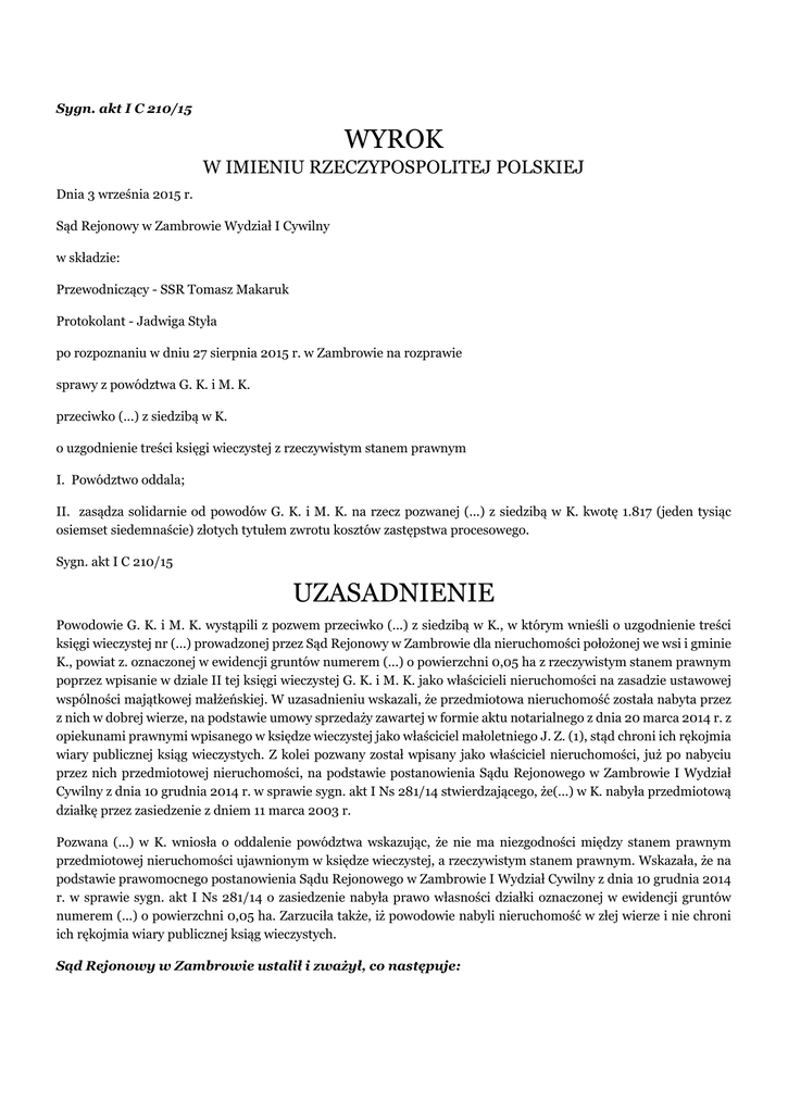 Sygn. akt I C 210/15 WYROK W IMIENIU RZECZYPOSPOLITEJ POLSKIEJ Dnia 3 września 2015 r. Sąd Rejonowy w Zambrowie Wydział I Cywilny w składzie: Przewodniczący - SSR Tomasz Makaruk Protokolant - Jadwiga Styła po rozpoznaniu w dniu 27 sierpnia 2015 r. w Zambrowie na rozprawie sprawy z powództwa G. K. i M. K. przeciwko (...) z siedzibą w K. o uzgodnienie treści księgi wieczystej z rzeczywistym stanem prawnym I. Powództwo oddala; II. zasądza solidarnie od powodów G. K. i M. K. na rzecz pozwanej (...) z siedzibą w K. kwotę 1.817 (jeden tysiąc osiemset siedemnaście) złotych tytułem zwrotu kosztów zastępstwa procesowego. Sygn. akt I C 210/15 UZASADNIENIE Powodowie G. K. i M. K. wystąpili z pozwem przeciwko (...) z siedzibą w K., w którym wnieśli o uzgodnienie treści księgi wieczystej nr (...) prowadzonej przez Sąd Rejonowy w Zambrowie dla nieruchomości położonej we wsi i gminie K., powiat z. oznaczonej w ewidencji gruntów numerem (...) o powierzchni 0,05 ha z rzeczywistym stanem prawnym poprzez wpisanie w dziale II tej księgi wieczystej G. K. i M. K. jako właścicieli nieruchomości na zasadzie ustawowej wspólności majątkowej małżeńskiej. W uzasadnieniu wskazali, że przedmiotowa nieruchomość została nabyta przez z nich w dobrej wierze, na podstawie umowy sprzedaży zawartej w formie aktu notarialnego z dnia 20 marca 2014 r. z opiekunami prawnymi wpisanego w księdze wieczystej jako właściciel małoletniego J. Z. (1), stąd chroni ich rękojmia wiary publicznej ksiąg wieczystych. Z kolei pozwany został wpisany jako właściciel nieruchomości, już po nabyciu przez nich przedmiotowej nieruchomości, na podstawie postanowienia Sądu Rejonowego w Zambrowie I Wydział Cywilny z dnia 10 grudnia 2014 r. w sprawie sygn. akt I Ns 281/14 stwierdzającego, że(...) w K. nabyła przedmiotową działkę przez zasiedzenie z dniem 11 marca 2003 r. Pozwana (...) w K. wniosła o oddalenie powództwa wskazując, że nie ma niezgodności między stanem prawnym przedmiotowej nieruchomości ujawnionym w księdze wieczystej, a rzeczywistym stanem prawnym. Wskazała, że na podstawie prawomocnego postanowienia Sądu Rejonowego w Zambrowie I Wydział Cywilny z dnia 10 grudnia 2014 r. w sprawie sygn. akt I Ns 281/14 o zasiedzenie nabyła prawo własności działki oznaczonej w ewidencji gruntów numerem (...) o powierzchni 0,05 ha. Zarzuciła także, iż powodowie nabyli nieruchomość w złej wierze i nie chroni ich rękojmia wiary publicznej ksiąg wieczystych. Sąd Rejonowy w Zambrowie ustalił i zważył, co następuje: Z dniem 10 marca 1973 r. (...) z siedzibą w K. weszła w samoistne posiadanie działki (...) o powierzchni 0,05 ha położonej w K., na której to działce i sąsiedniej działce nr (...) wybudowała sklep. Większa część sklepu (3/4 części) usytuowana jest na działce nr (...), ale fragment budynku o szerokości ok. 3,6 m i długości kilku metrów znajduje się na działce (...). (...) dokonał także ogrodzenia działek i wykorzystywał je na potrzeby prowadzonej działalności. Nigdy nie doszło jednak do zawarcia notarialnej umowy przeniesienia własności na rzecz (...). Postanowieniem Sądu Rejonowego w Zambrowie z dnia 14 kwietnia 1995 r. w sprawie I Ns 176/94 oddalono wniosek (...) w K. o zasiedzenie działki (...), z uwagi na to, iż wnioskodawczyni udowodniła jedynie okres 22 lat samoistnego posiadania przedmiotowej nieruchomości, a wymagany okres do nabycia własności przez zasiedzenie w złej wierze wynosi 30 lat. Aktem notarialnym – umową darowizny z dnia 9 grudnia 2002 r. W. Z., która była uczestniczką postępowania w sprawie I Ns 176/94, darowała swojemu czteroletniemu wnukowi J. Z. (1), reprezentowanemu przez rodziców P. Z. i K. Z., działkę gruntu oznaczoną nr (...), której własność nabyła na podstawie umowy przekazania własności gospodarstwa rolnego z dnia 9 sierpnia 1989 r. Jednocześnie przy zawarciu tego aktu oświadczyła, iż na przedmiotowej działce „zlokalizowany jest budynek murowany parterowy w udziale ¼ części, stanowiący nakład osoby trzeciej i przedmiotowa nieruchomość znajduje się w posiadaniu osoby trzeciej”. Na podstawie wniosku zawartego w tym akcie w Sądzie Rejonowym w Zambrowie w Wydziale Ksiąg Wieczystych z księgi wieczystej KW nr (...) została odłączona działka o numerze (...) i utworzona dla niej księga wieczysta o nr (...). W dziale II nowoutworzonej księgi jako właściciel został wpisany J. Z. (1), a do księgi został dołączony akt notarialny z 9.12.2002 r. Z kolei aktem notarialnym – umową sprzedaży z dnia 20 marca 2014 r. P. i K. małżonkowie Z., opiekunowie prawni wpisanego w księdze jako właściciel małoletniego J. Z. (1), sprzedali działkę o numerze (...) G. L. i M. małżonkom K.. Przy zawarciu tejże umowy oświadczyli, iż „na opisanej działce znajduje się budynek murowany parterowy w udziale ¼ części, stanowiący nakład pieniężny osoby trzeciej i budynek ten znajduje się posiadaniu tej osoby”. Około 20 lat wcześniej - w drugiej połowie lat 90-tych ubiegłego wieku (...) wydzierżawiła sklep oraz działki (...) E. C. i Z. C., którzy do tej pory prowadzą na nich swoją działalność gospodarczą – sklep wielobranżowy, a od kilku lat także działalność produkcyjną polegającą na wyrobie szafek elektrycznych. Sklep jest otwarty od poniedziałku do soboty w godzinach 8-17. Małżonkowie C. cały czas, aż do ubiegłego roku, płacili czynsz dzierżawny wyłącznie (...), z którym ustalali także możliwość postawienia garażu na działce (...). Po nabyciu przedmiotowej nieruchomości przez małżonków K., czynsz płacą również im. Dzierżawcy dwa lata temu wymienili także na nową bramę wjazdową, z której korzystają samochody dowożące im towary lub materiały produkcyjne. W tym samym mniej więcej czasie, w 1996 r. sąsiednią działkę oznaczoną numerem geodezyjnym (...), po dawnym (...)ze nabyli M. i G