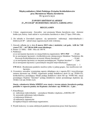 Międzyzakładowy Klub Polskiego Związku Krótkofalowców przy Burmistrzu Miasta Jarosławia Organizuje ZAWODY KRÓTKOFALARSKIE O „PUCHAR” BURMISTRZA MIASTA JAROSŁAWIA REGULAMIN 1. Celem organizowania Zawodów jest promocja Miasta Jarosławia oraz złożenie hołdu tym, którzy brali udział w wyzwoleniu Jarosławia w dniu 27 lipca 1944 roku. 2. Do udziału w Zawodach zaprasza się operatorów radiostacji indywidualnych i klubowych SP – udział stacji zagranicznych mile widziany . 3. Zawody odbędą się w dniu 8 marca 2015 roku ( niedziela ) od godz. 6.00 do 7.00 czasu UTC – od 7,00 do 8,00 czasu lokalnego. 4. Pasmo 3,5 MHz – SSB - Moc do 100 W. 5. Punktacja : a) za nawiązanie łączności ze stacją klubową organizatora SP 8 PEF - 20 pkt. b) za nawiązanie łączności z krótkofalowcem odznaczonym Medalem "Zasłużony dla Rozwoju Krótkofalarstwa na terenie Miasta Jarosławia" - 10 pkt. c) za nawiązanie łączności ze stacjami posiadającymi "Dyplom Jarosław" - 5 pkt. d) za nawiązanie łączności z pozostałymi stacjami indywidualnymi i klubowymi - 1 UWAGA : Rozdawanie punktów możliwe tylko w jednej grupie , bez możliwości ich łączenia . 6. Uczestnicy zawodów wymieniają raporty składające się z raportu RS i trzycyfrowego numeru łączności np. 59/002, organizator podaje dodatkowo skrót JA np. 59/001/JA, krótkofalowcy posiadający Medal podają dodatkowo skrót MJ np. 59/001/MJ, stacje posiadające Dyplom "Jarosław" podają dodatkowo numer posiadanego dyplomu np. 59/001/126 lub 59/001/A24. Stacje, członkowie Klubu SP8PEF oraz stacje z terenu miasta Jarosławia podają ponadto w raporcie punkty do Dyplomu :Jarosław: np. 59/001/JA - 2 pkt . 7. Klasyfikacja:. a) radiostacje indywidualne – posiadacze Medalu i dyplomu „JAROSŁAW” b) pozostałe radiostacje indywidualne . c) radiostacje Klubowe . d) radiostacje zagraniczne d) najaktywniejsza radiostacja organizatora . 8. Wynik końcowy: to suma zdobytych punktów pomnożona przez ilość łączności . - 2– 9. Nagrody: a) za zajęcie I-go miejsca w poszczególnych grupach – „PUCHAR” lub okolicznościowy „GRAWERTON” b) za zajęcie od I-go do IIIgo miejsca w każdej grupie - DYPLOM. 10. Wyniki ogłoszone zostaną w terminie 3-ch miesięcy od zakończenia zawodów i podane do wiadomości w środkach przekazu PZK a Puchary i Dyplomy wręczone zostaną na planowanym okolicznościowym spotkaniu lub wysłane bezpośrednio do uczestników zawodów. 11. Uczestnicy Zawodów proszeni są o przysłanie w terminie do dnia 14 marca 2015 r. czytelnego zestawienia przeprowadzonych łączności, które winno zawierać: adres pocztowy grupę klasyfikacyjną, wykaz stacji wraz z punktacją, datę i czas łączności raport nadany i odebrany. 12. Zestawienie należy przesłać na adres: Klub Łączności SP8PEF, 37-500 Jarosław, skr. pocztowa 127 lub pocztą elektroniczną E-mail: [email protected] . 13. Decyzje Komisji są ostateczne. 14. Komisja w składzie: Przewodniczący - SP 8 AUP Członkowie: - SP 8 IE - SP 8 IQQ Jeśli uczestnik zawodów spełni warunki Dyplomu "Jarosław" - otrzymuje dyplom bez potrzeby wysyłania zgłoszenia. Aby otrzymać dyplom wystarczy dokonać wpłaty na adres klubu w wysokości 10 zł a informację o dokonaniu wpłaty należy dołączyć do zestawienia z udziału w zawodach. VY - 73! Regulamin Dyplomu "JAROSŁAW" I. Dyplom jest bezterminowy. Łączności zalicza się od 1980-01-01. II. Do dyplomu zalicza się łączności lub nasłuchy z jarosławskimi krótkofalowcami indywidualnymi , oraz stacjami klubowymi i okolicznościowymi pracującymi z terenu miasta Jarosławia III. Pasma i emisje dowolne. IV. Punktacja: QSO na KF - 2 pkt. na UKF - 4 pkt. V. Koszt dyplomu 10 zł dla stacji SP i 5 IRC dla EU i DX. VI. Opłatę za Dyplom należy wnosić na adres Klubu SP 8 PEF VII Wymagania: Stacje SP - 10 pkt. ; EU – 5 pkt. ; DX – 3 pkt. VIII. Zgłoszenia potwierdzoneprzez Klub lub dwóch nadawców oraz wpłatę należy wysłać na adres: Klub Łączności SP 8 PEF, 37-500 Jarosław, skrytka pocztowa 127 z dopiskiem na kopercie i dowodzie wpłaty "Dyplom Jarosław" . Adresatów niniejszego Regulaminu prosimy o jego rozpropagowanie. Organizatorzy